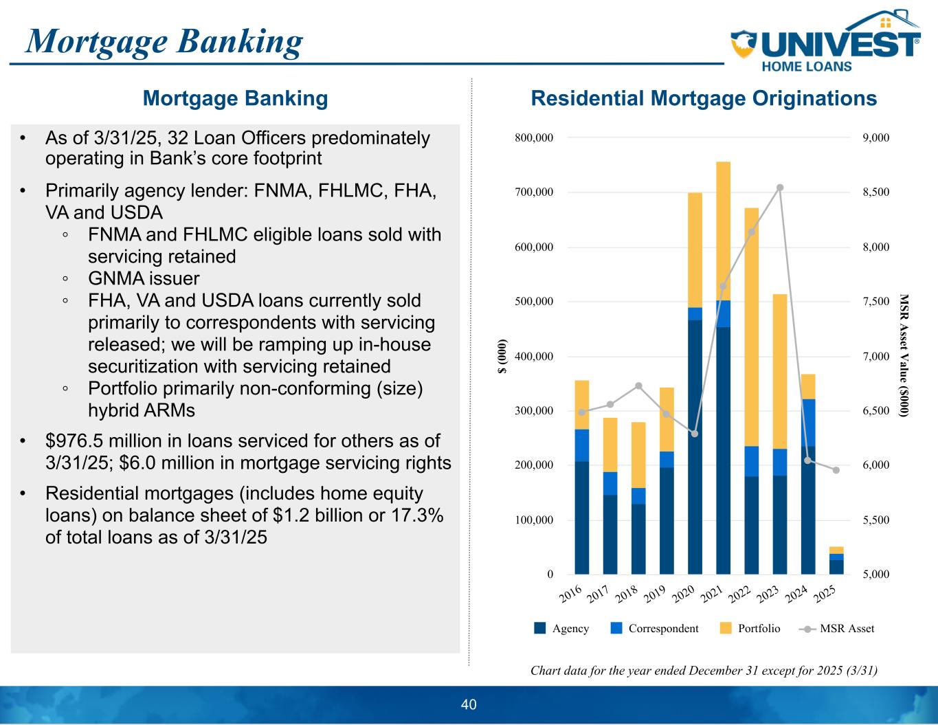 Mortgage Banking • As of 3/31/25, 32 Loan Officers predominately operating in Bank’s core footprint • Primarily agency lender: FNMA, FHLMC, FHA, VA and USDA ◦ FNMA and FHLMC eligible loans sold with servicing retained ◦ GNMA issuer ◦ FHA, VA and USDA loans currently sold primarily to correspondents with servicing released; we will be ramping up in-house securitization with servicing retained ◦ Portfolio primarily non-conforming (size) hybrid ARMs • $976.5 million in loans serviced for others as of 3/31/25; $6.0 million in mortgage servicing rights • Residential mortgages (includes home equity loans) on balance sheet of $1.2 billion or 17.3% of total loans as of 3/31/25 Chart data for the year ended December 31 except for 2025 (3/31) 40 $ (0 00 ) M SR A sset V alue ($000) Agency Correspondent Portfolio MSR Asset 2016 2017 2018 2019 2020 2021 2022 2023 2024 2025 0 100,000 200,000 300,000 400,000 500,000 600,000 700,000 800,000 5,000 5,500 6,000 6,500 7,000 7,500 8,000 8,500 9,000 Mortgage Banking Residential Mortgage Originations