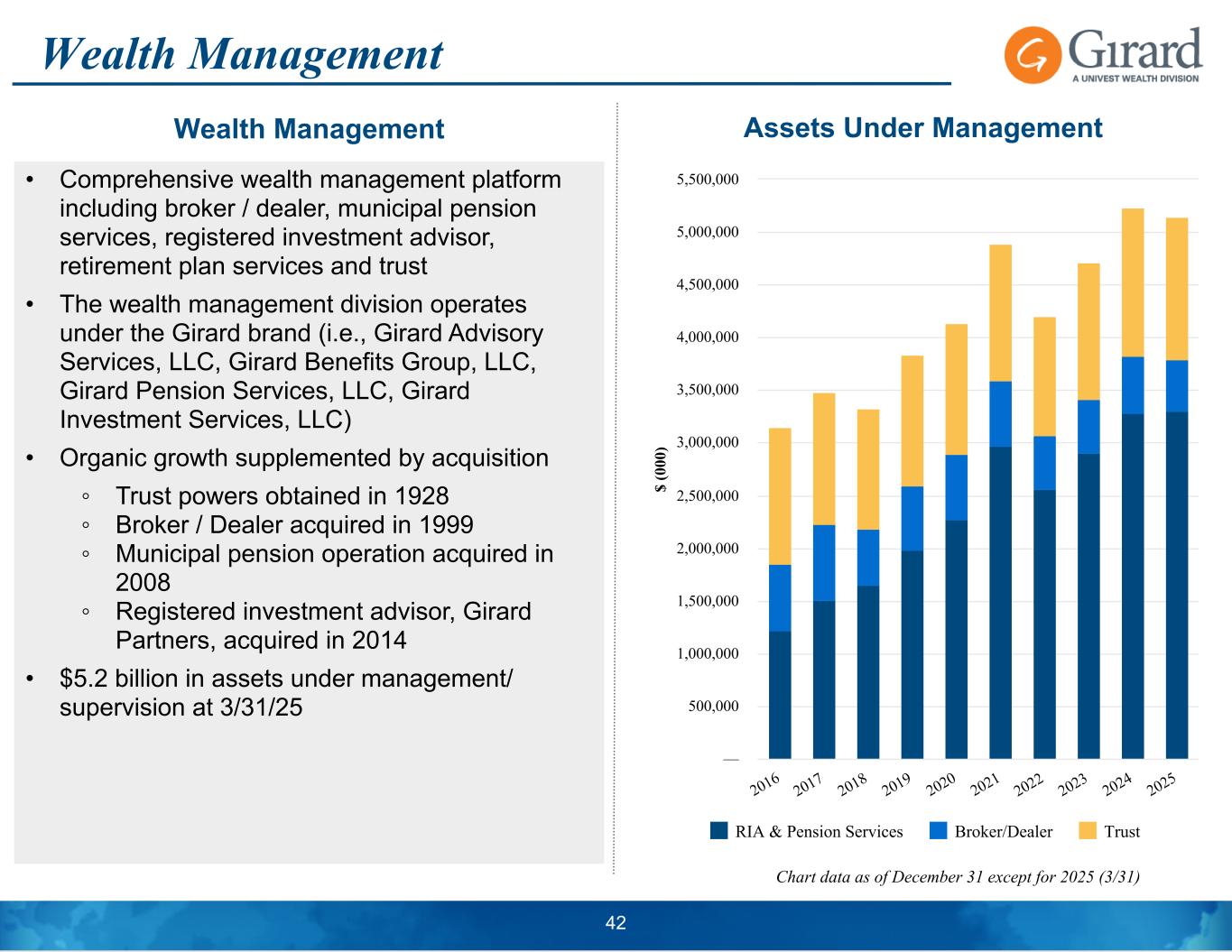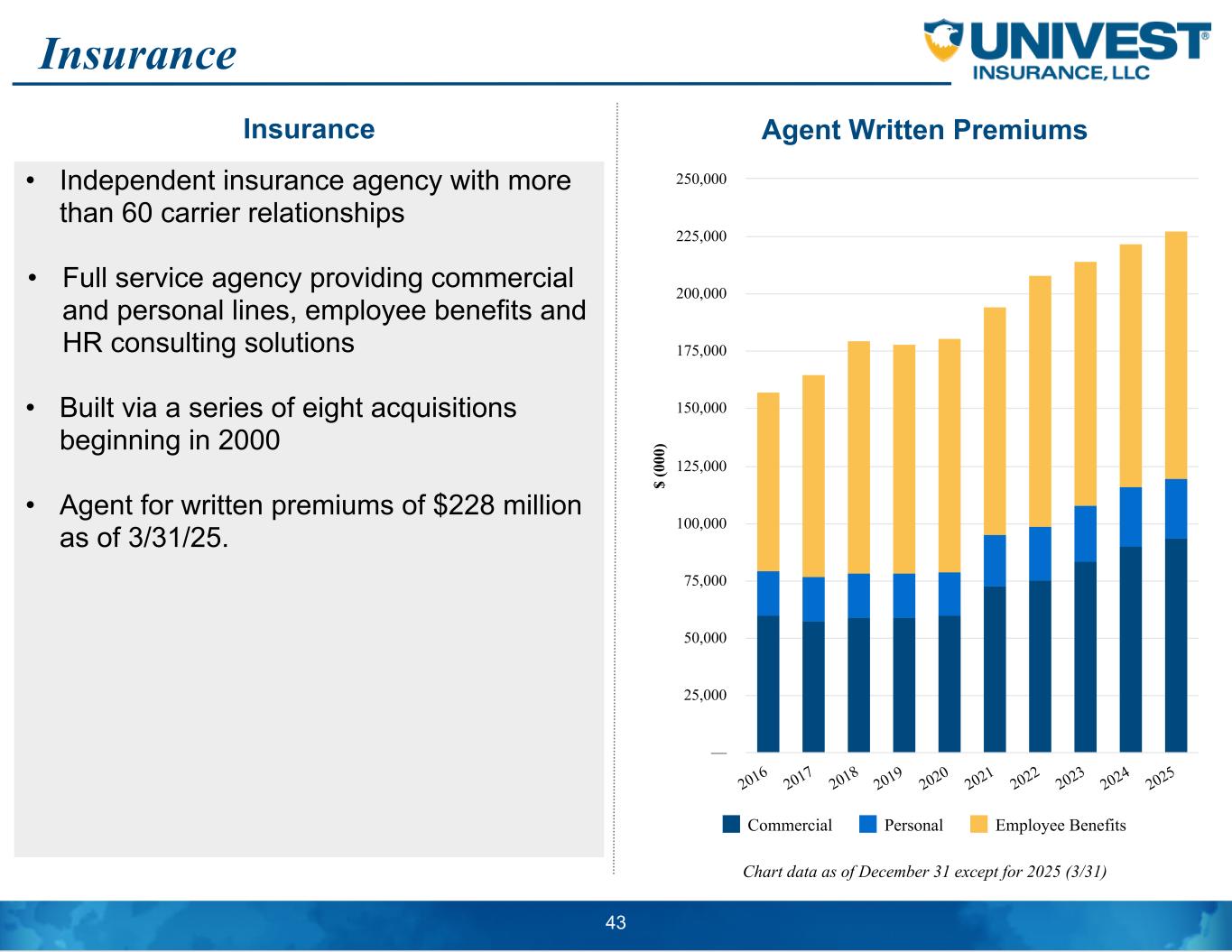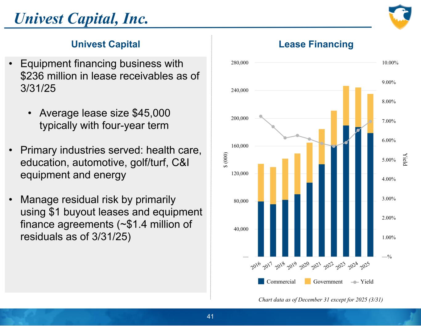 Univest Capital, Inc. • Equipment financing business with $236 million in lease receivables as of 3/31/25 • Average lease size $45,000 typically with four-year term • Primary industries served: health care, education, automotive, golf/turf, C&I equipment and energy • Manage residual risk by primarily using $1 buyout leases and equipment finance agreements (~$1.4 million of residuals as of 3/31/25) Chart data as of December 31 except for 2025 (3/31) 41 $ (0 00 ) Y ield Commercial Government Yield 2016 2017 2018 2019 2020 2021 2022 2023 2024 2025 — 40,000 80,000 120,000 160,000 200,000 240,000 280,000 —% 1.00% 2.00% 3.00% 4.00% 5.00% 6.00% 7.00% 8.00% 9.00% 10.00% Univest Capital Lease Financing