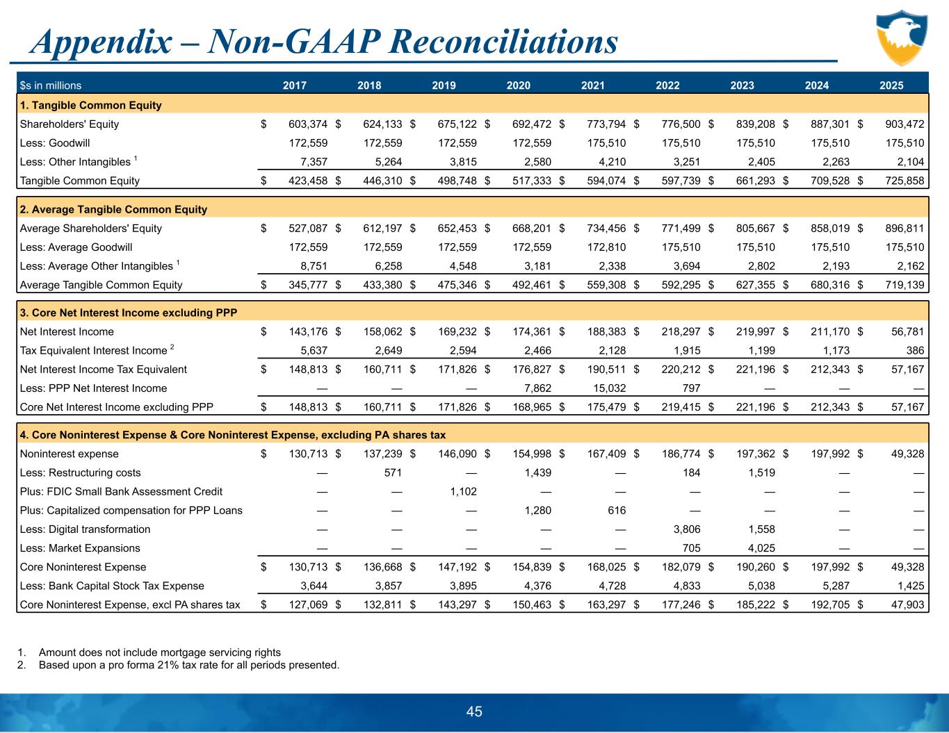 Appendix – Non-GAAP Reconciliations 1. Amount does not include mortgage servicing rights 2. Based upon a pro forma 21% tax rate for all periods presented. $s in millions 2017 2018 2019 2020 2021 2022 2023 2024 2025 1. Tangible Common Equity Shareholders' Equity $ 603,374 $ 624,133 $ 675,122 $ 692,472 $ 773,794 $ 776,500 $ 839,208 $ 887,301 $ 903,472 Less: Goodwill 172,559 172,559 172,559 172,559 175,510 175,510 175,510 175,510 175,510 Less: Other Intangibles 1 7,357 5,264 3,815 2,580 4,210 3,251 2,405 2,263 2,104 Tangible Common Equity $ 423,458 $ 446,310 $ 498,748 $ 517,333 $ 594,074 $ 597,739 $ 661,293 $ 709,528 $ 725,858 2. Average Tangible Common Equity Average Shareholders' Equity $ 527,087 $ 612,197 $ 652,453 $ 668,201 $ 734,456 $ 771,499 $ 805,667 $ 858,019 $ 896,811 Less: Average Goodwill 172,559 172,559 172,559 172,559 172,810 175,510 175,510 175,510 175,510 Less: Average Other Intangibles 1 8,751 6,258 4,548 3,181 2,338 3,694 2,802 2,193 2,162 Average Tangible Common Equity $ 345,777 $ 433,380 $ 475,346 $ 492,461 $ 559,308 $ 592,295 $ 627,355 $ 680,316 $ 719,139 3. Core Net Interest Income excluding PPP Net Interest Income $ 143,176 $ 158,062 $ 169,232 $ 174,361 $ 188,383 $ 218,297 $ 219,997 $ 211,170 $ 56,781 Tax Equivalent Interest Income 2 5,637 2,649 2,594 2,466 2,128 1,915 1,199 1,173 386 Net Interest Income Tax Equivalent $ 148,813 $ 160,711 $ 171,826 $ 176,827 $ 190,511 $ 220,212 $ 221,196 $ 212,343 $ 57,167 Less: PPP Net Interest Income — — — 7,862 15,032 797 — — — Core Net Interest Income excluding PPP $ 148,813 $ 160,711 $ 171,826 $ 168,965 $ 175,479 $ 219,415 $ 221,196 $ 212,343 $ 57,167 4. Core Noninterest Expense & Core Noninterest Expense, excluding PA shares tax Noninterest expense $ 130,713 $ 137,239 $ 146,090 $ 154,998 $ 167,409 $ 186,774 $ 197,362 $ 197,992 $ 49,328 Less: Restructuring costs — 571 — 1,439 — 184 1,519 — — Plus: FDIC Small Bank Assessment Credit — — 1,102 — — — — — — Plus: Capitalized compensation for PPP Loans — — — 1,280 616 — — — — Less: Digital transformation — — — — — 3,806 1,558 — — Less: Market Expansions — — — — — 705 4,025 — — Core Noninterest Expense $ 130,713 $ 136,668 $ 147,192 $ 154,839 $ 168,025 $ 182,079 $ 190,260 $ 197,992 $ 49,328 Less: Bank Capital Stock Tax Expense 3,644 3,857 3,895 4,376 4,728 4,833 5,038 5,287 1,425 Core Noninterest Expense, excl PA shares tax $ 127,069 $ 132,811 $ 143,297 $ 150,463 $ 163,297 $ 177,246 $ 185,222 $ 192,705 $ 47,903 45