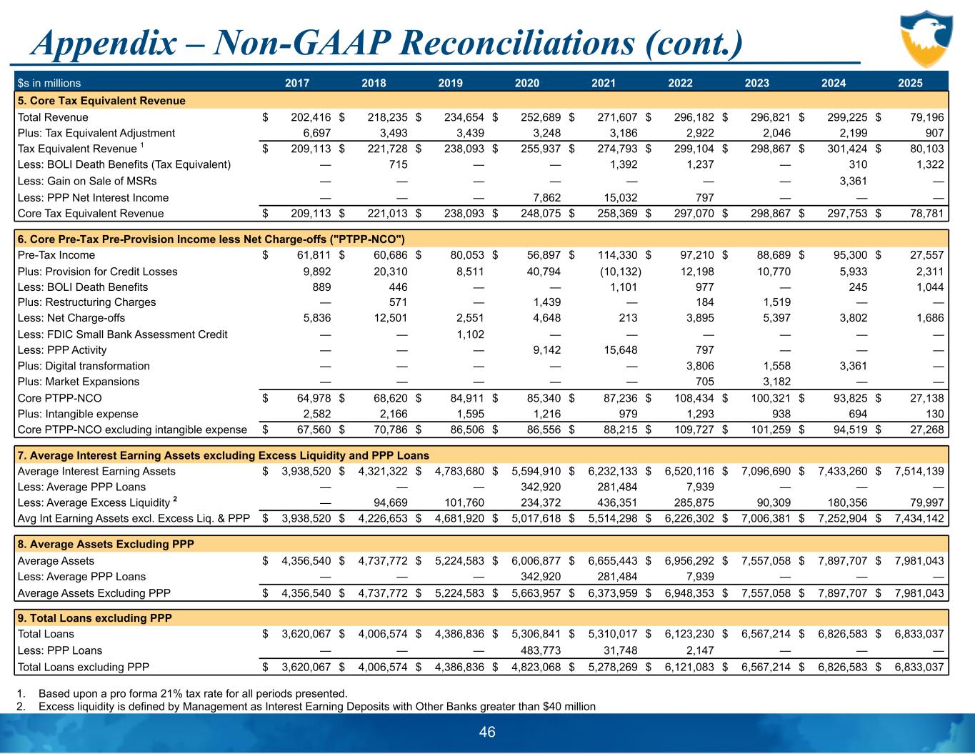 Appendix – Non-GAAP Reconciliations (cont.) 1. Based upon a pro forma 21% tax rate for all periods presented. 2. Excess liquidity is defined by Management as Interest Earning Deposits with Other Banks greater than $40 million 46 $s in millions 2017 2018 2019 2020 2021 2022 2023 2024 2025 5. Core Tax Equivalent Revenue Total Revenue $ 202,416 $ 218,235 $ 234,654 $ 252,689 $ 271,607 $ 296,182 $ 296,821 $ 299,225 $ 79,196 Plus: Tax Equivalent Adjustment 6,697 3,493 3,439 3,248 3,186 2,922 2,046 2,199 907 Tax Equivalent Revenue 1 $ 209,113 $ 221,728 $ 238,093 $ 255,937 $ 274,793 $ 299,104 $ 298,867 $ 301,424 $ 80,103 Less: BOLI Death Benefits (Tax Equivalent) — 715 — — 1,392 1,237 — 310 1,322 Less: Gain on Sale of MSRs — — — — — — — 3,361 — Less: PPP Net Interest Income — — — 7,862 15,032 797 — — — Core Tax Equivalent Revenue $ 209,113 $ 221,013 $ 238,093 $ 248,075 $ 258,369 $ 297,070 $ 298,867 $ 297,753 $ 78,781 6. Core Pre-Tax Pre-Provision Income less Net Charge-offs ("PTPP-NCO") Pre-Tax Income $ 61,811 $ 60,686 $ 80,053 $ 56,897 $ 114,330 $ 97,210 $ 88,689 $ 95,300 $ 27,557 Plus: Provision for Credit Losses 9,892 20,310 8,511 40,794 (10,132) 12,198 10,770 5,933 2,311 Less: BOLI Death Benefits 889 446 — — 1,101 977 — 245 1,044 Plus: Restructuring Charges — 571 — 1,439 — 184 1,519 — — Less: Net Charge-offs 5,836 12,501 2,551 4,648 213 3,895 5,397 3,802 1,686 Less: FDIC Small Bank Assessment Credit — — 1,102 — — — — — — Less: PPP Activity — — — 9,142 15,648 797 — — — Plus: Digital transformation — — — — — 3,806 1,558 3,361 — Plus: Market Expansions — — — — — 705 3,182 — — Core PTPP-NCO $ 64,978 $ 68,620 $ 84,911 $ 85,340 $ 87,236 $ 108,434 $ 100,321 $ 93,825 $ 27,138 Plus: Intangible expense 2,582 2,166 1,595 1,216 979 1,293 938 694 130 Core PTPP-NCO excluding intangible expense $ 67,560 $ 70,786 $ 86,506 $ 86,556 $ 88,215 $ 109,727 $ 101,259 $ 94,519 $ 27,268 7. Average Interest Earning Assets excluding Excess Liquidity and PPP Loans Average Interest Earning Assets $ 3,938,520 $ 4,321,322 $ 4,783,680 $ 5,594,910 $ 6,232,133 $ 6,520,116 $ 7,096,690 $ 7,433,260 $ 7,514,139 Less: Average PPP Loans — — — 342,920 281,484 7,939 — — — Less: Average Excess Liquidity 2 — 94,669 101,760 234,372 436,351 285,875 90,309 180,356 79,997 Avg Int Earning Assets excl. Excess Liq. & PPP $ 3,938,520 $ 4,226,653 $ 4,681,920 $ 5,017,618 $ 5,514,298 $ 6,226,302 $ 7,006,381 $ 7,252,904 $ 7,434,142 8. Average Assets Excluding PPP Average Assets $ 4,356,540 $ 4,737,772 $ 5,224,583 $ 6,006,877 $ 6,655,443 $ 6,956,292 $ 7,557,058 $ 7,897,707 $ 7,981,043 Less: Average PPP Loans — — — 342,920 281,484 7,939 — — — Average Assets Excluding PPP $ 4,356,540 $ 4,737,772 $ 5,224,583 $ 5,663,957 $ 6,373,959 $ 6,948,353 $ 7,557,058 $ 7,897,707 $ 7,981,043 9. Total Loans excluding PPP Total Loans $ 3,620,067 $ 4,006,574 $ 4,386,836 $ 5,306,841 $ 5,310,017 $ 6,123,230 $ 6,567,214 $ 6,826,583 $ 6,833,037 Less: PPP Loans — — — 483,773 31,748 2,147 — — — Total Loans excluding PPP $ 3,620,067 $ 4,006,574 $ 4,386,836 $ 4,823,068 $ 5,278,269 $ 6,121,083 $ 6,567,214 $ 6,826,583 $ 6,833,037