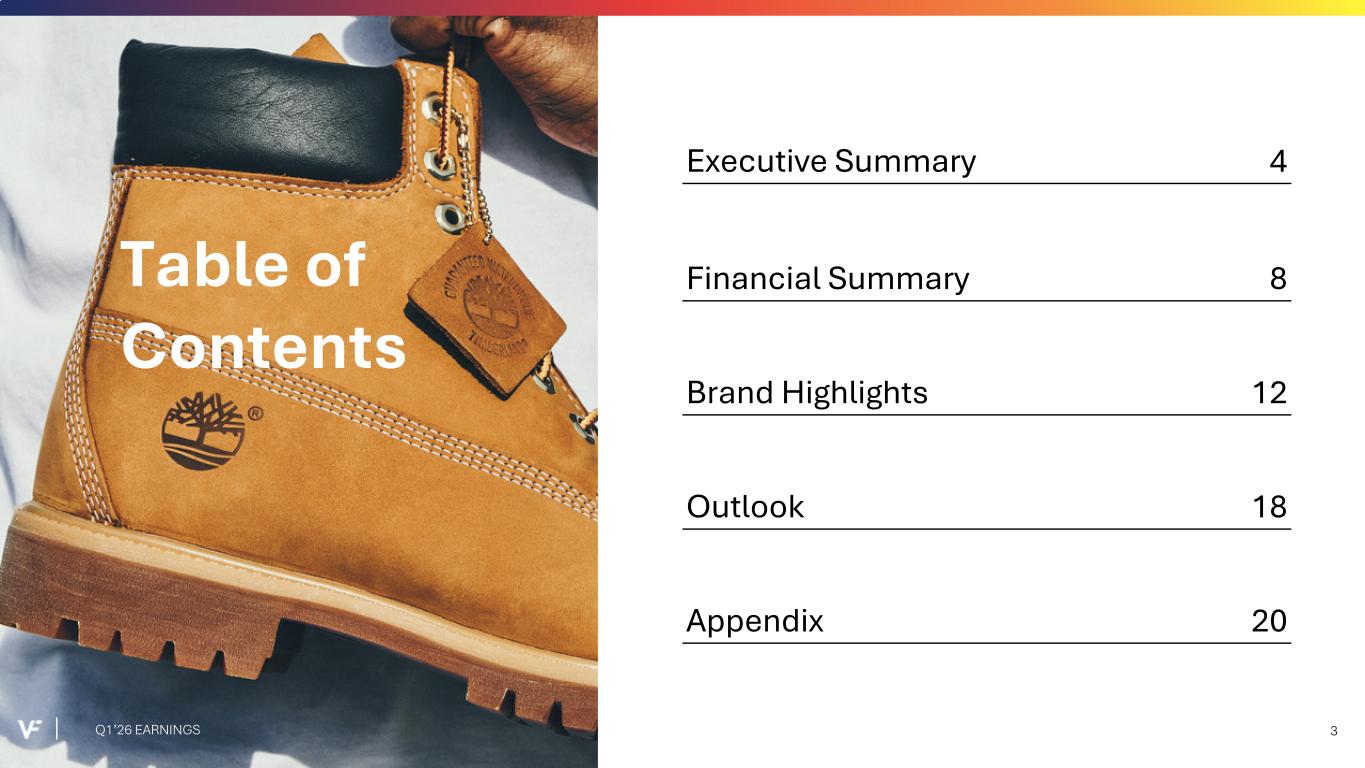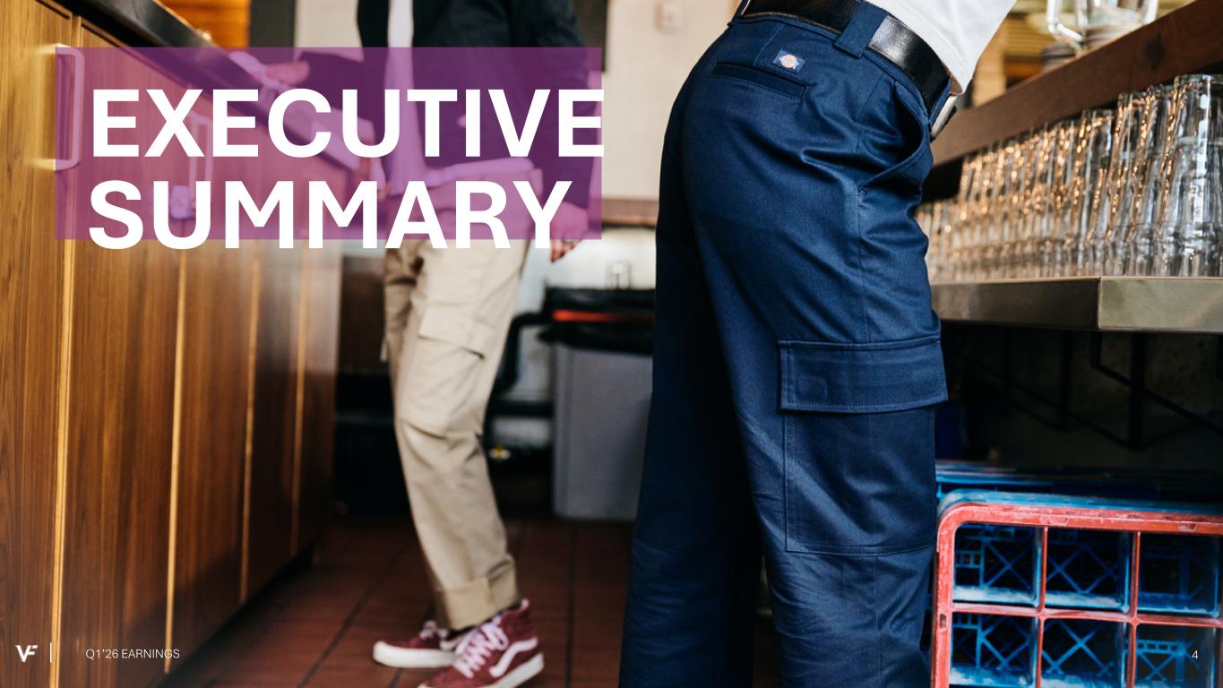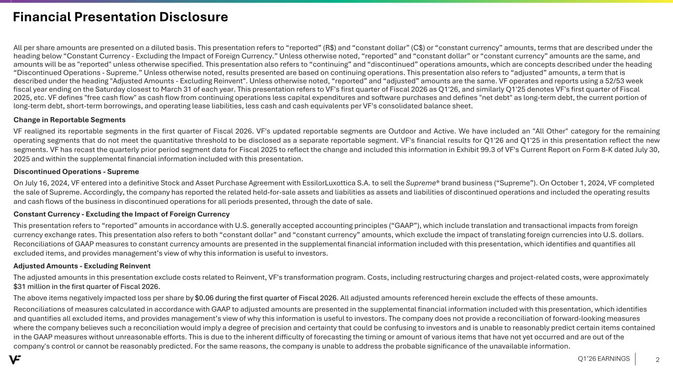 Financial Presentation Disclosure All per share amounts are presented on a diluted basis. This presentation refers to “reported” (R$) and “constant dollar” (C$) or “constant currency” amounts, terms that are described under the heading below “Constant Currency - Excluding the Impact of Foreign Currency.” Unless otherwise noted, “reported” and “constant dollar” or “constant currency” amounts are the same, and amounts will be as "reported" unless otherwise specified. This presentation also refers to “continuing” and “discontinued” operations amounts, which are concepts described under the heading “Discontinued Operations - Supreme.” Unless otherwise noted, results presented are based on continuing operations. This presentation also refers to “adjusted” amounts, a term that is described under the heading "Adjusted Amounts - Excluding Reinvent". Unless otherwise noted, “reported” and “adjusted” amounts are the same. VF operates and reports using a 52/53 week fiscal year ending on the Saturday closest to March 31 of each year. This presentation refers to VF's first quarter of Fiscal 2026 as Q1'26, and similarly Q1'25 denotes VF's first quarter of Fiscal 2025, etc. VF defines "free cash flow" as cash flow from continuing operations less capital expenditures and software purchases and defines "net debt" as long-term debt, the current portion of long-term debt, short-term borrowings, and operating lease liabilities, less cash and cash equivalents per VF's consolidated balance sheet. Change in Reportable Segments VF realigned its reportable segments in the first quarter of Fiscal 2026. VF's updated reportable segments are Outdoor and Active. We have included an "All Other" category for the remaining operating segments that do not meet the quantitative threshold to be disclosed as a separate reportable segment. VF's financial results for Q1'26 and Q1'25 in this presentation reflect the new segments. VF has recast the quarterly prior period segment data for Fiscal 2025 to reflect the change and included this information in .3 of VF's Current Report on Form 8-K dated July 30, 2025 and within the supplemental financial information included with this presentation. Discontinued Operations - Supreme On July 16, 2024, VF entered into a definitive Stock and Asset Purchase Agreement with EssilorLuxottica S.A. to sell the Supreme® brand business (“Supreme”). On October 1, 2024, VF completed the sale of Supreme. Accordingly, the company has reported the related held-for-sale assets and liabilities as assets and liabilities of discontinued operations and included the operating results and cash flows of the business in discontinued operations for all periods presented, through the date of sale. Constant Currency - Excluding the Impact of Foreign Currency This presentation refers to “reported” amounts in accordance with U.S. generally accepted accounting principles (“GAAP”), which include translation and transactional impacts from foreign currency exchange rates. This presentation also refers to both “constant dollar” and “constant currency” amounts, which exclude the impact of translating foreign currencies into U.S. dollars. Reconciliations of GAAP measures to constant currency amounts are presented in the supplemental financial information included with this presentation, which identifies and quantifies all excluded items, and provides management’s view of why this information is useful to investors. Adjusted Amounts - Excluding Reinvent The adjusted amounts in this presentation exclude costs related to Reinvent, VF's transformation program. Costs, including restructuring charges and project-related costs, were approximately $31 million in the first quarter of Fiscal 2026. The above items negatively impacted loss per share by $0.06 during the first quarter of Fiscal 2026. All adjusted amounts referenced herein exclude the effects of these amounts. Reconciliations of measures calculated in accordance with GAAP to adjusted amounts are presented in the supplemental financial information included with this presentation, which identifies and quantifies all excluded items, and provides management’s view of why this information is useful to investors. The company does not provide a reconciliation of forward-looking measures where the company believes such a reconciliation would imply a degree of precision and certainty that could be confusing to investors and is unable to reasonably predict certain items contained in the GAAP measures without unreasonable efforts. This is due to the inherent difficulty of forecasting the timing or amount of various items that have not yet occurred and are out of the company's control or cannot be reasonably predicted. For the same reasons, the company is unable to address the probable significance of the unavailable information. Q1’26 EARNINGS 2