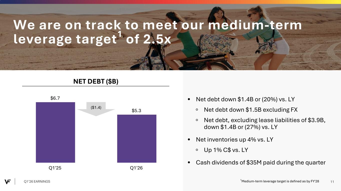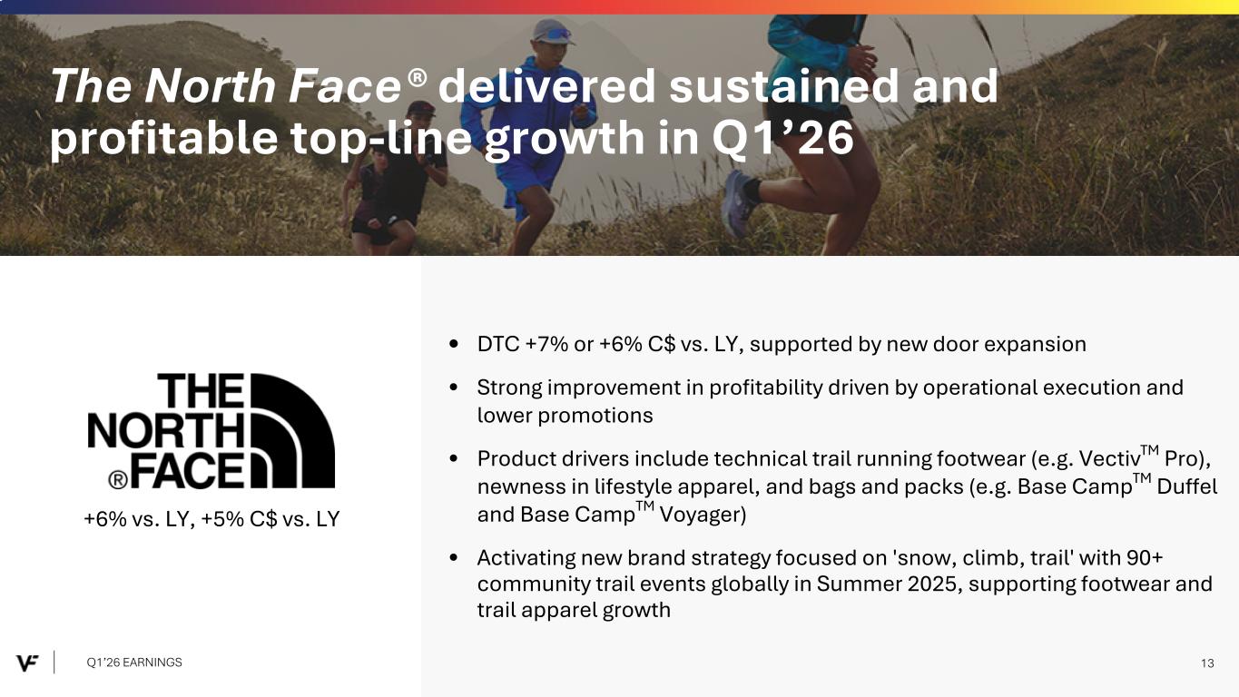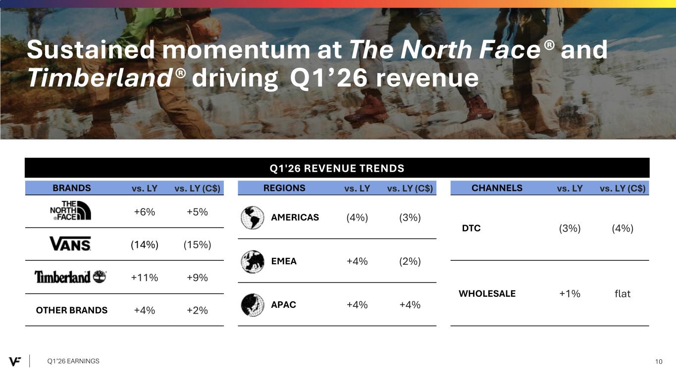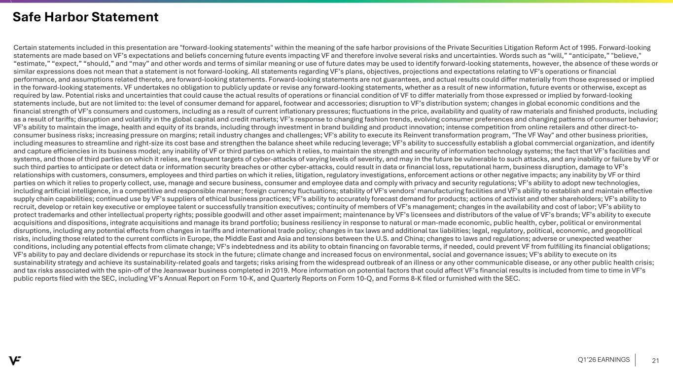Financial Presentation Disclosure All per share amounts are presented on a diluted basis. This presentation refers to “reported” (R$) and “constant dollar” (C$) or “constant currency” amounts, terms that are described under the heading below “Constant Currency - Excluding the Impact of Foreign Currency.” Unless otherwise noted, “reported” and “constant dollar” or “constant currency” amounts are the same, and amounts will be as "reported" unless otherwise specified. This presentation also refers to “continuing” and “discontinued” operations amounts, which are concepts described under the heading “Discontinued Operations - Supreme.” Unless otherwise noted, results presented are based on continuing operations. This presentation also refers to “adjusted” amounts, a term that is described under the heading "Adjusted Amounts - Excluding Reinvent". Unless otherwise noted, “reported” and “adjusted” amounts are the same. VF operates and reports using a 52/53 week fiscal year ending on the Saturday closest to March 31 of each year. This presentation refers to VF's first quarter of Fiscal 2026 as Q1'26, and similarly Q1'25 denotes VF's first quarter of Fiscal 2025, etc. VF defines "free cash flow" as cash flow from continuing operations less capital expenditures and software purchases and defines "net debt" as long-term debt, the current portion of long-term debt, short-term borrowings, and operating lease liabilities, less cash and cash equivalents per VF's consolidated balance sheet. Change in Reportable Segments VF realigned its reportable segments in the first quarter of Fiscal 2026. VF's updated reportable segments are Outdoor and Active. We have included an "All Other" category for the remaining operating segments that do not meet the quantitative threshold to be disclosed as a separate reportable segment. VF's financial results for Q1'26 and Q1'25 in this presentation reflect the new segments. VF has recast the quarterly prior period segment data for Fiscal 2025 to reflect the change and included this information in .3 of VF's Current Report on Form 8-K dated July 30, 2025 and within the supplemental financial information included with this presentation. Discontinued Operations - Supreme On July 16, 2024, VF entered into a definitive Stock and Asset Purchase Agreement with EssilorLuxottica S.A. to sell the Supreme® brand business (“Supreme”). On October 1, 2024, VF completed the sale of Supreme. Accordingly, the company has reported the related held-for-sale assets and liabilities as assets and liabilities of discontinued operations and included the operating results and cash flows of the business in discontinued operations for all periods presented, through the date of sale. Constant Currency - Excluding the Impact of Foreign Currency This presentation refers to “reported” amounts in accordance with U.S. generally accepted accounting principles (“GAAP”), which include translation and transactional impacts from foreign currency exchange rates. This presentation also refers to both “constant dollar” and “constant currency” amounts, which exclude the impact of translating foreign currencies into U.S. dollars. Reconciliations of GAAP measures to constant currency amounts are presented in the supplemental financial information included with this presentation, which identifies and quantifies all excluded items, and provides management’s view of why this information is useful to investors. Adjusted Amounts - Excluding Reinvent The adjusted amounts in this presentation exclude costs related to Reinvent, VF's transformation program. Costs, including restructuring charges and project-related costs, were approximately $31 million in the first quarter of Fiscal 2026. The above items negatively impacted loss per share by $0.06 during the first quarter of Fiscal 2026. All adjusted amounts referenced herein exclude the effects of these amounts. Reconciliations of measures calculated in accordance with GAAP to adjusted amounts are presented in the supplemental financial information included with this presentation, which identifies and quantifies all excluded items, and provides management’s view of why this information is useful to investors. The company does not provide a reconciliation of forward-looking measures where the company believes such a reconciliation would imply a degree of precision and certainty that could be confusing to investors and is unable to reasonably predict certain items contained in the GAAP measures without unreasonable efforts. This is due to the inherent difficulty of forecasting the timing or amount of various items that have not yet occurred and are out of the company's control or cannot be reasonably predicted. For the same reasons, the company is unable to address the probable significance of the unavailable information. Q1’26 EARNINGS 2
