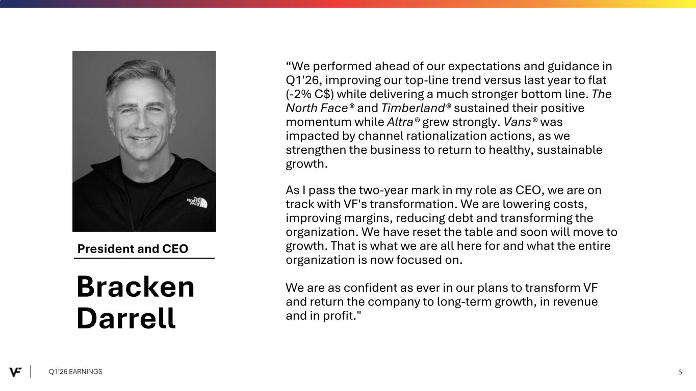 President and CEO “We performed ahead of our expectations and guidance in Q1'26, improving our top-line trend versus last year to flat (-2% C$) while delivering a much stronger bottom line. The North Face® and Timberland® sustained their positive momentum while Altra® grew strongly. Vans® was impacted by channel rationalization actions, as we strengthen the business to return to healthy, sustainable growth. As I pass the two-year mark in my role as CEO, we are on track with VF's transformation. We are lowering costs, improving margins, reducing debt and transforming the organization. We have reset the table and soon will move to growth. That is what we are all here for and what the entire organization is now focused on. We are as confident as ever in our plans to transform VF and return the company to long-term growth, in revenue and in profit." Q1’26 EARNINGS 5 Bracken Darrell