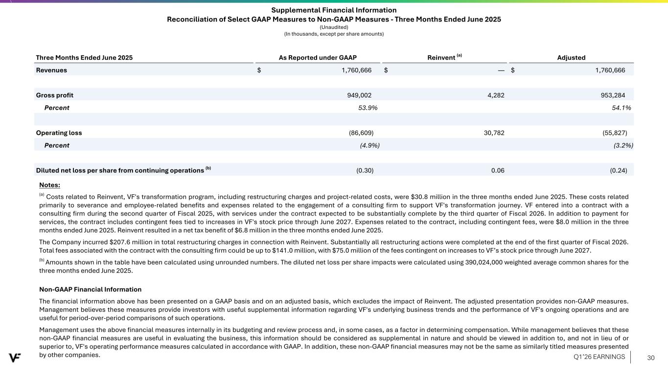 Supplemental Financial Information Reconciliation of Select GAAP Measures to Non-GAAP Measures - Three Months Ended June 2025 (Unaudited) (In thousands, except per share amounts) Three Months Ended June 2025 As Reported under GAAP Reinvent (a) Adjusted Revenues $ 1,760,666 $ — $ 1,760,666 Gross profit 949,002 4,282 953,284 Percent 53.9% 54.1% Operating loss (86,609) 30,782 (55,827) Percent (4.9%) (3.2%) Diluted net loss per share from continuing operations (b) (0.30) 0.06 (0.24) Notes: (a) Costs related to Reinvent, VF's transformation program, including restructuring charges and project-related costs, were $30.8 million in the three months ended June 2025. These costs related primarily to severance and employee-related benefits and expenses related to the engagement of a consulting firm to support VF's transformation journey. VF entered into a contract with a consulting firm during the second quarter of Fiscal 2025, with services under the contract expected to be substantially complete by the third quarter of Fiscal 2026. In addition to payment for services, the contract includes contingent fees tied to increases in VF's stock price through June 2027. Expenses related to the contract, including contingent fees, were $8.0 million in the three months ended June 2025. Reinvent resulted in a net tax benefit of $6.8 million in the three months ended June 2025. The Company incurred $207.6 million in total restructuring charges in connection with Reinvent. Substantially all restructuring actions were completed at the end of the first quarter of Fiscal 2026. Total fees associated with the contract with the consulting firm could be up to $141.0 million, with $75.0 million of the fees contingent on increases to VF’s stock price through June 2027. (b) Amounts shown in the table have been calculated using unrounded numbers. The diluted net loss per share impacts were calculated using 390,024,000 weighted average common shares for the three months ended June 2025. Non-GAAP Financial Information The financial information above has been presented on a GAAP basis and on an adjusted basis, which excludes the impact of Reinvent. The adjusted presentation provides non-GAAP measures. Management believes these measures provide investors with useful supplemental information regarding VF's underlying business trends and the performance of VF's ongoing operations and are useful for period-over-period comparisons of such operations. Management uses the above financial measures internally in its budgeting and review process and, in some cases, as a factor in determining compensation. While management believes that these non-GAAP financial measures are useful in evaluating the business, this information should be considered as supplemental in nature and should be viewed in addition to, and not in lieu of or superior to, VF's operating performance measures calculated in accordance with GAAP. In addition, these non-GAAP financial measures may not be the same as similarly titled measures presented by other companies. Q1’26 EARNINGS 30