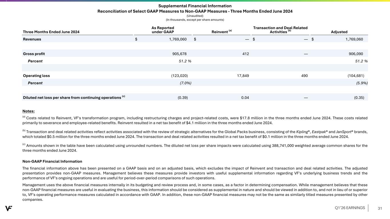 Three Months Ended June 2024 As Reported under GAAP Reinvent (a) Transaction and Deal Related Activities (b) Adjusted Revenues $ 1,769,060 $ — $ — $ 1,769,060 Gross profit 905,678 412 — 906,090 Percent 51.2 % 51.2 % Operating loss (123,020) 17,849 490 (104,681) Percent (7.0%) (5.9%) Diluted net loss per share from continuing operations (c) (0.39) 0.04 — (0.35) Supplemental Financial Information Reconciliation of Select GAAP Measures to Non-GAAP Measures - Three Months Ended June 2024 (Unaudited) (In thousands, except per share amounts) Notes: (a) Costs related to Reinvent, VF's transformation program, including restructuring charges and project-related costs, were $17.8 million in the three months ended June 2024. These costs related primarily to severance and employee-related benefits. Reinvent resulted in a net tax benefit of $4.1 million in the three months ended June 2024. (b) Transaction and deal related activities reflect activities associated with the review of strategic alternatives for the Global Packs business, consisting of the Kipling®, Eastpak® and JanSport® brands, which totaled $0.5 million for the three months ended June 2024. The transaction and deal related activities resulted in a net tax benefit of $0.1 million in the three months ended June 2024. (c) Amounts shown in the table have been calculated using unrounded numbers. The diluted net loss per share impacts were calculated using 388,741,000 weighted average common shares for the three months ended June 2024. Non-GAAP Financial Information The financial information above has been presented on a GAAP basis and on an adjusted basis, which excludes the impact of Reinvent and transaction and deal related activities. The adjusted presentation provides non-GAAP measures. Management believes these measures provide investors with useful supplemental information regarding VF's underlying business trends and the performance of VF's ongoing operations and are useful for period-over-period comparisons of such operations. Management uses the above financial measures internally in its budgeting and review process and, in some cases, as a factor in determining compensation. While management believes that these non-GAAP financial measures are useful in evaluating the business, this information should be considered as supplemental in nature and should be viewed in addition to, and not in lieu of or superior to, VF's operating performance measures calculated in accordance with GAAP. In addition, these non-GAAP financial measures may not be the same as similarly titled measures presented by other companies. Q1’26 EARNINGS 31