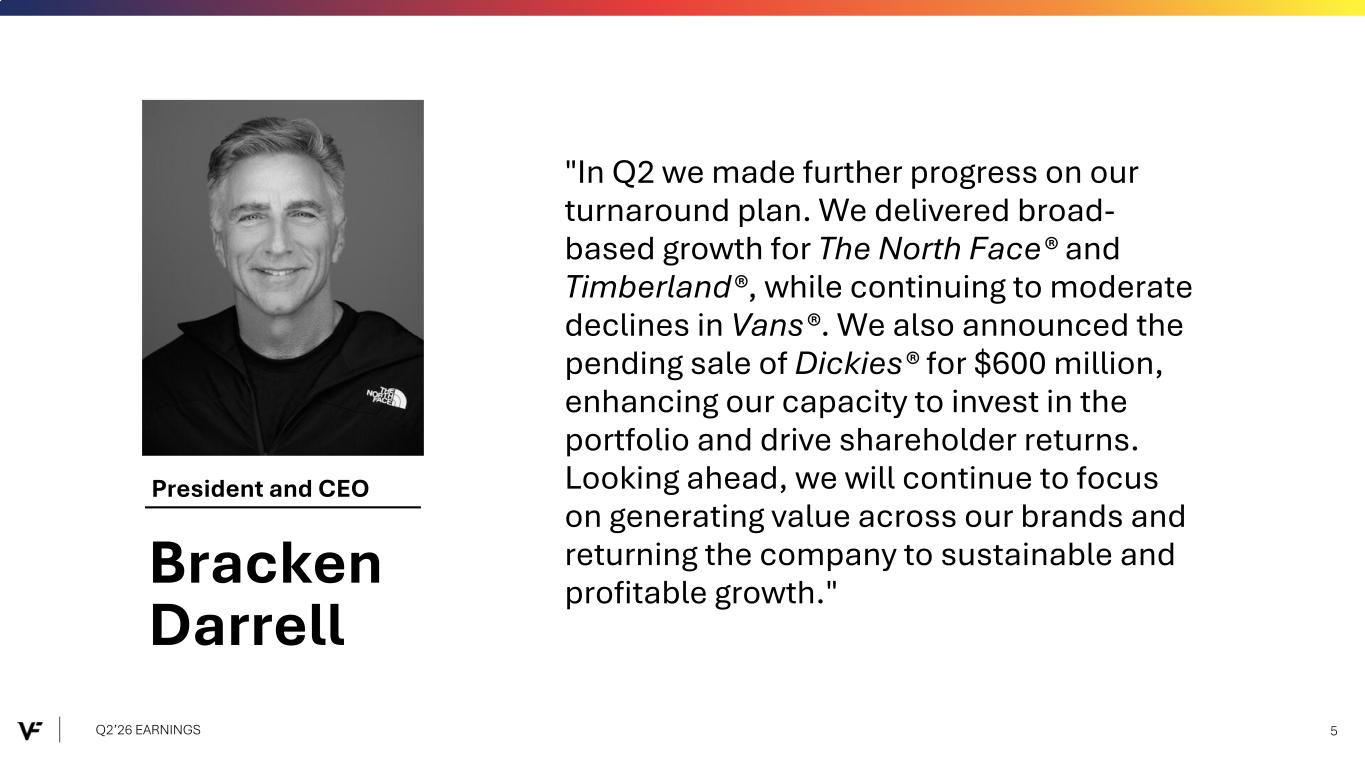 President and CEO "In Q2 we made further progress on our turnaround plan. We delivered broad- based growth for The North Face® and Timberland®, while continuing to moderate declines in Vans®. We also announced the pending sale of Dickies® for $600 million, enhancing our capacity to invest in the portfolio and drive shareholder returns. Looking ahead, we will continue to focus on generating value across our brands and returning the company to sustainable and profitable growth." Q2’26 EARNINGS 5 Bracken Darrell