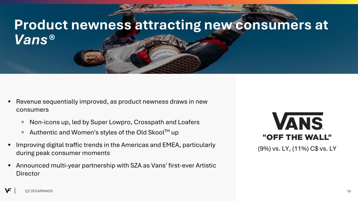 • Revenue sequentially improved, as product newness draws in new consumers ◦ Non-icons up, led by Super Lowpro, Crosspath and Loafers ◦ Authentic and Women's styles of the Old SkoolTM up • Improving digital traffic trends in the Americas and EMEA, particularly during peak consumer moments • Announced multi-year partnership with SZA as Vans' first-ever Artistic Director Vans® Q2’26 performance above expectations, supported by strong back-to-school season Q2’26 EARNINGS 16 (9%) vs. LY, (11%) C$ vs. LY Product newness attracting new consumers at Vans®