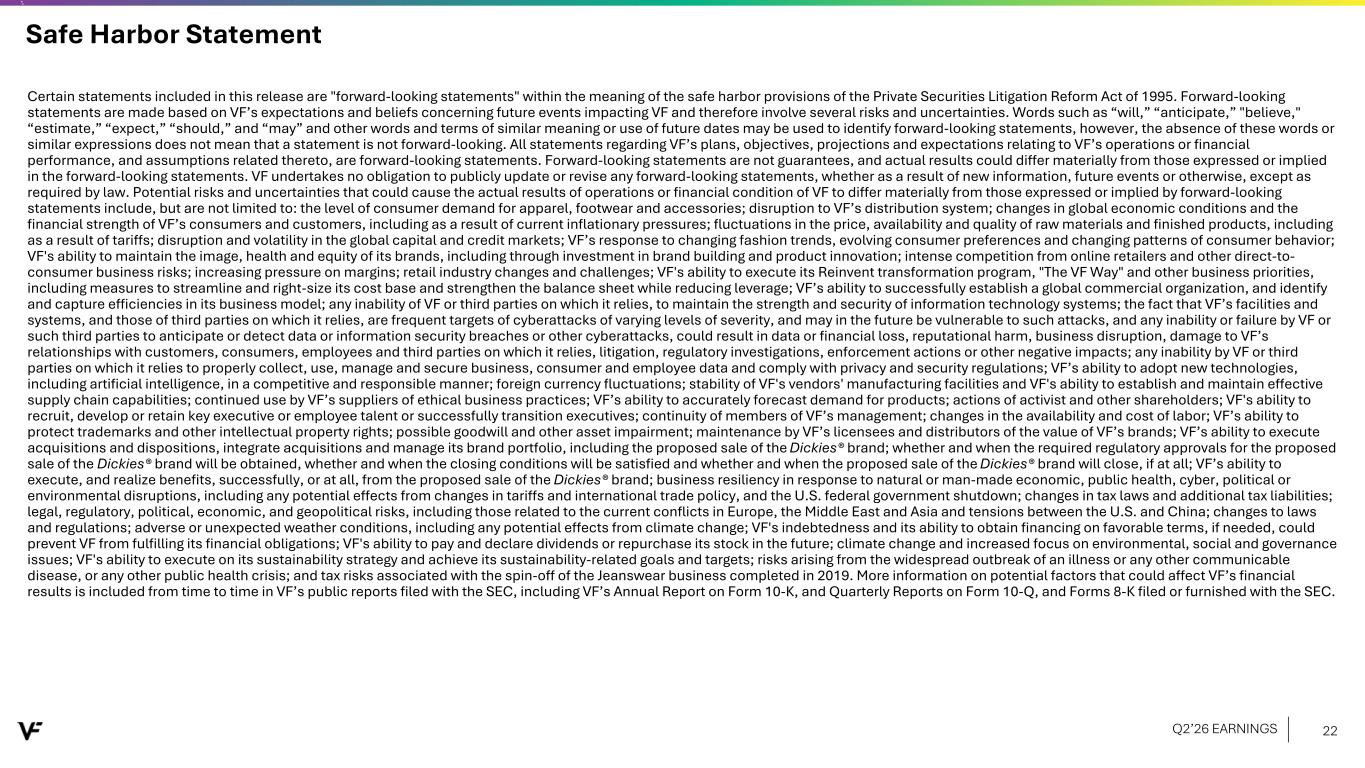 Safe Harbor Statement Certain statements included in this release are "forward-looking statements" within the meaning of the safe harbor provisions of the Private Securities Litigation Reform Act of 1995. Forward-looking statements are made based on VF’s expectations and beliefs concerning future events impacting VF and therefore involve several risks and uncertainties. Words such as “will,” “anticipate,” "believe," “estimate,” “expect,” “should,” and “may” and other words and terms of similar meaning or use of future dates may be used to identify forward-looking statements, however, the absence of these words or similar expressions does not mean that a statement is not forward-looking. All statements regarding VF’s plans, objectives, projections and expectations relating to VF’s operations or financial performance, and assumptions related thereto, are forward-looking statements. Forward-looking statements are not guarantees, and actual results could differ materially from those expressed or implied in the forward-looking statements. VF undertakes no obligation to publicly update or revise any forward-looking statements, whether as a result of new information, future events or otherwise, except as required by law. Potential risks and uncertainties that could cause the actual results of operations or financial condition of VF to differ materially from those expressed or implied by forward-looking statements include, but are not limited to: the level of consumer demand for apparel, footwear and accessories; disruption to VF’s distribution system; changes in global economic conditions and the financial strength of VF’s consumers and customers, including as a result of current inflationary pressures; fluctuations in the price, availability and quality of raw materials and finished products, including as a result of tariffs; disruption and volatility in the global capital and credit markets; VF’s response to changing fashion trends, evolving consumer preferences and changing patterns of consumer behavior; VF's ability to maintain the image, health and equity of its brands, including through investment in brand building and product innovation; intense competition from online retailers and other direct-to- consumer business risks; increasing pressure on margins; retail industry changes and challenges; VF's ability to execute its Reinvent transformation program, "The VF Way" and other business priorities, including measures to streamline and right-size its cost base and strengthen the balance sheet while reducing leverage; VF’s ability to successfully establish a global commercial organization, and identify and capture efficiencies in its business model; any inability of VF or third parties on which it relies, to maintain the strength and security of information technology systems; the fact that VF’s facilities and systems, and those of third parties on which it relies, are frequent targets of cyberattacks of varying levels of severity, and may in the future be vulnerable to such attacks, and any inability or failure by VF or such third parties to anticipate or detect data or information security breaches or other cyberattacks, could result in data or financial loss, reputational harm, business disruption, damage to VF’s relationships with customers, consumers, employees and third parties on which it relies, litigation, regulatory investigations, enforcement actions or other negative impacts; any inability by VF or third parties on which it relies to properly collect, use, manage and secure business, consumer and employee data and comply with privacy and security regulations; VF’s ability to adopt new technologies, including artificial intelligence, in a competitive and responsible manner; foreign currency fluctuations; stability of VF's vendors' manufacturing facilities and VF's ability to establish and maintain effective supply chain capabilities; continued use by VF’s suppliers of ethical business practices; VF’s ability to accurately forecast demand for products; actions of activist and other shareholders; VF's ability to recruit, develop or retain key executive or employee talent or successfully transition executives; continuity of members of VF’s management; changes in the availability and cost of labor; VF’s ability to protect trademarks and other intellectual property rights; possible goodwill and other asset impairment; maintenance by VF’s licensees and distributors of the value of VF’s brands; VF’s ability to execute acquisitions and dispositions, integrate acquisitions and manage its brand portfolio, including the proposed sale of the Dickies® brand; whether and when the required regulatory approvals for the proposed sale of the Dickies® brand will be obtained, whether and when the closing conditions will be satisfied and whether and when the proposed sale of the Dickies® brand will close, if at all; VF’s ability to execute, and realize benefits, successfully, or at all, from the proposed sale of the Dickies® brand; business resiliency in response to natural or man-made economic, public health, cyber, political or environmental disruptions, including any potential effects from changes in tariffs and international trade policy, and the U.S. federal government shutdown; changes in tax laws and additional tax liabilities; legal, regulatory, political, economic, and geopolitical risks, including those related to the current conflicts in Europe, the Middle East and Asia and tensions between the U.S. and China; changes to laws and regulations; adverse or unexpected weather conditions, including any potential effects from climate change; VF's indebtedness and its ability to obtain financing on favorable terms, if needed, could prevent VF from fulfilling its financial obligations; VF's ability to pay and declare dividends or repurchase its stock in the future; climate change and increased focus on environmental, social and govern