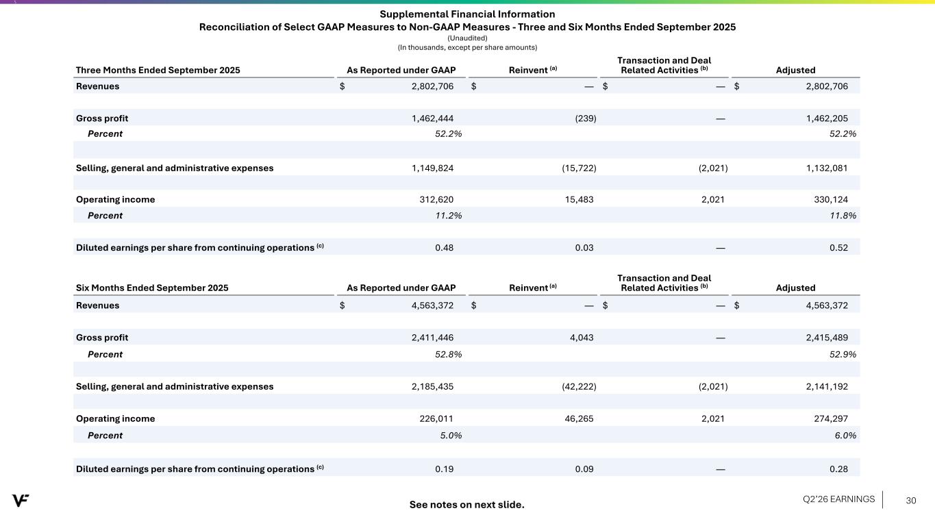 Supplemental Financial Information Segment Information - Constant Currency Basis (Unaudited) (In thousands) Six Months Ended September 2025 As Reported Adjust for Foreign under GAAP Currency Exchange Constant Currency Revenues: Outdoor segment $ 2,475,945 $ (49,355) $ 2,426,590 Active segment 1,460,437 (23,511) 1,436,926 All Other 626,990 (11,759) 615,231 Total revenues $ 4,563,372 $ (84,625) $ 4,478,747 Segment profit: Outdoor segment $ 258,470 $ (6,995) $ 251,475 Active segment 122,586 (4,613) 117,973 Total segment profit 381,056 (11,608) 369,448 Corporate and other expenses (200,232) 620 (199,612) Interest expense, net (87,329) (994) (88,323) "All Other" profit 48,193 (1,962) 46,231 Income from continuing operations before income taxes $ 141,688 $ (13,944) $ 127,744 Diluted earnings per share change from continuing operations 44% (24%) 20% Constant Currency Financial Information VF is a global company that reports financial information in U.S. dollars in accordance with GAAP. Foreign currency exchange rate fluctuations affect the amounts reported by VF from translating its foreign revenues and expenses into U.S. dollars. These rate fluctuations can have a significant effect on reported operating results. As a supplement to our reported operating results, we present constant currency financial information, which is a non-GAAP financial measure that excludes the impact of translating foreign currencies into U.S. dollars. We use constant currency information to provide a framework to assess how our business performed excluding the effects of changes in the rates used to calculate foreign currency translation. Management believes this information is useful to investors to facilitate comparison of operating results and better identify trends in our businesses. To calculate foreign currency translation on a constant currency basis, operating results for the current year period for entities reporting in currencies other than the U.S. dollar are translated into U.S. dollars at the average exchange rates in effect during the comparable period of the prior year (rather than the actual exchange rates in effect during the current year period). These constant currency performance measures should be viewed in addition to, and not in lieu of or superior to, our operating performance measures calculated in accordance with GAAP. The constant currency information presented may not be comparable to similarly titled measures reported by other companies. Q2’26 EARNINGS 29