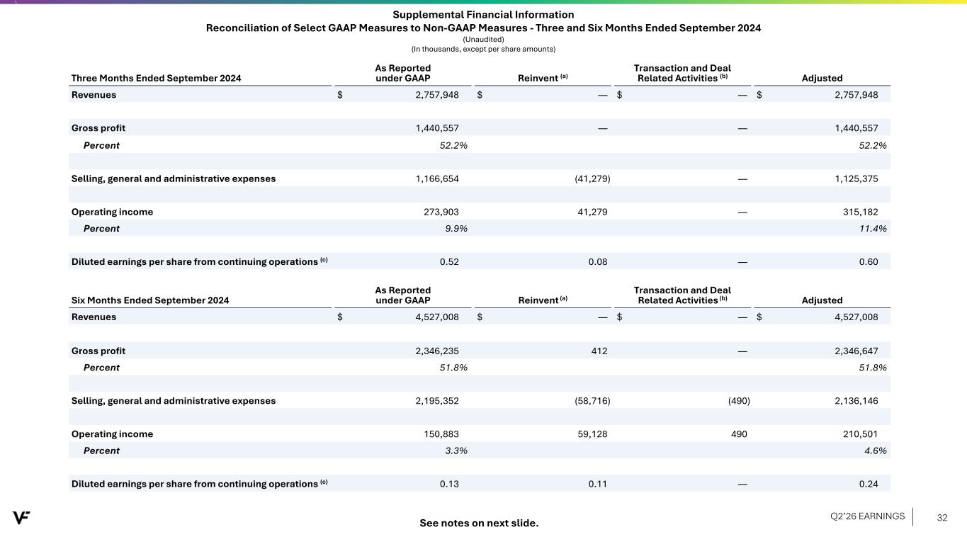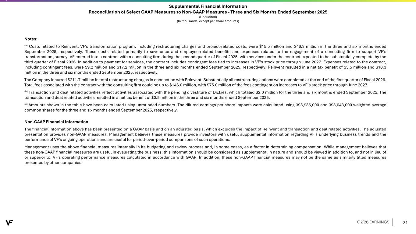 Supplemental Financial Information Reconciliation of Select GAAP Measures to Non-GAAP Measures - Three and Six Months Ended September 2025 (Unaudited) (In thousands, except per share amounts) Notes: (a) Costs related to Reinvent, VF's transformation program, including restructuring charges and project-related costs, were $15.5 million and $46.3 million in the three and six months ended September 2025, respectively. These costs related primarily to severance and employee-related benefits and expenses related to the engagement of a consulting firm to support VF's transformation journey. VF entered into a contract with a consulting firm during the second quarter of Fiscal 2025, with services under the contract expected to be substantially complete by the third quarter of Fiscal 2026. In addition to payment for services, the contract includes contingent fees tied to increases in VF's stock price through June 2027. Expenses related to the contract, including contingent fees, were $9.2 million and $17.2 million in the three and six months ended September 2025, respectively. Reinvent resulted in a net tax benefit of $3.5 million and $10.3 million in the three and six months ended September 2025, respectively. The Company incurred $211.7 million in total restructuring charges in connection with Reinvent. Substantially all restructuring actions were completed at the end of the first quarter of Fiscal 2026. Total fees associated with the contract with the consulting firm could be up to $146.0 million, with $75.0 million of the fees contingent on increases to VF’s stock price through June 2027. (b) Transaction and deal related activities reflect activities associated with the pending divestiture of Dickies, which totaled $2.0 million for the three and six months ended September 2025. The transaction and deal related activities resulted in a net tax benefit of $0.5 million in the three and six months ended September 2025. (c) Amounts shown in the table have been calculated using unrounded numbers. The diluted earnings per share impacts were calculated using 393,986,000 and 393,043,000 weighted average common shares for the three and six months ended September 2025, respectively. Non-GAAP Financial Information The financial information above has been presented on a GAAP basis and on an adjusted basis, which excludes the impact of Reinvent and transaction and deal related activities. The adjusted presentation provides non-GAAP measures. Management believes these measures provide investors with useful supplemental information regarding VF's underlying business trends and the performance of VF's ongoing operations and are useful for period-over-period comparisons of such operations. Management uses the above financial measures internally in its budgeting and review process and, in some cases, as a factor in determining compensation. While management believes that these non-GAAP financial measures are useful in evaluating the business, this information should be considered as supplemental in nature and should be viewed in addition to, and not in lieu of or superior to, VF's operating performance measures calculated in accordance with GAAP. In addition, these non-GAAP financial measures may not be the same as similarly titled measures presented by other companies. Q2’26 EARNINGS 31