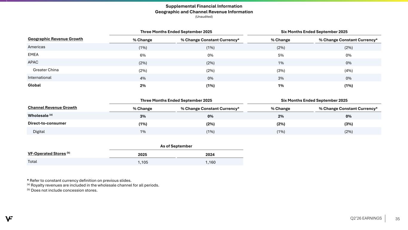 Supplemental Financial Information Top 3 Brand Revenue Information (Unaudited) Three Months Ended September 2025 Six Months Ended September 2025 Top 3 Brand Revenue Growth Americas EMEA APAC Global Americas EMEA APAC Global The North Face® % Change 2% 10% 7% 6% 0% 11% 10% 6% % Change Constant Currency* 2% 4% 7% 4% 1% 5% 10% 4% Vans® % Change (9%) (5%) (22%) (9%) (12%) (8%) (19%) (12%) % Change Constant Currency* (9%) (11%) (22%) (11%) (11%) (13%) (19%) (13%) Timberland® % Change 11% 9% (14%) 7% 12% 8% (5%) 8% % Change Constant Currency* 11% 3% (14%) 4% 13% 2% (6%) 6% * Refer to constant currency definition on previous slides. Q2’26 EARNINGS 34