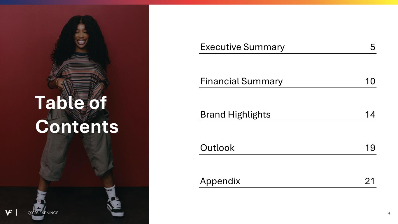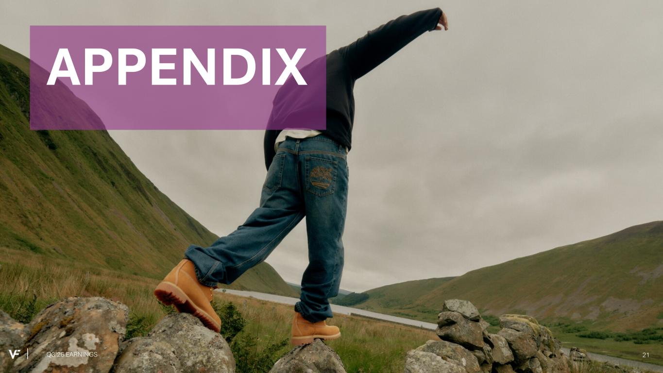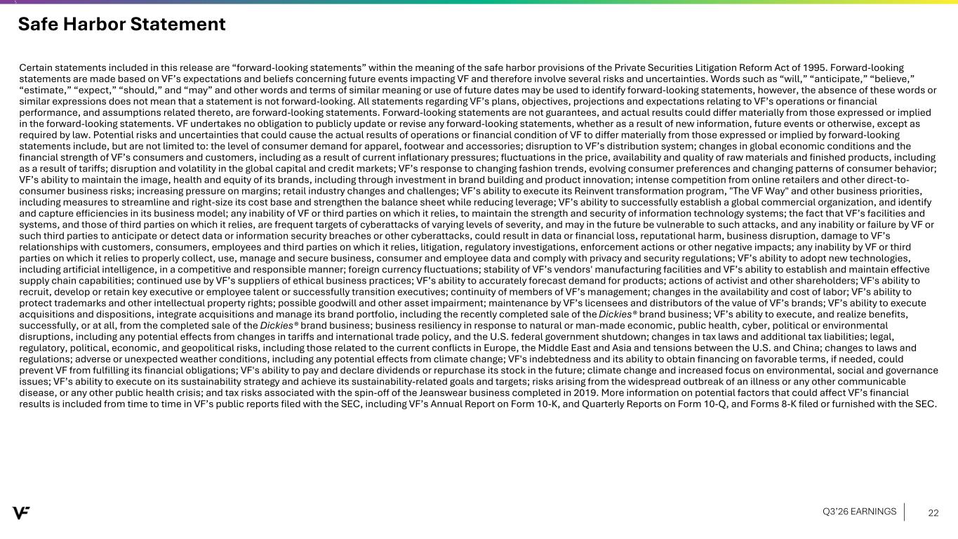Safe Harbor Statement Certain statements included in this release are “forward-looking statements” within the meaning of the safe harbor provisions of the Private Securities Litigation Reform Act of 1995. Forward-looking statements are made based on VF’s expectations and beliefs concerning future events impacting VF and therefore involve several risks and uncertainties. Words such as “will,” “anticipate,” “believe,” “estimate,” “expect,” “should,” and “may” and other words and terms of similar meaning or use of future dates may be used to identify forward-looking statements, however, the absence of these words or similar expressions does not mean that a statement is not forward-looking. All statements regarding VF’s plans, objectives, projections and expectations relating to VF’s operations or financial performance, and assumptions related thereto, are forward-looking statements. Forward-looking statements are not guarantees, and actual results could differ materially from those expressed or implied in the forward-looking statements. VF undertakes no obligation to publicly update or revise any forward-looking statements, whether as a result of new information, future events or otherwise, except as required by law. Potential risks and uncertainties that could cause the actual results of operations or financial condition of VF to differ materially from those expressed or implied by forward-looking statements include, but are not limited to: the level of consumer demand for apparel, footwear and accessories; disruption to VF’s distribution system; changes in global economic conditions and the financial strength of VF’s consumers and customers, including as a result of current inflationary pressures; fluctuations in the price, availability and quality of raw materials and finished products, including as a result of tariffs; disruption and volatility in the global capital and credit markets; VF’s response to changing fashion trends, evolving consumer preferences and changing patterns of consumer behavior; VF’s ability to maintain the image, health and equity of its brands, including through investment in brand building and product innovation; intense competition from online retailers and other direct-to- consumer business risks; increasing pressure on margins; retail industry changes and challenges; VF’s ability to execute its Reinvent transformation program, "The VF Way" and other business priorities, including measures to streamline and right-size its cost base and strengthen the balance sheet while reducing leverage; VF’s ability to successfully establish a global commercial organization, and identify and capture efficiencies in its business model; any inability of VF or third parties on which it relies, to maintain the strength and security of information technology systems; the fact that VF’s facilities and systems, and those of third parties on which it relies, are frequent targets of cyberattacks of varying levels of severity, and may in the future be vulnerable to such attacks, and any inability or failure by VF or such third parties to anticipate or detect data or information security breaches or other cyberattacks, could result in data or financial loss, reputational harm, business disruption, damage to VF’s relationships with customers, consumers, employees and third parties on which it relies, litigation, regulatory investigations, enforcement actions or other negative impacts; any inability by VF or third parties on which it relies to properly collect, use, manage and secure business, consumer and employee data and comply with privacy and security regulations; VF’s ability to adopt new technologies, including artificial intelligence, in a competitive and responsible manner; foreign currency fluctuations; stability of VF’s vendors' manufacturing facilities and VF’s ability to establish and maintain effective supply chain capabilities; continued use by VF’s suppliers of ethical business practices; VF’s ability to accurately forecast demand for products; actions of activist and other shareholders; VF's ability to recruit, develop or retain key executive or employee talent or successfully transition executives; continuity of members of VF’s management; changes in the availability and cost of labor; VF’s ability to protect trademarks and other intellectual property rights; possible goodwill and other asset impairment; maintenance by VF’s licensees and distributors of the value of VF’s brands; VF’s ability to execute acquisitions and dispositions, integrate acquisitions and manage its brand portfolio, including the recently completed sale of the Dickies® brand business; VF’s ability to execute, and realize benefits, successfully, or at all, from the completed sale of the Dickies® brand business; business resiliency in response to natural or man-made economic, public health, cyber, political or environmental disruptions, including any potential effects from changes in tariffs and international trade policy, and the U.S. federal government shutdown; changes in tax laws and additional tax liabilities; legal, regulatory, political, economic, and geopolitical risks, including those related to the current conflicts in Europe, the Middle East and Asia and tensions between the U.S. and China; changes to laws and regulations; adverse or unexpected weather conditions, including any potential effects from climate change; VF's indebtedness and its ability to obtain financing on favorable terms, if needed, could prevent VF from fulfilling its financial obligations; VF's ability to pay and declare dividends or repurchase its stock in the future; climate change and increased focus on environmental, social and governance issues; VF’s ability to execute on its sustainability strategy and achieve its sustainability-related goals and targets; risks arising from the widespread outbreak of an illness or any other communicable d