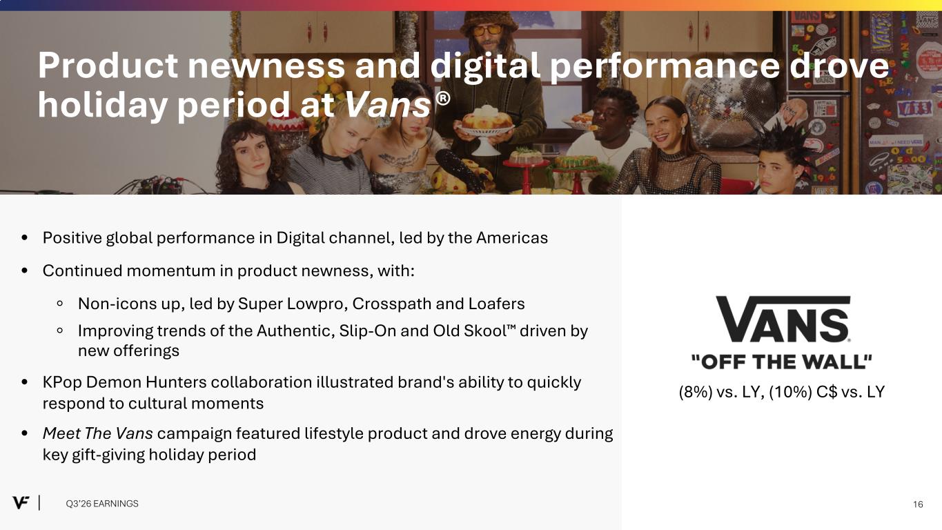 • Positive global performance in Digital channel, led by the Americas • Continued momentum in product newness, with: ◦ Non-icons up, led by Super Lowpro, Crosspath and Loafers ◦ Improving trends of the Authentic, Slip-On and Old Skool™ driven by new offerings • KPop Demon Hunters collaboration illustrated brand's ability to quickly respond to cultural moments • Meet The Vans campaign featured lifestyle product and drove energy during key gift-giving holiday period Product newness and digital performance drove holiday period at Vans® Q3’26 EARNINGS 16 (8%) vs. LY, (10%) C$ vs. LY
