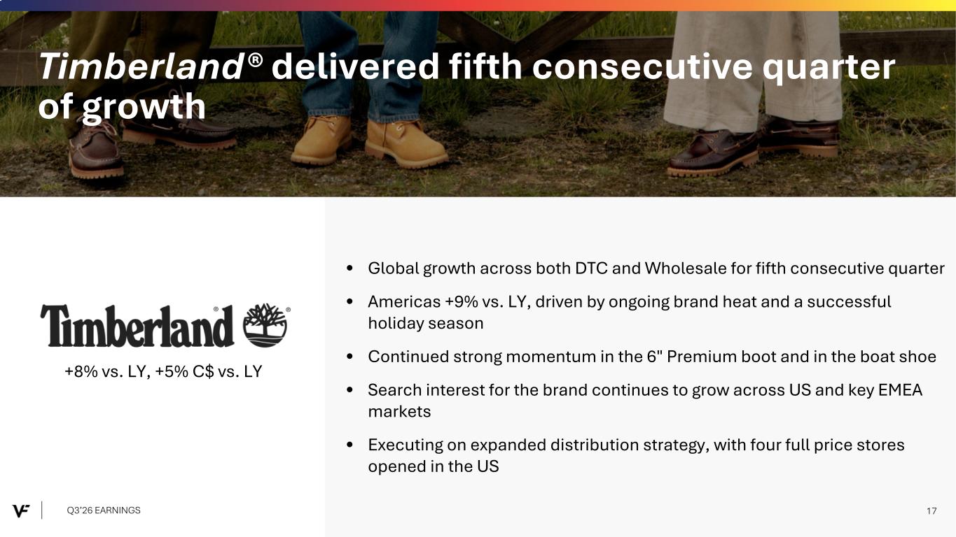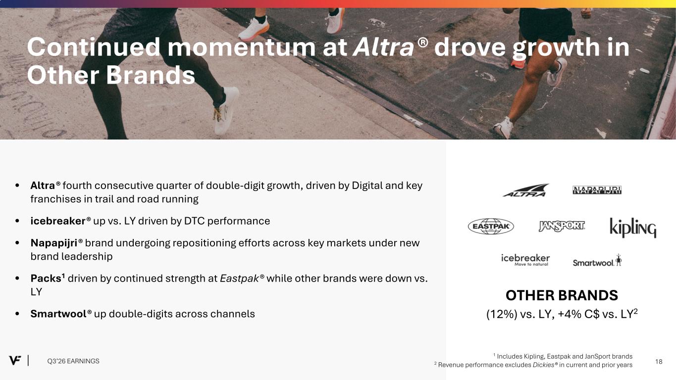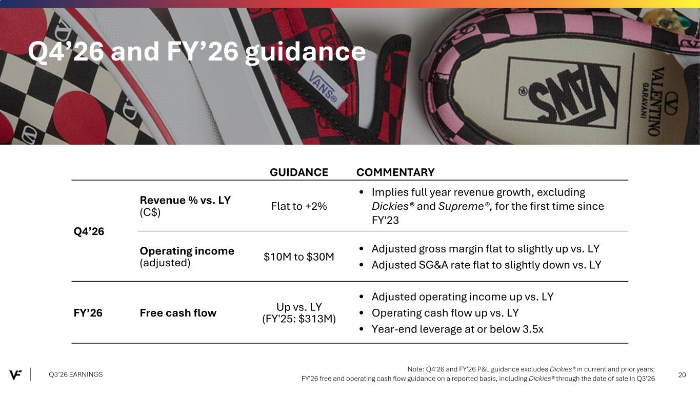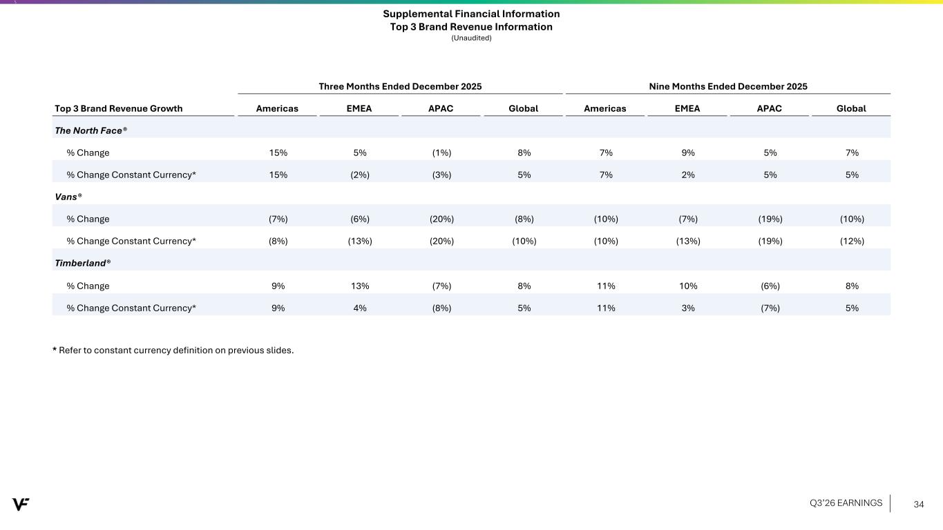 Financial Presentation Disclosure All per share amounts are presented on a diluted basis. This presentation refers to “reported” (R$) and “constant dollar” (C$) or “constant currency” amounts, terms that are described under the heading below “Constant Currency - Excluding the Impact of Foreign Currency.” Unless otherwise noted, “reported” and “constant dollar” or “constant currency” amounts are the same, and amounts will be as “reported” unless otherwise specified. This presentation also refers to “continuing” and “discontinued” operations amounts, which are concepts described under the heading “Discontinued Operations - Supreme.” Unless otherwise noted, results presented are based on continuing operations. This presentation also refers to results “excluding Dickies®” and “Adjusted excluding Dickies”, which are described under the heading “Dickies Divestiture”. This presentation also refers to “adjusted” amounts, a term that is described under the heading “Adjusted Amounts - Excluding Reinvent, Transaction and Deal Related Activities, Pension Settlement Charge and Non-cash Impairment Charge”. Unless otherwise noted, “reported” and “adjusted” amounts are the same. VF operates and reports using a 52/53 week fiscal year ending on the Saturday closest to March 31 of each year. This presentation refers to VF's third quarter of Fiscal 2026 as Q3'26, and similarly Q3'25 denotes VF's third quarter of Fiscal 2025, etc. VF defines “free cash flow” as cash flow from continuing operations less capital expenditures and software purchases and defines “net debt” as long-term debt, the current portion of long-term debt, short-term borrowings, and operating lease liabilities, less cash and cash equivalents per VF's consolidated balance sheet. Change in Reportable Segments VF realigned its reportable segments in the first quarter of Fiscal 2026. VF's updated reportable segments are Outdoor and Active. We have included an “All Other” category for the remaining operating segments that do not meet the quantitative threshold to be disclosed as a separate reportable segment. VF's financial results in this presentation reflect the new segments for all periods presented. Dickies Divestiture On September 15, 2025, VF entered into a definitive agreement with Bluestar Alliance LLC to sell the Dickies® brand business (“Dickies”) and on November 12, 2025, VF completed the sale of Dickies. “Reported” amounts present VF's third quarter Fiscal 2026 results in accordance with generally accepted accounting principles in the U.S. (“GAAP”) and include Dickies results in continuing operations through the date of sale, as the Dickies sale did not qualify for discontinued operations presentation under GAAP. References to results “excluding Dickies®” and “Adjusted excluding Dickies” exclude the results of Dickies for all periods presented. VF believes this non-GAAP presentation provides investors with useful information regarding VF’s current business trends and performance of VF’s operations, post the closing of the sale of Dickies. Discontinued Operations - Supreme On July 16, 2024, VF entered into a definitive Stock and Asset Purchase Agreement with EssilorLuxottica S.A. to sell the Supreme® brand business (“Supreme”). On October 1, 2024, VF completed the sale of Supreme. Accordingly, the company has reported the related held-for-sale assets and liabilities as assets and liabilities of discontinued operations and included the operating results and cash flows of the business in discontinued operations for all periods presented, through the date of sale. Constant Currency - Excluding the Impact of Foreign Currency This presentation refers to “reported” amounts in accordance with GAAP, which include translation and transactional impacts from foreign currency exchange rates. This presentation also refers to both “constant dollar” and “constant currency” amounts, which exclude the impact of translating foreign currencies into U.S. dollars. Reconciliations of GAAP measures to constant currency amounts are presented in the supplemental financial information included with this presentation, which identifies and quantifies all excluded items, and provides management’s view of why this information is useful to investors. Q3’26 EARNINGS 2