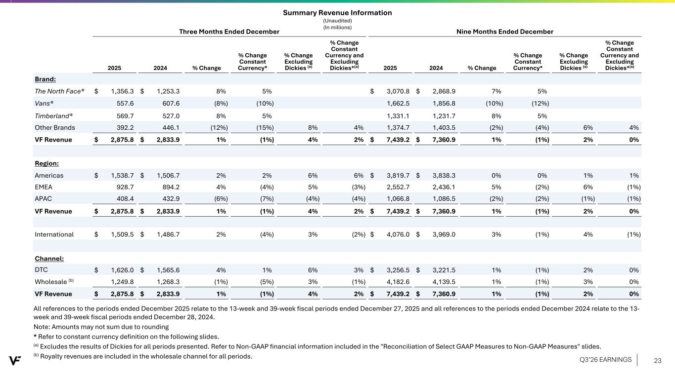 Three Months Ended December Nine Months Ended December 2025 2024 % Change % Change Constant Currency* % Change Excluding Dickies (a) % Change Constant Currency and Excluding Dickies*(a) 2025 2024 % Change % Change Constant Currency* % Change Excluding Dickies (a) % Change Constant Currency and Excluding Dickies*(a) Brand: The North Face® $ 1,356.3 $ 1,253.3 8% 5% $ 3,070.8 $ 2,868.9 7% 5% Vans® 557.6 607.6 (8%) (10%) 1,662.5 1,856.8 (10%) (12%) Timberland® 569.7 527.0 8% 5% 1,331.1 1,231.7 8% 5% Other Brands 392.2 446.1 (12%) (15%) 8% 4% 1,374.7 1,403.5 (2%) (4%) 6% 4% VF Revenue $ 2,875.8 $ 2,833.9 1% (1%) 4% 2% $ 7,439.2 $ 7,360.9 1% (1%) 2% 0% Region: Americas $ 1,538.7 $ 1,506.7 2% 2% 6% 6% $ 3,819.7 $ 3,838.3 0% 0% 1% 1% EMEA 928.7 894.2 4% (4%) 5% (3%) 2,552.7 2,436.1 5% (2%) 6% (1%) APAC 408.4 432.9 (6%) (7%) (4%) (4%) 1,066.8 1,086.5 (2%) (2%) (1%) (1%) VF Revenue $ 2,875.8 $ 2,833.9 1% (1%) 4% 2% $ 7,439.2 $ 7,360.9 1% (1%) 2% 0% International $ 1,509.5 $ 1,486.7 2% (4%) 3% (2%) $ 4,076.0 $ 3,969.0 3% (1%) 4% (1%) Channel: DTC $ 1,626.0 $ 1,565.6 4% 1% 6% 3% $ 3,256.5 $ 3,221.5 1% (1%) 2% 0% Wholesale (b) 1,249.8 1,268.3 (1%) (5%) 3% (1%) 4,182.6 4,139.5 1% (1%) 3% 0% VF Revenue $ 2,875.8 $ 2,833.9 1% (1%) 4% 2% $ 7,439.2 $ 7,360.9 1% (1%) 2% 0% Summary Revenue Information (Unaudited) (In millions) All references to the periods ended December 2025 relate to the 13-week and 39-week fiscal periods ended December 27, 2025 and all references to the periods ended December 2024 relate to the 13- week and 39-week fiscal periods ended December 28, 2024. Note: Amounts may not sum due to rounding * Refer to constant currency definition on the following slides. (a) Excludes the results of Dickies for all periods presented. Refer to Non-GAAP financial information included in the "Reconciliation of Select GAAP Measures to Non-GAAP Measures" slides. (b) Royalty revenues are included in the wholesale channel for all periods. Q3’26 EARNINGS 23