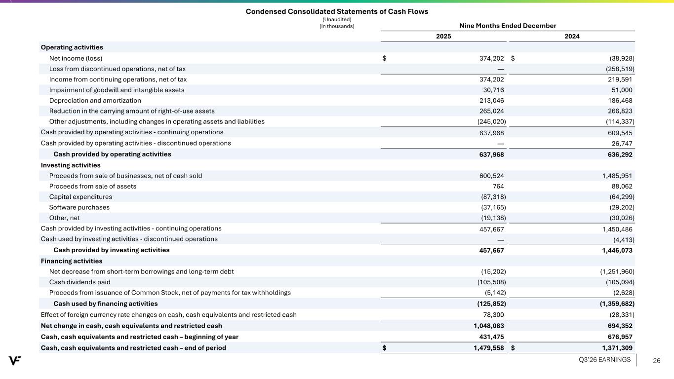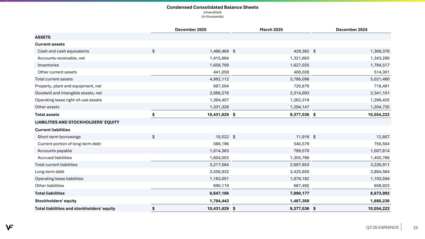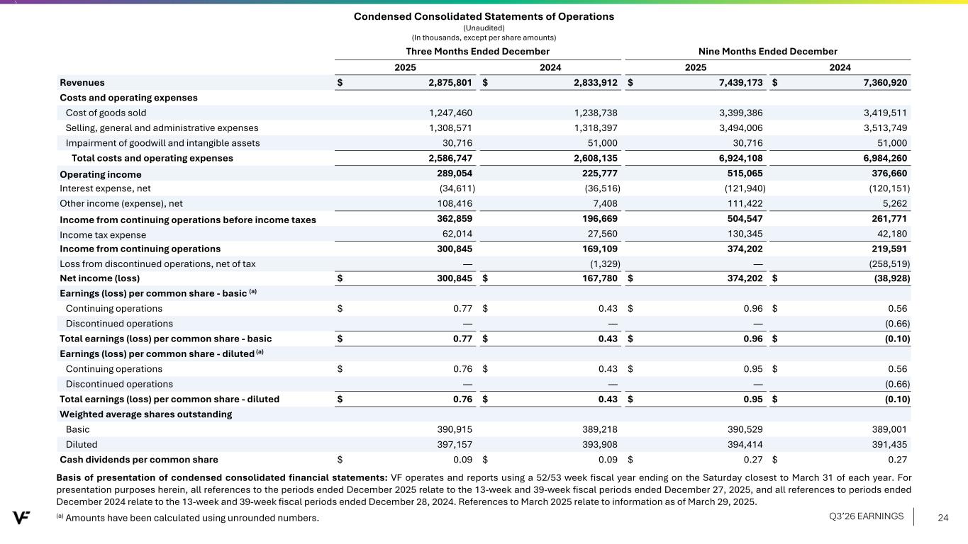 Three Months Ended December Nine Months Ended December 2025 2024 2025 2024 Revenues $ 2,875,801 $ 2,833,912 $ 7,439,173 $ 7,360,920 Costs and operating expenses Cost of goods sold 1,247,460 1,238,738 3,399,386 3,419,511 Selling, general and administrative expenses 1,308,571 1,318,397 3,494,006 3,513,749 Impairment of goodwill and intangible assets 30,716 51,000 30,716 51,000 Total costs and operating expenses 2,586,747 2,608,135 6,924,108 6,984,260 Operating income 289,054 225,777 515,065 376,660 Interest expense, net (34,611) (36,516) (121,940) (120,151) Other income (expense), net 108,416 7,408 111,422 5,262 Income from continuing operations before income taxes 362,859 196,669 504,547 261,771 Income tax expense 62,014 27,560 130,345 42,180 Income from continuing operations 300,845 169,109 374,202 219,591 Loss from discontinued operations, net of tax — (1,329) — (258,519) Net income (loss) $ 300,845 $ 167,780 $ 374,202 $ (38,928) Earnings (loss) per common share - basic (a) Continuing operations $ 0.77 $ 0.43 $ 0.96 $ 0.56 Discontinued operations — — — (0.66) Total earnings (loss) per common share - basic $ 0.77 $ 0.43 $ 0.96 $ (0.10) Earnings (loss) per common share - diluted (a) Continuing operations $ 0.76 $ 0.43 $ 0.95 $ 0.56 Discontinued operations — — — (0.66) Total earnings (loss) per common share - diluted $ 0.76 $ 0.43 $ 0.95 $ (0.10) Weighted average shares outstanding Basic 390,915 389,218 390,529 389,001 Diluted 397,157 393,908 394,414 391,435 Cash dividends per common share $ 0.09 $ 0.09 $ 0.27 $ 0.27 Condensed Consolidated Statements of Operations (Unaudited) (In thousands, except per share amounts) Basis of presentation of condensed consolidated financial statements: VF operates and reports using a 52/53 week fiscal year ending on the Saturday closest to March 31 of each year. For presentation purposes herein, all references to the periods ended December 2025 relate to the 13-week and 39-week fiscal periods ended December 27, 2025, and all references to periods ended December 2024 relate to the 13-week and 39-week fiscal periods ended December 28, 2024. References to March 2025 relate to information as of March 29, 2025. (a) Amounts have been calculated using unrounded numbers. Q3’26 EARNINGS 24