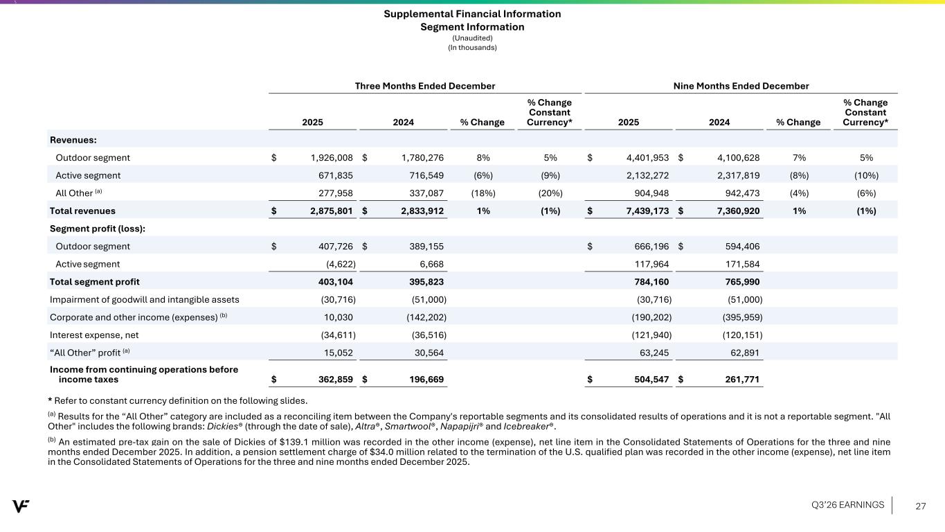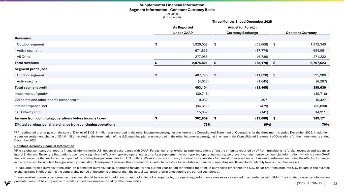 Supplemental Financial Information Segment Information - Constant Currency Basis (Unaudited) (In thousands) Three Months Ended December 2025 As Reported Adjust for Foreign under GAAP Currency Exchange Constant Currency Revenues: Outdoor segment $ 1,926,008 $ (53,668) $ 1,872,340 Active segment 671,835 (17,774) 654,061 All Other 277,958 (6,736) 271,222 Total revenues $ 2,875,801 $ (78,178) $ 2,797,623 Segment profit (loss): Outdoor segment $ 407,726 $ (11,820) $ 395,906 Active segment (4,622) (1,645) (6,267) Total segment profit 403,104 (13,465) 389,639 Impairment of goodwill (30,716) — (30,716) Corporate and other income (expenses) (a) 10,030 397 10,427 Interest expense, net (34,611) (479) (35,090) “All Other” profit 15,052 (141) 14,911 Income from continuing operations before income taxes $ 362,859 $ (13,688) $ 349,171 Diluted earnings per share change from continuing operations 76% (6%) 70% (a) An estimated pre-tax gain on the sale of Dickies of $139.1 million was recorded in the other income (expense), net line item in the Consolidated Statement of Operations for the three months ended December 2025. In addition, a pension settlement charge of $34.0 million related to the termination of the U.S. qualified plan was recorded in the other income (expense), net line item in the Consolidated Statement of Operations for the three months ended December 2025. Constant Currency Financial Information VF is a global company that reports financial information in U.S. dollars in accordance with GAAP. Foreign currency exchange rate fluctuations affect the amounts reported by VF from translating its foreign revenues and expenses into U.S. dollars. These rate fluctuations can have a significant effect on reported operating results. As a supplement to our reported operating results, we present constant currency financial information, which is a non-GAAP financial measure that excludes the impact of translating foreign currencies into U.S. dollars. We use constant currency information to provide a framework to assess how our business performed excluding the effects of changes in the rates used to calculate foreign currency translation. Management believes this information is useful to investors to facilitate comparison of operating results and better identify trends in our businesses. To calculate foreign currency translation on a constant currency basis, operating results for the current year period for entities reporting in currencies other than the U.S. dollar are translated into U.S. dollars at the average exchange rates in effect during the comparable period of the prior year (rather than the actual exchange rates in effect during the current year period). These constant currency performance measures should be viewed in addition to, and not in lieu of or superior to, our operating performance measures calculated in accordance with GAAP. The constant currency information presented may not be comparable to similarly titled measures reported by other companies. Q3’26 EARNINGS 28