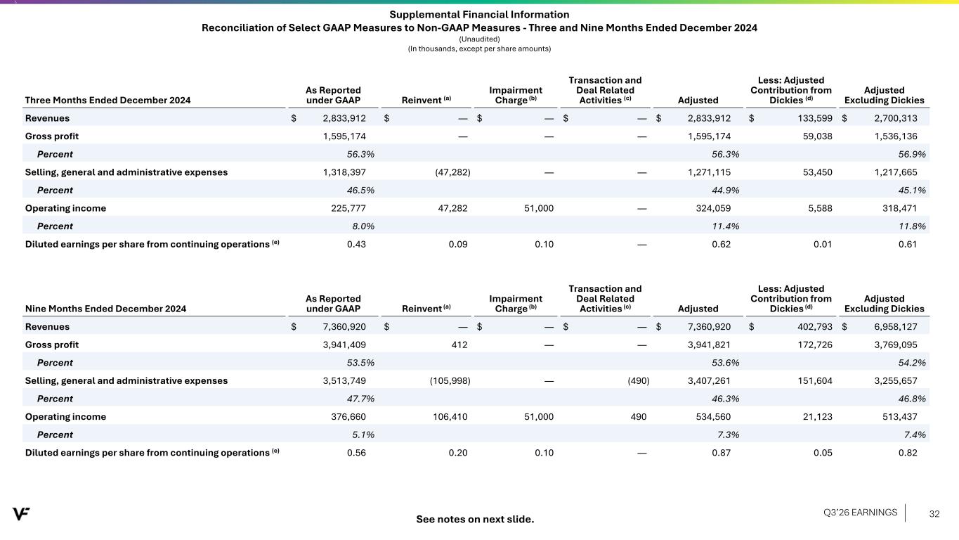 Supplemental Financial Information Reconciliation of Select GAAP Measures to Non-GAAP Measures - Three and Nine Months Ended December 2025 (Unaudited) (In thousands, except per share amounts) Three Months Ended December 2025 As Reported under GAAP Reinvent (a) Impairment and Pension Settlement Charge (b) Transaction and Deal Related Activities (c) Adjusted Less: Adjusted Contribution from Dickies (d) Adjusted Excluding Dickies Revenues $ 2,875,801 $ — $ — $ — $ 2,875,801 $ 55,747 $ 2,820,054 Gross profit 1,628,341 214 — — 1,628,555 21,475 1,607,080 Percent 56.6% 56.6% 57.0% Selling, general and administrative expenses 1,308,571 (4,885) — (8,173) 1,295,513 29,430 1,266,083 Percent 45.5% 45.0% 44.9% Operating income (loss) 289,054 5,099 30,716 8,173 333,042 (7,955) 340,997 Percent 10.1% 11.6% 12.1% Diluted earnings (loss) per share from continuing operations (e) 0.76 0.01 0.14 (0.34) 0.56 (0.01) 0.58 Nine Months Ended December 2025 As Reported under GAAP Reinvent (a) Impairment and Pension Settlement Charge (b) Transaction and Deal Related Activities (c) Adjusted Less: Adjusted Contribution from Dickies (d) Adjusted Excluding Dickies Revenues $ 7,439,173 $ — $ — $ — $ 7,439,173 $ 309,255 $ 7,129,918 Gross profit 4,039,787 4,257 — — 4,044,044 136,662 3,907,382 Percent 54.3% 54.4% 54.8% Selling, general and administrative expenses 3,494,006 (47,107) — (10,194) 3,436,705 125,428 3,311,277 Percent 47.0% 46.2% 46.4% Operating income 515,065 51,364 30,716 10,194 607,339 11,235 596,104 Percent 6.9% 8.2% 8.4% Diluted earnings per share from continuing operations (e) 0.95 0.10 0.14 (0.34) 0.85 0.02 0.83 Q3’26 EARNINGS 30See notes on next slide.