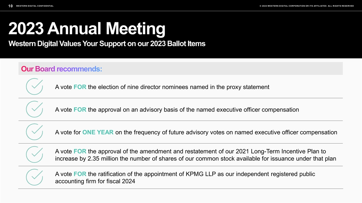 WESTERN DIGITAL CONFIDENTIAL © 2023 WESTERN DIGITAL CORPORATION OR ITS AFFILIATES ALL RIGHTS RESERVED 10 2023 Annual Meeting Western Digital Values Your Support on our 2023 Ballot Items A vote FOR the election of nine director nominees named in the proxy statement A vote FOR the approval on an advisory basis of the named executive officer compensation A vote for ONE YEAR on the frequency of future advisory votes on named executive officer compensation A vote FOR the approval of the amendment and restatement of our 2021 Long-Term Incentive Plan to increase by 2.35 million the number of shares of our common stock available for issuance under that plan A vote FOR the ratification of the appointment of KPMG LLP as our independent registered public accounting firm for fiscal 2024