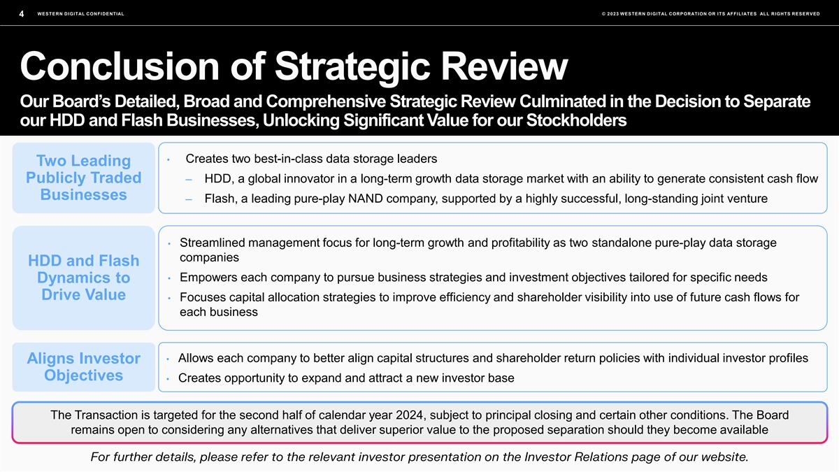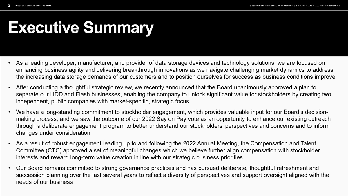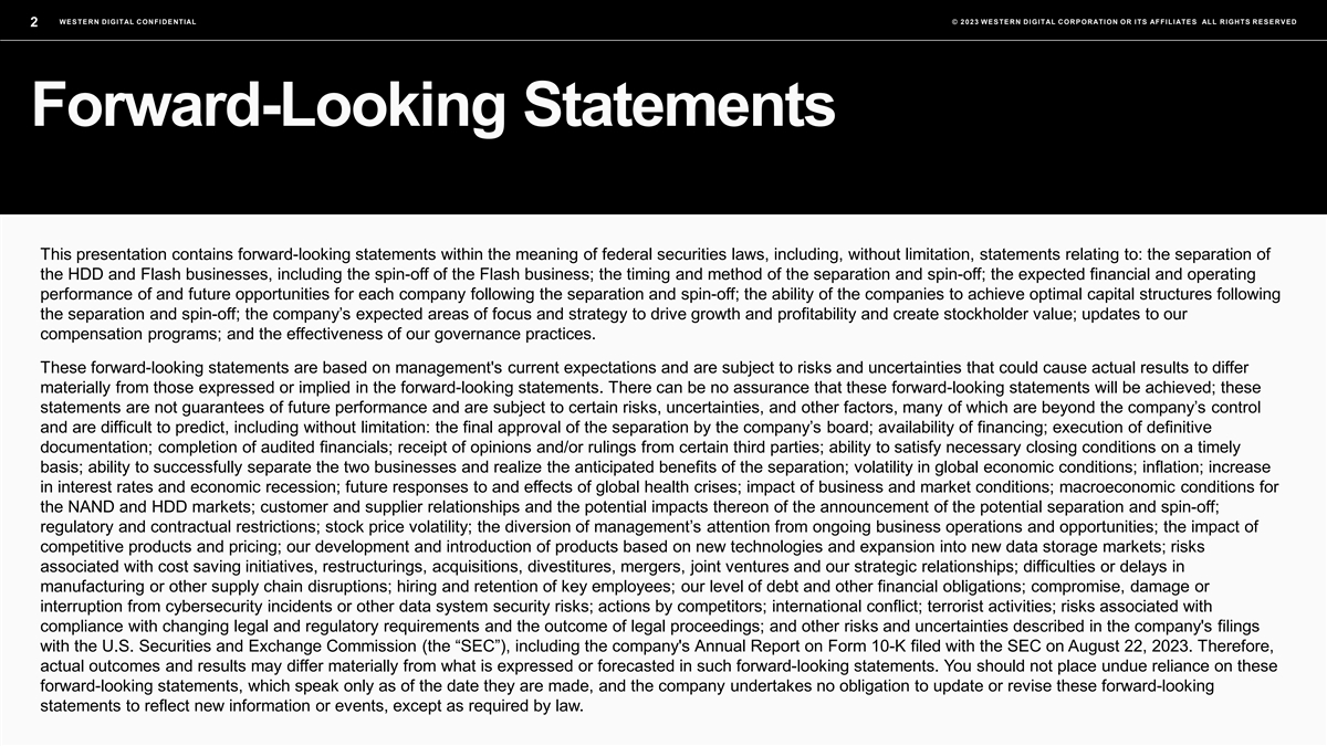WESTERN DIGITAL CONFIDENTIAL © 2023 WESTERN DIGITAL CORPORATION OR ITS AFFILIATES ALL RIGHTS RESERVED 2 Forward-Looking Statements This presentation contains forward-looking statements within the meaning of federal securities laws, including, without limitation, statements relating to: the separation of the HDD and Flash businesses, including the spin-off of the Flash business; the timing and method of the separation and spin-off; the expected financial and operating performance of and future opportunities for each company following the separation and spin-off; the ability of the companies to achieve optimal capital structures following the separation and spin-off; the company’s expected areas of focus and strategy to drive growth and profitability and create stockholder value; updates to our compensation programs; and the effectiveness of our governance practices. These forward-looking statements are based on management's current expectations and are subject to risks and uncertainties that could cause actual results to differ materially from those expressed or implied in the forward-looking statements. There can be no assurance that these forward-looking statements will be achieved; these statements are not guarantees of future performance and are subject to certain risks, uncertainties, and other factors, many of which are beyond the company’s control and are difficult to predict, including without limitation: the final approval of the separation by the company’s board; availability of financing; execution of definitive documentation; completion of audited financials; receipt of opinions and/or rulings from certain third parties; ability to satisfy necessary closing conditions on a timely basis; ability to successfully separate the two businesses and realize the anticipated benefits of the separation; volatility in global economic conditions; inflation; increase in interest rates and economic recession; future responses to and effects of global health crises; impact of business and market conditions; macroeconomic conditions for the NAND and HDD markets; customer and supplier relationships and the potential impacts thereon of the announcement of the potential separation and spin-off; regulatory and contractual restrictions; stock price volatility; the diversion of management’s attention from ongoing business operations and opportunities; the impact of competitive products and pricing; our development and introduction of products based on new technologies and expansion into new data storage markets; risks associated with cost saving initiatives, restructurings, acquisitions, divestitures, mergers, joint ventures and our strategic relationships; difficulties or delays in manufacturing or other supply chain disruptions; hiring and retention of key employees; our level of debt and other financial obligations; compromise, damage or interruption from cybersecurity incidents or other data system security risks; actions by competitors; international conflict; terrorist activities; risks associated with compliance with changing legal and regulatory requirements and the outcome of legal proceedings; and other risks and uncertainties described in the company's filings with the U.S. Securities and Exchange Commission (the “SEC”), including the company's Annual Report on Form 10-K filed with the SEC on August 22, 2023. Therefore, actual outcomes and results may differ materially from what is expressed or forecasted in such forward-looking statements. You should not place undue reliance on these forward-looking statements, which speak only as of the date they are made, and the company undertakes no obligation to update or revise these forward-looking statements to reflect new information or events, except as required by law.