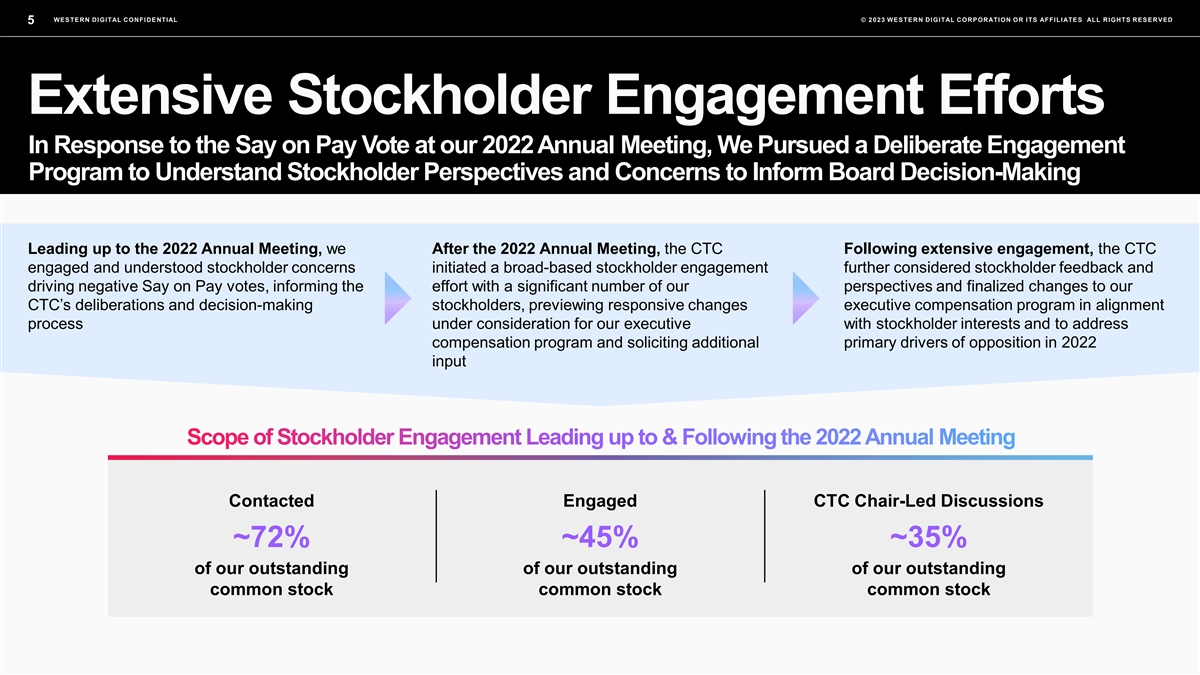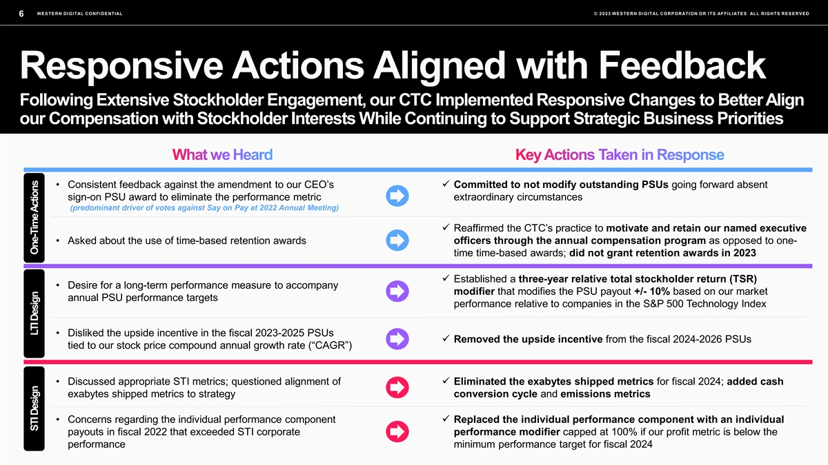 WESTERN DIGITAL CONFIDENTIAL © 2023 WESTERN DIGITAL CORPORATION OR ITS AFFILIATES ALL RIGHTS RESERVED 5 Extensive Stockholder Engagement Efforts In Response to the Say on Pay Vote at our 2022 Annual Meeting, We Pursued a Deliberate Engagement Program to Understand Stockholder Perspectives and Concerns to Inform Board Decision-Making Leading up to the 2022 Annual Meeting, we After the 2022 Annual Meeting, the CTC Following extensive engagement, the CTC engaged and understood stockholder concerns initiated a broad-based stockholder engagement further considered stockholder feedback and driving negative Say on Pay votes, informing the effort with a significant number of our perspectives and finalized changes to our CTC’s deliberations and decision-making stockholders, previewing responsive changes executive compensation program in alignment process under consideration for our executive with stockholder interests and to address compensation program and soliciting additional primary drivers of opposition in 2022 input Contacted Engaged CTC Chair-Led Discussions ~72% ~45% ~35% of our outstanding of our outstanding of our outstanding common stock common stock common stock