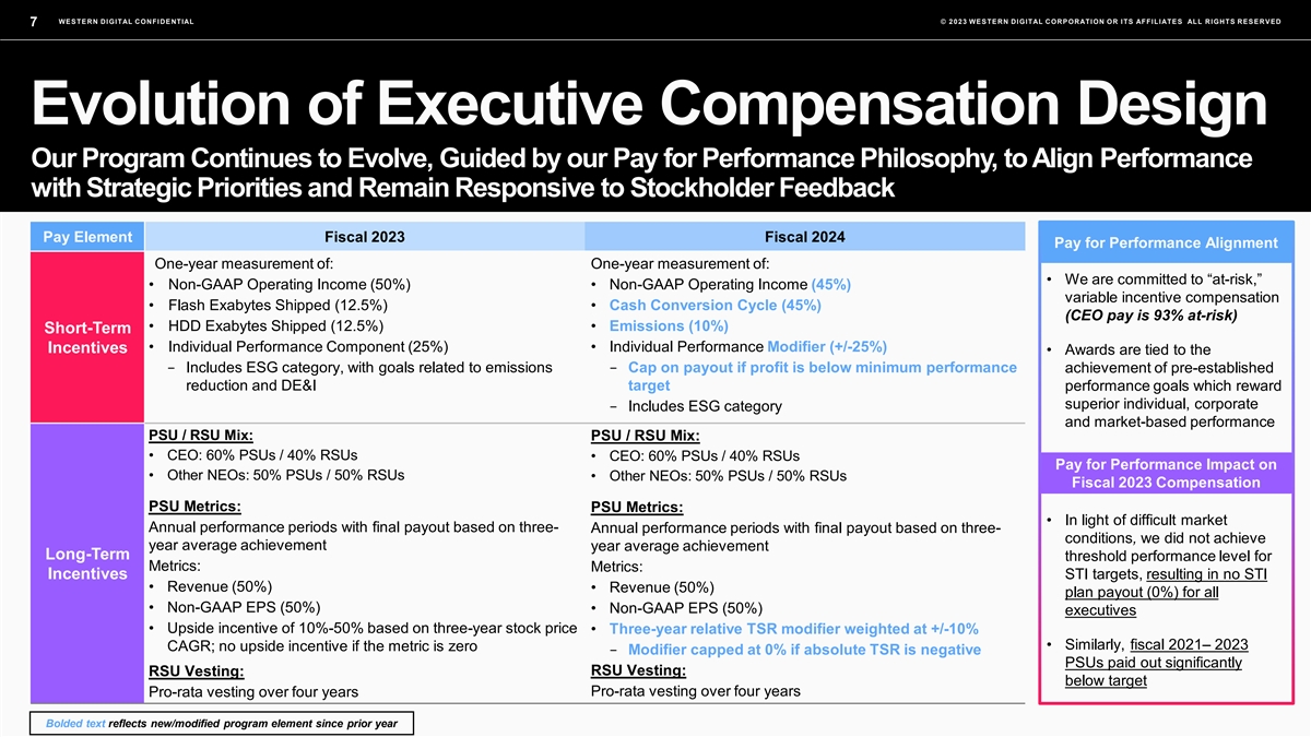 WESTERN DIGITAL CONFIDENTIAL © 2023 WESTERN DIGITAL CORPORATION OR ITS AFFILIATES ALL RIGHTS RESERVED 6 Responsive Actions Aligned with Feedback Following Extensive Stockholder Engagement, our CTC Implemented Responsive Changes to Better Align our Compensation with Stockholder Interests While Continuing to Support Strategic Business Priorities • Consistent feedback against the amendment to our CEO’s ü Committed to not modify outstanding PSUs going forward absent sign-on PSU award to eliminate the performance metric extraordinary circumstances (predominant driver of votes against Say on Pay at 2022 Annual Meeting) ü Reaffirmed the CTC’s practice to motivate and retain our named executive officers through the annual compensation program as opposed to one- • Asked about the use of time-based retention awards time time-based awards; did not grant retention awards in 2023 ü Established a three-year relative total stockholder return (TSR) • Desire for a long-term performance measure to accompany modifier that modifies the PSU payout +/- 10% based on our market annual PSU performance targets performance relative to companies in the S&P 500 Technology Index • Disliked the upside incentive in the fiscal 2023-2025 PSUs ü Removed the upside incentive from the fiscal 2024-2026 PSUs tied to our stock price compound annual growth rate (“CAGR”) • Discussed appropriate STI metrics; questioned alignment of ü Eliminated the exabytes shipped metrics for fiscal 2024; added cash exabytes shipped metrics to strategy conversion cycle and emissions metrics • Concerns regarding the individual performance component ü Replaced the individual performance component with an individual payouts in fiscal 2022 that exceeded STI corporate performance modifier capped at 100% if our profit metric is below the performance minimum performance target for fiscal 2024 STI Design LTI Design One-Time Actions