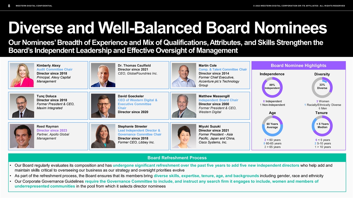WESTERN DIGITAL CONFIDENTIAL © 2023 WESTERN DIGITAL CORPORATION OR ITS AFFILIATES ALL RIGHTS RESERVED 8 Diverse and Well-Balanced Board Nominees Our Nominees’ Breadth of Experience and Mix of Qualifications, Attributes, and Skills Strengthen the Board’s Independent Leadership and Effective Oversight of Management Kimberly Alexy Dr. Thomas Caulfield Martin Cole Board Nominee Highlights Audit Committee Chair Director since 2021 Comp. & Talent Committee Chair Director since 2018 CEO, GlobalFoundries Inc. Director since 2014 Independence Diversity Principal, Alexy Capital Former Chief Executive, Management Accenture plc’s Technology 89% 33% Group Independent Diverse Tunç Doluca David Goeckeler Matthew Massengill Director since 2018 CEO of Western Digital & Independent Board Chair 8 Independent 3 Women Former President & CEO, Executive Committee Director since 2000 1 Non-Independent 1 Racially/Ethnically Diverse Maxim Integrated Chair Former President & CEO, 6 Men Director since 2020 Western Digital Age Tenure 60 Years < 5 Years Reed Rayman Stephanie Streeter Miyuki Suzuki Average Median Director since 2023 Lead Independent Director & Director since 2021 Former CEO, Libbey Inc. Partner, Apollo Global Governance Committee Chair Former President - Asia Management Director since 2018 Pacific, Japan and China, 2 < 60 years 6 < 5 years Former CEO, Libbey Inc. Cisco Systems, Inc. 5 60-65 years 2 5-10 years 2 > 65 years 1 > 10 years Board Refreshment Process • Our Board regularly evaluates its composition and has undergone significant refreshment over the past five years to add five new independent directors who help add and maintain skills critical to overseeing our business as our strategy and oversight priorities evolve • As part of the refreshment process, the Board ensures that its members bring diverse skills, expertise, tenure, age, and backgrounds including gender, race and ethnicity • Our Corporate Governance Guidelines require the Governance Committee to include, and instruct any search firm it engages to include, women and members of underrepresented communities in the pool from which it selects director nominees