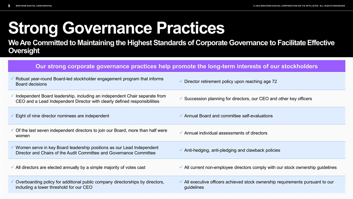 WESTERN DIGITAL CONFIDENTIAL © 2023 WESTERN DIGITAL CORPORATION OR ITS AFFILIATES ALL RIGHTS RESERVED 9 Strong Governance Practices We Are Committed to Maintaining the Highest Standards of Corporate Governance to Facilitate Effective Oversight Our strong corporate governance practices help promote the long-term interests of our stockholders ü Robust year-round Board-led stockholder engagement program that informs ü Director retirement policy upon reaching age 72 Board decisions ü Independent Board leadership, including an independent Chair separate from ü Succession planning for directors, our CEO and other key officers CEO and a Lead Independent Director with clearly defined responsibilities ü Eight of nine director nominees are independent ü Annual Board and committee self-evaluations ü Of the last seven independent directors to join our Board, more than half were ü Annual individual assessments of directors women ü Women serve in key Board leadership positions as our Lead Independent ü Anti-hedging, anti-pledging and clawback policies Director and Chairs of the Audit Committee and Governance Committee ü All directors are elected annually by a simple majority of votes castü All current non-employee directors comply with our stock ownership guidelines ü Overboarding policy for additional public company directorships by directors, ü All executive officers achieved stock ownership requirements pursuant to our including a lower threshold for our CEO guidelines