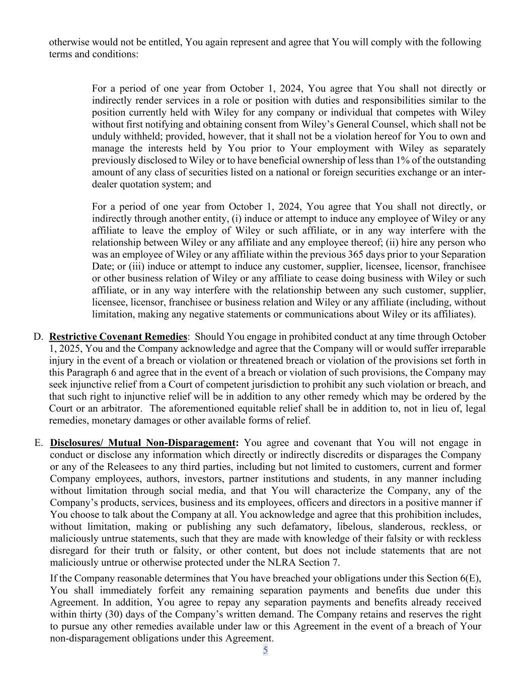 5 otherwise would not be entitled, You again represent and agree that You will comply with the following terms and conditions: For a period of one year from October 1, 2024, You agree that You shall not directly or indirectly render services in a role or position with duties and responsibilities similar to the position currently held with Wiley for any company or individual that competes with Wiley without first notifying and obtaining consent from Wiley’s General Counsel, which shall not be unduly withheld; provided, however, that it shall not be a violation hereof for You to own and manage the interests held by You prior to Your employment with Wiley as separately previously disclosed to Wiley or to have beneficial ownership of less than 1% of the outstanding amount of any class of securities listed on a national or foreign securities exchange or an inter- dealer quotation system; and For a period of one year from October 1, 2024, You agree that You shall not directly, or indirectly through another entity, (i) induce or attempt to induce any employee of Wiley or any affiliate to leave the employ of Wiley or such affiliate, or in any way interfere with the relationship between Wiley or any affiliate and any employee thereof; (ii) hire any person who was an employee of Wiley or any affiliate within the previous 365 days prior to your Separation Date; or (iii) induce or attempt to induce any customer, supplier, licensee, licensor, franchisee or other business relation of Wiley or any affiliate to cease doing business with Wiley or such affiliate, or in any way interfere with the relationship between any such customer, supplier, licensee, licensor, franchisee or business relation and Wiley or any affiliate (including, without limitation, making any negative statements or communications about Wiley or its affiliates). D. Restrictive Covenant Remedies: Should You engage in prohibited conduct at any time through October 1, 2025, You and the Company acknowledge and agree that the Company will or would suffer irreparable injury in the event of a breach or violation or threatened breach or violation of the provisions set forth in this Paragraph 6 and agree that in the event of a breach or violation of such provisions, the Company may seek injunctive relief from a Court of competent jurisdiction to prohibit any such violation or breach, and that such right to injunctive relief will be in addition to any other remedy which may be ordered by the Court or an arbitrator. The aforementioned equitable relief shall be in addition to, not in lieu of, legal remedies, monetary damages or other available forms of relief. E. Disclosures/ Mutual Non-Disparagement: You agree and covenant that You will not engage in conduct or disclose any information which directly or indirectly discredits or disparages the Company or any of the Releasees to any third parties, including but not limited to customers, current and former Company employees, authors, investors, partner institutions and students, in any manner including without limitation through social media, and that You will characterize the Company, any of the Company’s products, services, business and its employees, officers and directors in a positive manner if You choose to talk about the Company at all. You acknowledge and agree that this prohibition includes, without limitation, making or publishing any such defamatory, libelous, slanderous, reckless, or maliciously untrue statements, such that they are made with knowledge of their falsity or with reckless disregard for their truth or falsity, or other content, but does not include statements that are not maliciously untrue or otherwise protected under the NLRA Section 7. If the Company reasonable determines that You have breached your obligations under this Section 6(E), You shall immediately forfeit any remaining separation payments and benefits due under this Agreement. In addition, You agree to repay any separation payments and benefits already received within thirty (30) days of the Company’s written demand. The Company retains and reserves the right to pursue any other remedies available under law or this Agreement in the event of a breach of Your non-disparagement obligations under this Agreement.