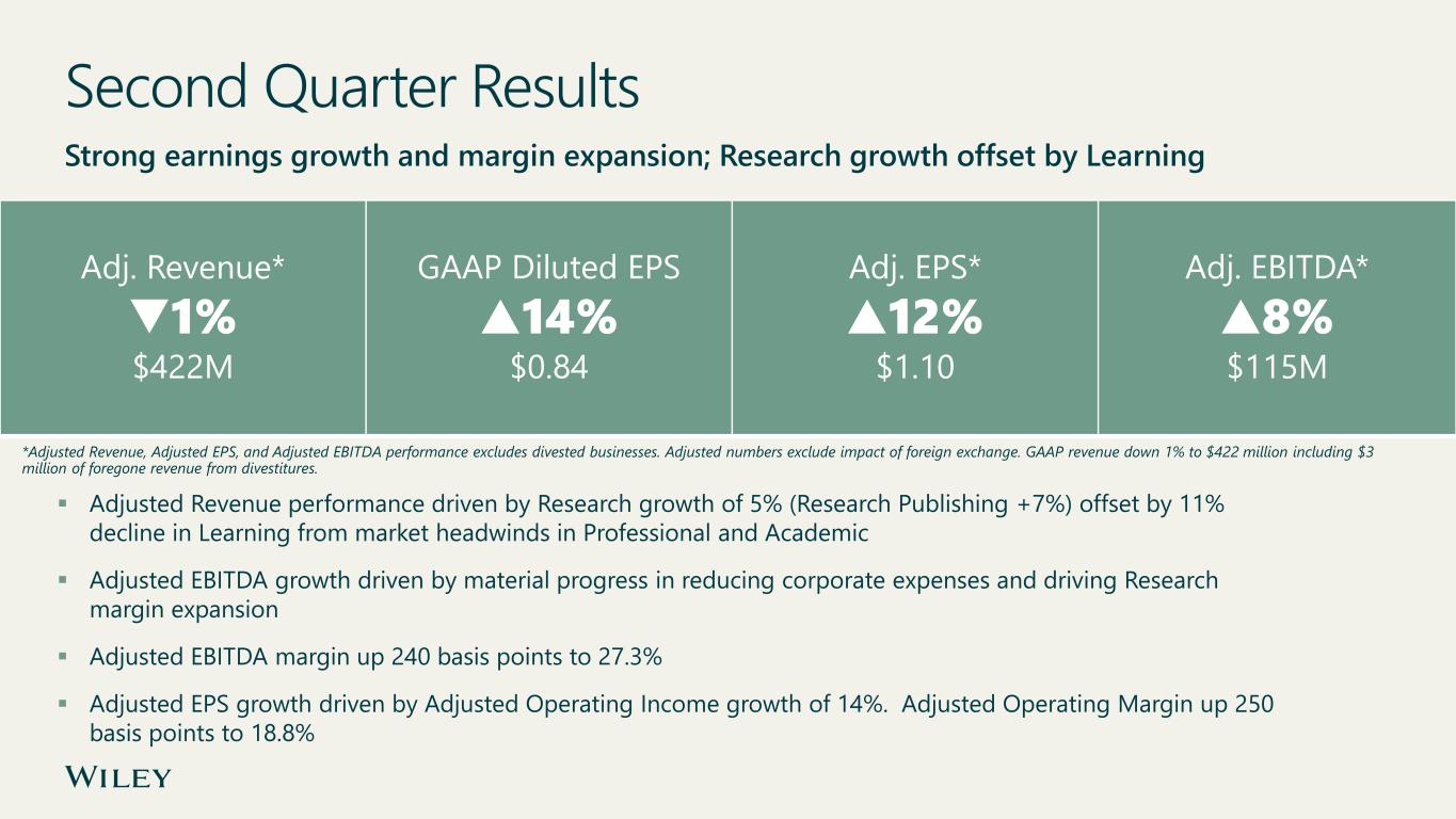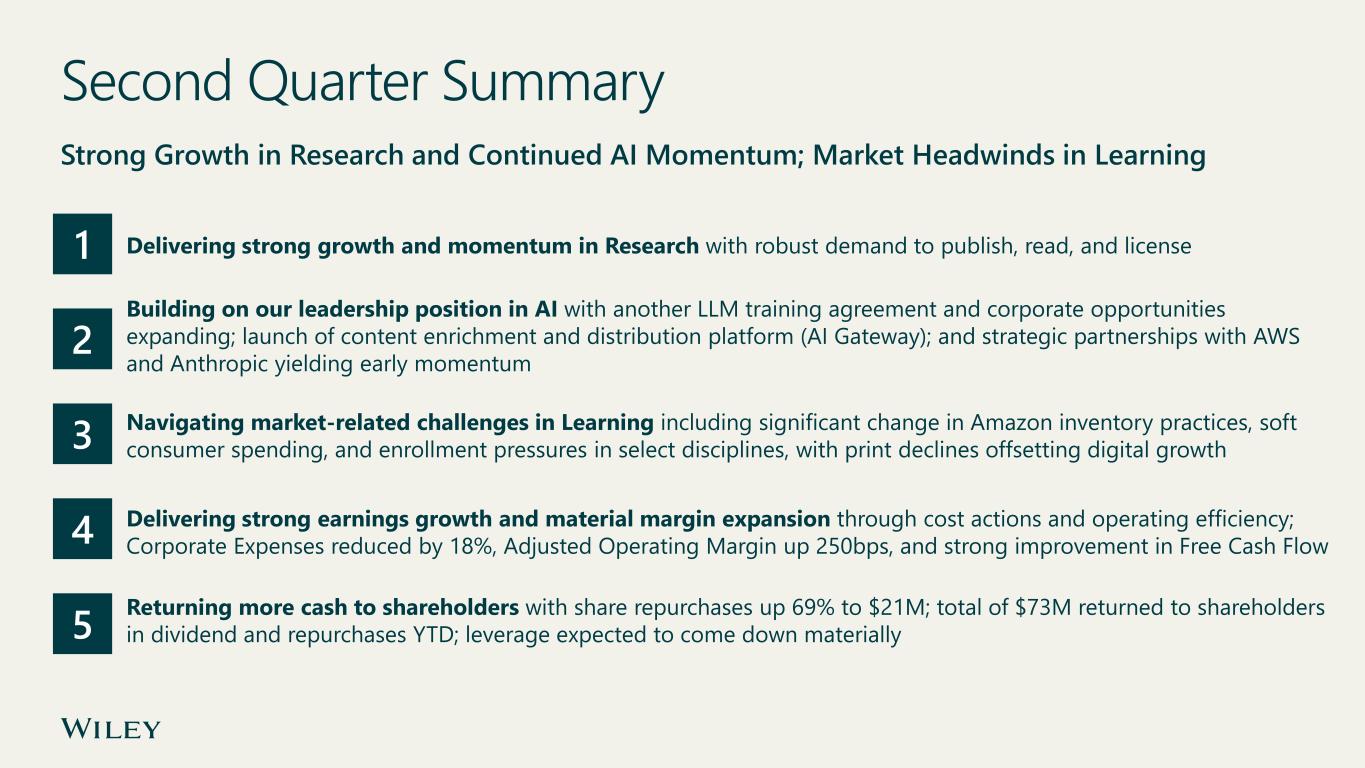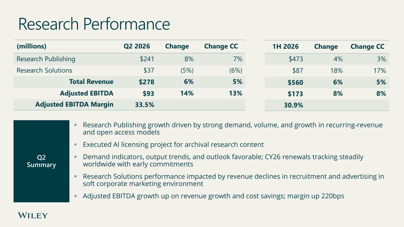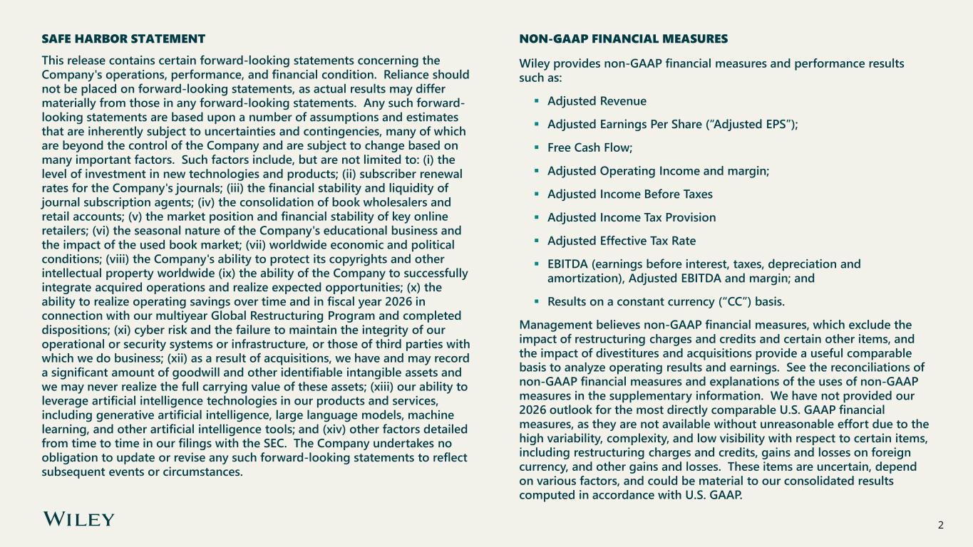 SAFE HARBOR STATEMENT This release contains certain forward-looking statements concerning the Company's operations, performance, and financial condition. Reliance should not be placed on forward-looking statements, as actual results may differ materially from those in any forward-looking statements. Any such forward- looking statements are based upon a number of assumptions and estimates that are inherently subject to uncertainties and contingencies, many of which are beyond the control of the Company and are subject to change based on many important factors. Such factors include, but are not limited to: (i) the level of investment in new technologies and products; (ii) subscriber renewal rates for the Company's journals; (iii) the financial stability and liquidity of journal subscription agents; (iv) the consolidation of book wholesalers and retail accounts; (v) the market position and financial stability of key online retailers; (vi) the seasonal nature of the Company's educational business and the impact of the used book market; (vii) worldwide economic and political conditions; (viii) the Company's ability to protect its copyrights and other intellectual property worldwide (ix) the ability of the Company to successfully integrate acquired operations and realize expected opportunities; (x) the ability to realize operating savings over time and in fiscal year 2026 in connection with our multiyear Global Restructuring Program and completed dispositions; (xi) cyber risk and the failure to maintain the integrity of our operational or security systems or infrastructure, or those of third parties with which we do business; (xii) as a result of acquisitions, we have and may record a significant amount of goodwill and other identifiable intangible assets and we may never realize the full carrying value of these assets; (xiii) our ability to leverage artificial intelligence technologies in our products and services, including generative artificial intelligence, large language models, machine learning, and other artificial intelligence tools; and (xiv) other factors detailed from time to time in our filings with the SEC. The Company undertakes no obligation to update or revise any such forward-looking statements to reflect subsequent events or circumstances. NON-GAAP FINANCIAL MEASURES Wiley provides non-GAAP financial measures and performance results such as: Adjusted Revenue Adjusted Earnings Per Share (“Adjusted EPS”); Free Cash Flow; Adjusted Operating Income and margin; Adjusted Income Before Taxes Adjusted Income Tax Provision Adjusted Effective Tax Rate EBITDA (earnings before interest, taxes, depreciation and amortization), Adjusted EBITDA and margin; and Results on a constant currency (“CC”) basis. Management believes non-GAAP financial measures, which exclude the impact of restructuring charges and credits and certain other items, and the impact of divestitures and acquisitions provide a useful comparable basis to analyze operating results and earnings. See the reconciliations of non-GAAP financial measures and explanations of the uses of non-GAAP measures in the supplementary information. We have not provided our 2026 outlook for the most directly comparable U.S. GAAP financial measures, as they are not available without unreasonable effort due to the high variability, complexity, and low visibility with respect to certain items, including restructuring charges and credits, gains and losses on foreign currency, and other gains and losses. These items are uncertain, depend on various factors, and could be material to our consolidated results computed in accordance with U.S. GAAP. 2