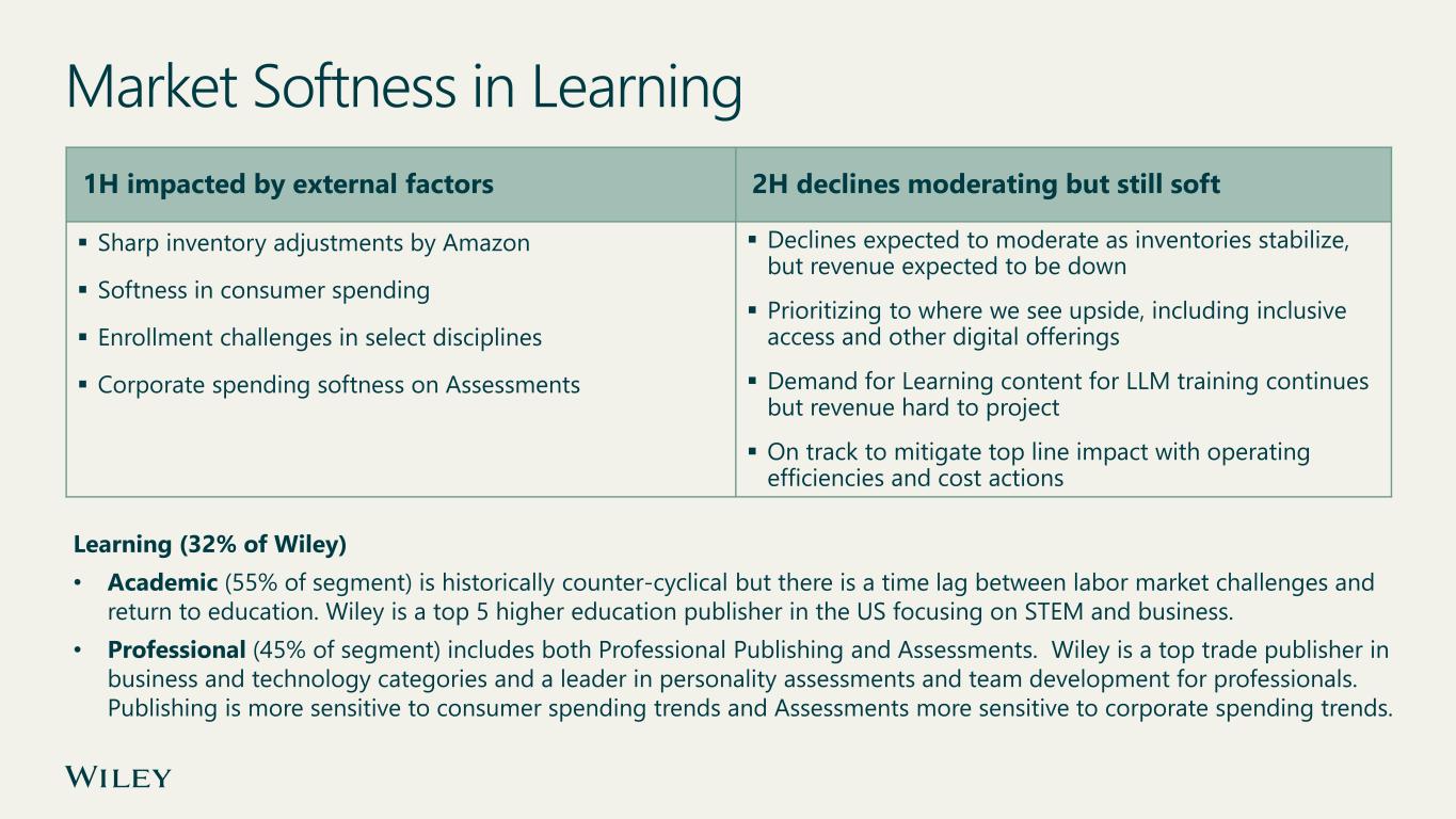 1H impacted by external factors 2H declines moderating but still soft Sharp inventory adjustments by Amazon Softness in consumer spending Enrollment challenges in select disciplines Corporate spending softness on Assessments Declines expected to moderate as inventories stabilize, but revenue expected to be down Prioritizing to where we see upside, including inclusive access and other digital offerings Demand for Learning content for LLM training continues but revenue hard to project On track to mitigate top line impact with operating efficiencies and cost actions Market Softness in Learning Learning (32% of Wiley) • Academic (55% of segment) is historically counter-cyclical but there is a time lag between labor market challenges and return to education. Wiley is a top 5 higher education publisher in the US focusing on STEM and business. • Professional (45% of segment) includes both Professional Publishing and Assessments. Wiley is a top trade publisher in business and technology categories and a leader in personality assessments and team development for professionals. Publishing is more sensitive to consumer spending trends and Assessments more sensitive to corporate spending trends.