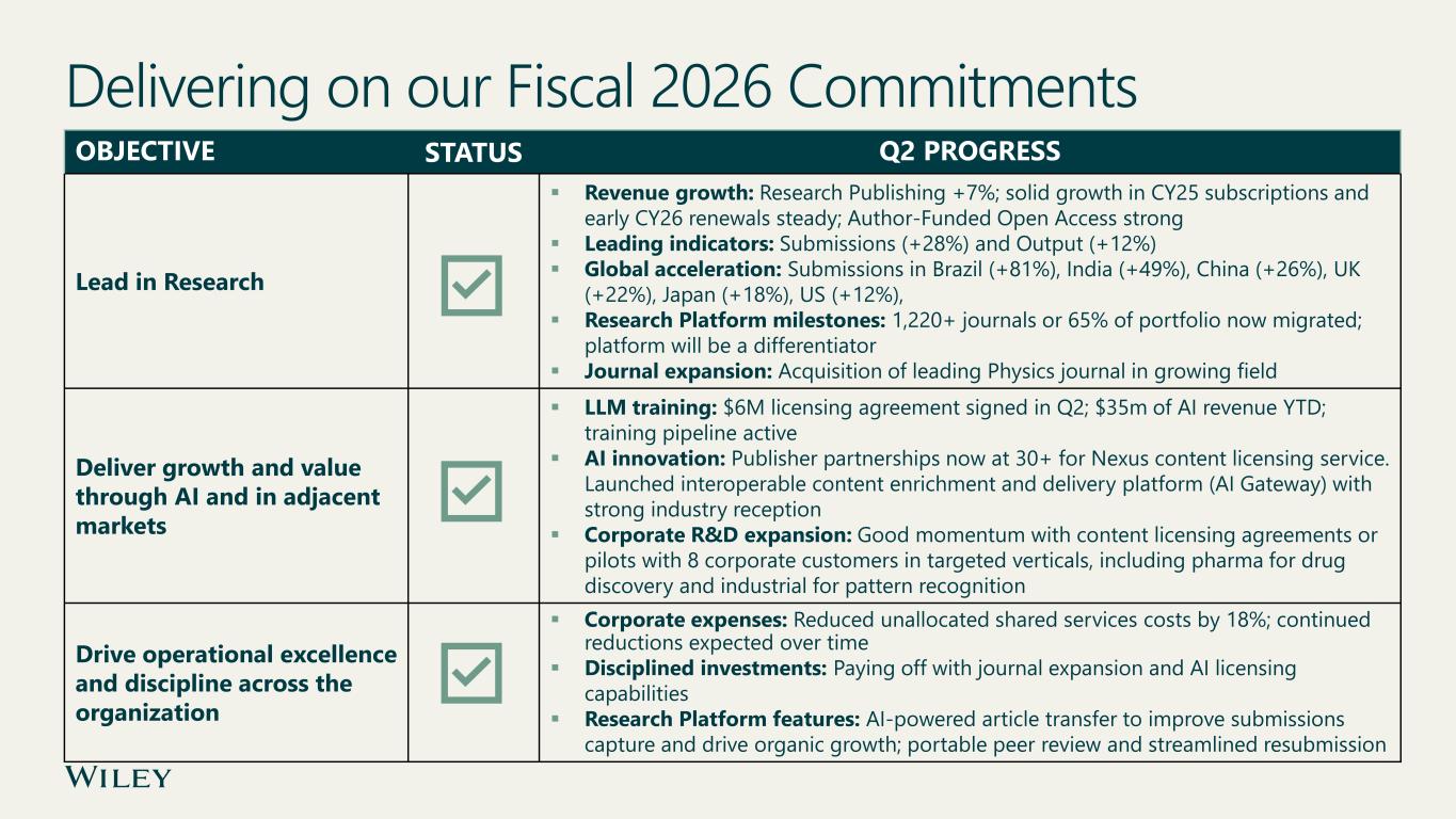 Delivering on our Fiscal 2026 Commitments OBJECTIVE STATUS Q2 PROGRESS Lead in Research Revenue growth: Research Publishing +7%; solid growth in CY25 subscriptions and early CY26 renewals steady; Author-Funded Open Access strong Leading indicators: Submissions (+28%) and Output (+12%) Global acceleration: Submissions in Brazil (+81%), India (+49%), China (+26%), UK (+22%), Japan (+18%), US (+12%), Research Platform milestones: 1,220+ journals or 65% of portfolio now migrated; platform will be a differentiator Journal expansion: Acquisition of leading Physics journal in growing field Deliver growth and value through AI and in adjacent markets LLM training: $6M licensing agreement signed in Q2; $35m of AI revenue YTD; training pipeline active AI innovation: Publisher partnerships now at 30+ for Nexus content licensing service. Launched interoperable content enrichment and delivery platform (AI Gateway) with strong industry reception Corporate R&D expansion: Good momentum with content licensing agreements or pilots with 8 corporate customers in targeted verticals, including pharma for drug discovery and industrial for pattern recognition Drive operational excellence and discipline across the organization Corporate expenses: Reduced unallocated shared services costs by 18%; continued reductions expected over time Disciplined investments: Paying off with journal expansion and AI licensing capabilities Research Platform features: AI-powered article transfer to improve submissions capture and drive organic growth; portable peer review and streamlined resubmission