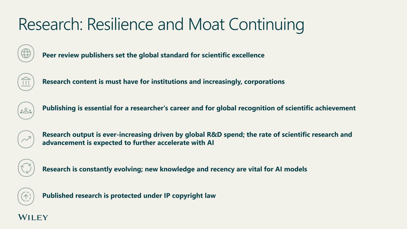 Research: Resilience and Moat Continuing Peer review publishers set the global standard for scientific excellence Research content is must have for institutions and increasingly, corporations Publishing is essential for a researcher's career and for global recognition of scientific achievement Research output is ever-increasing driven by global R&D spend; the rate of scientific research and advancement is expected to further accelerate with AI Research is constantly evolving; new knowledge and recency are vital for AI models Published research is protected under IP copyright law