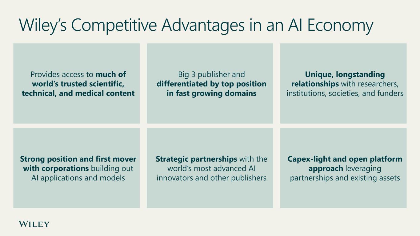 Wiley’s Competitive Advantages in an AI Economy Provides access to much of world’s trusted scientific, technical, and medical content Big 3 publisher and differentiated by top position in fast growing domains Unique, longstanding relationships with researchers, institutions, societies, and funders Strong position and first mover with corporations building out AI applications and models Strategic partnerships with the world’s most advanced AI innovators and other publishers Capex-light and open platform approach leveraging partnerships and existing assets