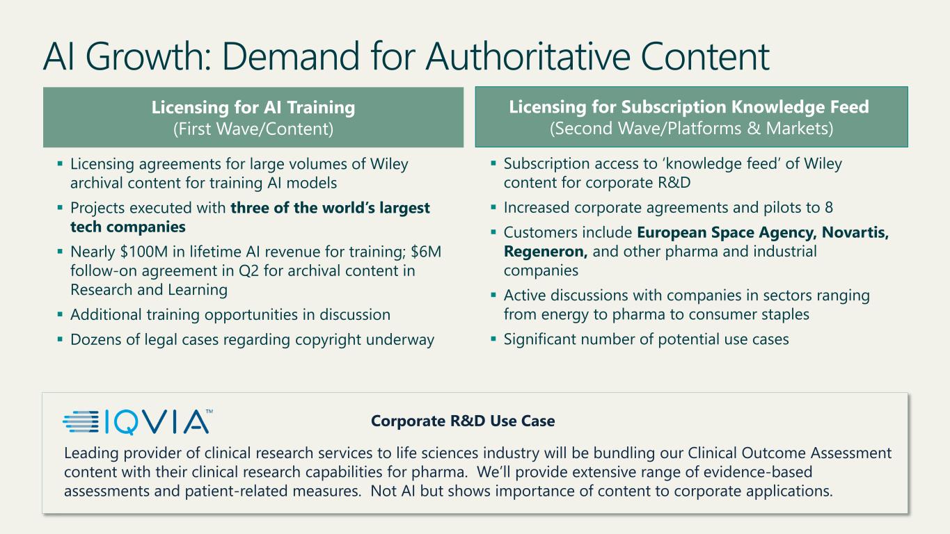 AI Growth: Demand for Authoritative Content Licensing for AI Training (First Wave/Content) Licensing agreements for large volumes of Wiley archival content for training AI models Projects executed with three of the world’s largest tech companies Nearly $100M in lifetime AI revenue for training; $6M follow-on agreement in Q2 for archival content in Research and Learning Additional training opportunities in discussion Dozens of legal cases regarding copyright underway Licensing for Subscription Knowledge Feed (Second Wave/Platforms & Markets) Subscription access to ‘knowledge feed’ of Wiley content for corporate R&D Increased corporate agreements and pilots to 8 Customers include European Space Agency, Novartis, Regeneron, and other pharma and industrial companies Active discussions with companies in sectors ranging from energy to pharma to consumer staples Significant number of potential use cases Leading provider of clinical research services to life sciences industry will be bundling our Clinical Outcome Assessment content with their clinical research capabilities for pharma. We’ll provide extensive range of evidence-based assessments and patient-related measures. Not AI but shows importance of content to corporate applications. Corporate R&D Use Case