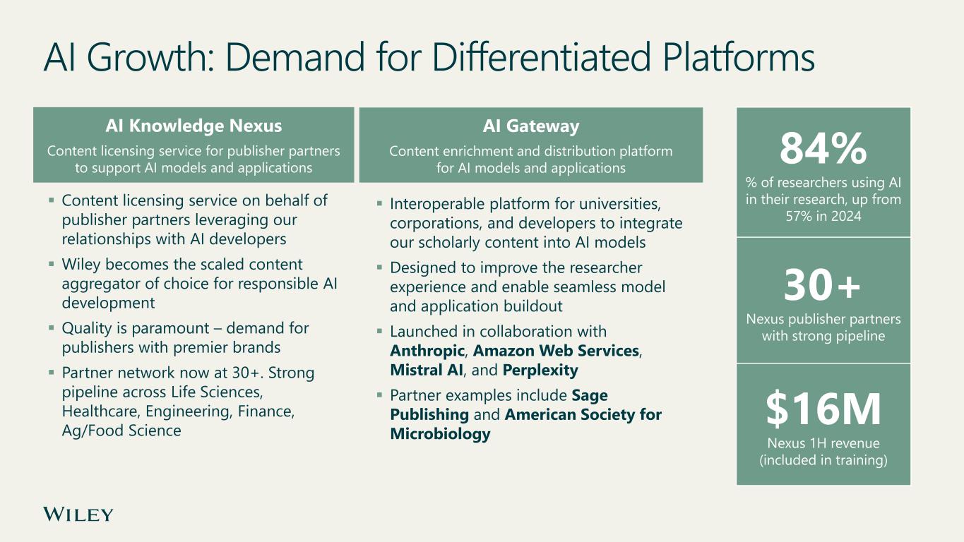 AI Knowledge Nexus Content licensing service for publisher partners to support AI models and applications Content licensing service on behalf of publisher partners leveraging our relationships with AI developers Wiley becomes the scaled content aggregator of choice for responsible AI development Quality is paramount – demand for publishers with premier brands Partner network now at 30+. Strong pipeline across Life Sciences, Healthcare, Engineering, Finance, Ag/Food Science AI Gateway Content enrichment and distribution platform for AI models and applications Interoperable platform for universities, corporations, and developers to integrate our scholarly content into AI models Designed to improve the researcher experience and enable seamless model and application buildout Launched in collaboration with Anthropic, Amazon Web Services, Mistral AI, and Perplexity Partner examples include Sage Publishing and American Society for Microbiology AI Growth: Demand for Differentiated Platforms 84% % of researchers using AI in their research, up from 57% in 2024 30+ Nexus publisher partners with strong pipeline $16M Nexus 1H revenue (included in training)