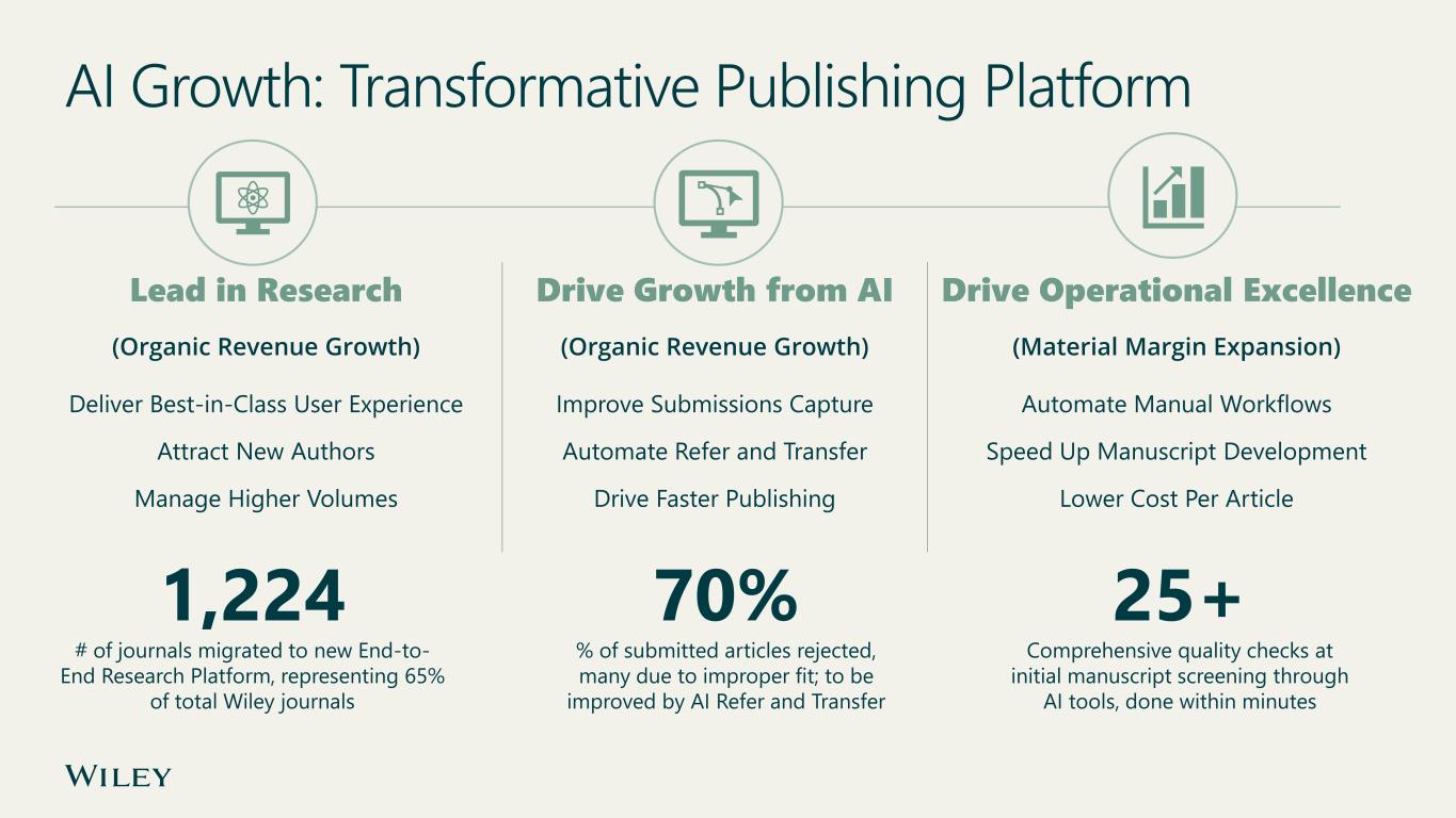 AI Growth: Transformative Publishing Platform Lead in Research (Organic Revenue Growth) Drive Growth from AI (Organic Revenue Growth) Drive Operational Excellence (Material Margin Expansion) Deliver Best-in-Class User Experience Attract New Authors Manage Higher Volumes Improve Submissions Capture Automate Refer and Transfer Drive Faster Publishing Automate Manual Workflows Speed Up Manuscript Development Lower Cost Per Article 1,224 # of journals migrated to new End-to- End Research Platform, representing 65% of total Wiley journals 25+ Comprehensive quality checks at initial manuscript screening through AI tools, done within minutes 70% % of submitted articles rejected, many due to improper fit; to be improved by AI Refer and Transfer