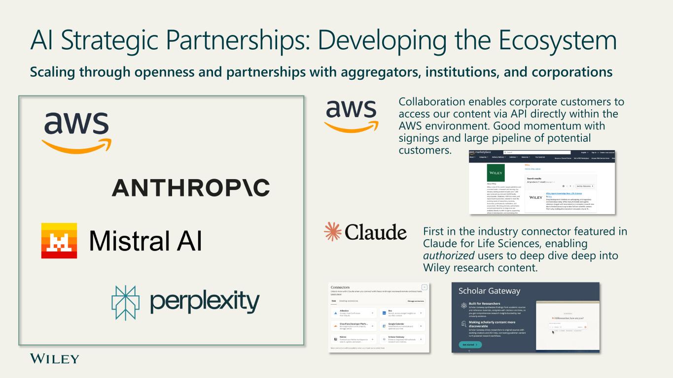 AI Strategic Partnerships: Developing the Ecosystem Scaling through openness and partnerships with aggregators, institutions, and corporations Collaboration enables corporate customers to access our content via API directly within the AWS environment. Good momentum with signings and large pipeline of potential customers. First in the industry connector featured in Claude for Life Sciences, enabling authorized users to deep dive deep into Wiley research content.