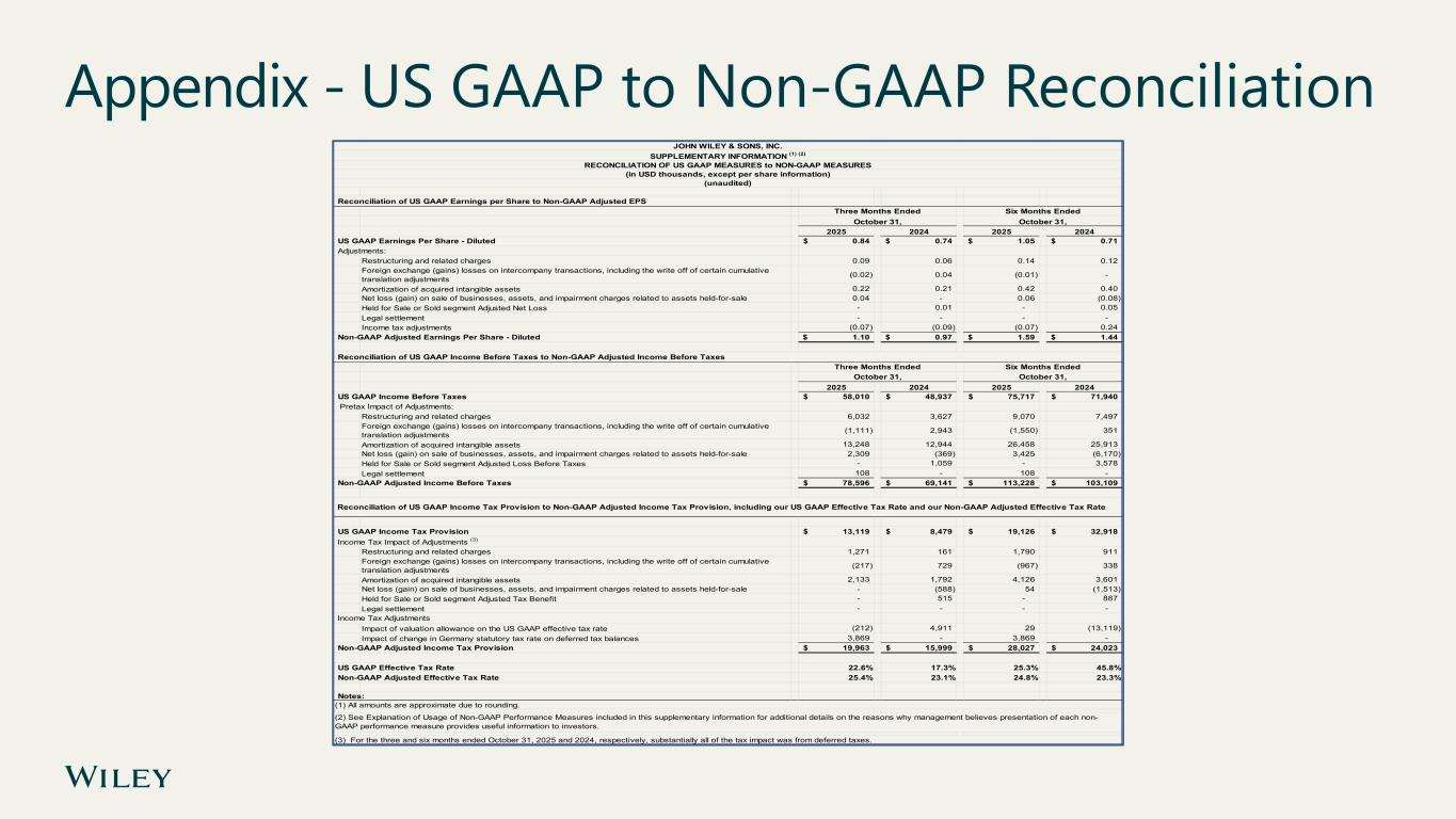 Appendix - US GAAP to Non-GAAP Reconciliation Reconciliation of US GAAP Earnings per Share to Non-GAAP Adjusted EPS 2025 2024 2025 2024 US GAAP Earnings Per Share - Diluted 0.84$ 0.74$ 1.05$ 0.71$ Adjustments: Restructuring and related charges 0.09 0.06 0.14 0.12 Foreign exchange (gains) losses on intercompany transactions, including the write off of certain cumulative translation adjustments (0.02) 0.04 (0.01) - Amortization of acquired intangible assets 0.22 0.21 0.42 0.40 Net loss (gain) on sale of businesses, assets, and impairment charges related to assets held-for-sale 0.04 - 0.06 (0.08) Held for Sale or Sold segment Adjusted Net Loss - 0.01 - 0.05 Legal settlement - - - - Income tax adjustments (0.07) (0.09) (0.07) 0.24 Non-GAAP Adjusted Earnings Per Share - Diluted 1.10$ 0.97$ 1.59$ 1.44$ 2025 2024 2025 2024 US GAAP Income Before Taxes 58,010$ 48,937$ 75,717$ 71,940$ Restructuring and related charges 6,032 3,627 9,070 7,497 Foreign exchange (gains) losses on intercompany transactions, including the write off of certain cumulative translation adjustments (1,111) 2,943 (1,550) 351 Amortization of acquired intangible assets 13,248 12,944 26,458 25,913 Net loss (gain) on sale of businesses, assets, and impairment charges related to assets held-for-sale 2,309 (369) 3,425 (6,170) Held for Sale or Sold segment Adjusted Loss Before Taxes - 1,059 - 3,578 Legal settlement 108 - 108 - Non-GAAP Adjusted Income Before Taxes 78,596$ 69,141$ 113,228$ 103,109$ US GAAP Income Tax Provision 13,119$ 8,479$ 19,126$ 32,918$ Restructuring and related charges 1,271 161 1,790 911 Foreign exchange (gains) losses on intercompany transactions, including the write off of certain cumulative translation adjustments (217) 729 (967) 338 Amortization of acquired intangible assets 2,133 1,792 4,126 3,601 Net loss (gain) on sale of businesses, assets, and impairment charges related to assets held-for-sale - (588) 54 (1,513) Held for Sale or Sold segment Adjusted Tax Benefit - 515 - 887 Legal settlement - - - - Impact of valuation allowance on the US GAAP effective tax rate (212) 4,911 29 (13,119) Impact of change in Germany statutory tax rate on deferred tax balances 3,869 - 3,869 - Non-GAAP Adjusted Income Tax Provision 19,963$ 15,999$ 28,027$ 24,023$ US GAAP Effective Tax Rate 22.6% 17.3% 25.3% 45.8% Non-GAAP Adjusted Effective Tax Rate 25.4% 23.1% 24.8% 23.3% Notes: (3) For the three and six months ended October 31, 2025 and 2024, respectively, substantially all of the tax impact was from deferred taxes. Pretax Impact of Adjustments: Reconciliation of US GAAP Income Tax Provision to Non-GAAP Adjusted Income Tax Provision, including our US GAAP Effective Tax Rate and our Non-GAAP Adjusted Effective Tax Rate Income Tax Impact of Adjustments (3) Income Tax Adjustments (1) All amounts are approximate due to rounding. (2) See Explanation of Usage of Non-GAAP Performance Measures included in this supplementary information for additional details on the reasons why management believes presentation of each non- GAAP performance measure provides useful information to investors. October 31, October 31, October 31, October 31, Reconciliation of US GAAP Income Before Taxes to Non-GAAP Adjusted Income Before Taxes Three Months Ended Six Months Ended Three Months Ended Six Months Ended JOHN WILEY & SONS, INC. SUPPLEMENTARY INFORMATION (1) (2) RECONCILIATION OF US GAAP MEASURES to NON-GAAP MEASURES (in USD thousands, except per share information) (unaudited)
