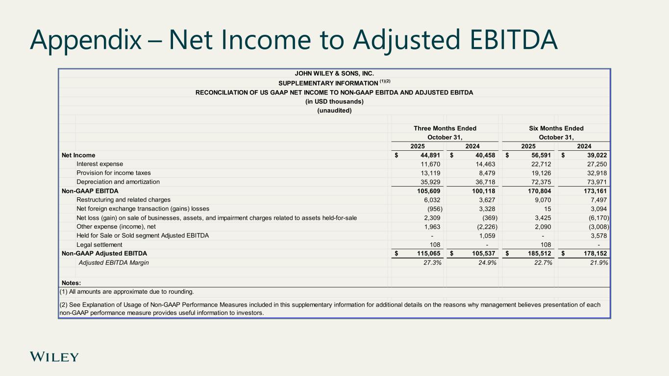 Appendix – Net Income to Adjusted EBITDA 2025 2024 2025 2024 Net Income 44,891$ 40,458$ 56,591$ 39,022$ Interest expense 11,670 14,463 22,712 27,250 Provision for income taxes 13,119 8,479 19,126 32,918 Depreciation and amortization 35,929 36,718 72,375 73,971 Non-GAAP EBITDA 105,609 100,118 170,804 173,161 Restructuring and related charges 6,032 3,627 9,070 7,497 Net foreign exchange transaction (gains) losses (956) 3,328 15 3,094 Net loss (gain) on sale of businesses, assets, and impairment charges related to assets held-for-sale 2,309 (369) 3,425 (6,170) Other expense (income), net 1,963 (2,226) 2,090 (3,008) Held for Sale or Sold segment Adjusted EBITDA - 1,059 - 3,578 Legal settlement 108 - 108 - Non-GAAP Adjusted EBITDA 115,065$ 105,537$ 185,512$ 178,152$ Adjusted EBITDA Margin 27.3% 24.9% 22.7% 21.9% Notes: (1) All amounts are approximate due to rounding. (2) See Explanation of Usage of Non-GAAP Performance Measures included in this supplementary information for additional details on the reasons why management believes presentation of each non-GAAP performance measure provides useful information to investors. October 31, October 31, Three Months Ended Six Months Ended JOHN WILEY & SONS, INC. SUPPLEMENTARY INFORMATION (1)(2) RECONCILIATION OF US GAAP NET INCOME TO NON-GAAP EBITDA AND ADJUSTED EBITDA (in USD thousands) (unaudited)