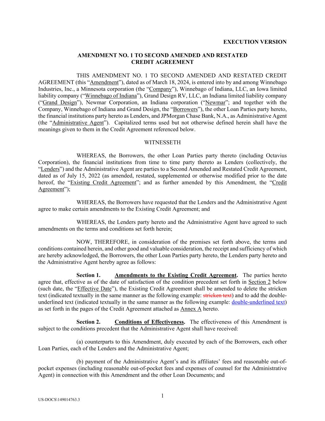 US-DOCS\149014763.3 1 EXECUTION VERSION AMENDMENT NO. 1 TO SECOND AMENDED AND RESTATED CREDIT AGREEMENT THIS AMENDMENT NO. 1 TO SECOND AMENDED AND RESTATED CREDIT AGREEMENT (this “Amendment”), dated as of March 18, 2024, is entered into by and among Winnebago Industries, Inc., a Minnesota corporation (the “Company”), Winnebago of Indiana, LLC, an Iowa limited liability company (“Winnebago of Indiana”), Grand Design RV, LLC, an Indiana limited liability company (“Grand Design”), Newmar Corporation, an Indiana corporation (“Newmar”; and together with the Company, Winnebago of Indiana and Grand Design, the “Borrowers”), the other Loan Parties party hereto, the financial institutions party hereto as Lenders, and JPMorgan Chase Bank, N.A., as Administrative Agent (the “Administrative Agent”). Capitalized terms used but not otherwise defined herein shall have the meanings given to them in the Credit Agreement referenced below. WITNESSETH WHEREAS, the Borrowers, the other Loan Parties party thereto (including Octavius Corporation), the financial institutions from time to time party thereto as Lenders (collectively, the “Lenders”) and the Administrative Agent are parties to a Second Amended and Restated Credit Agreement, dated as of July 15, 2022 (as amended, restated, supplemented or otherwise modified prior to the date hereof, the “Existing Credit Agreement”; and as further amended by this Amendment, the “Credit Agreement”); WHEREAS, the Borrowers have requested that the Lenders and the Administrative Agent agree to make certain amendments to the Existing Credit Agreement; and WHEREAS, the Lenders party hereto and the Administrative Agent have agreed to such amendments on the terms and conditions set forth herein; NOW, THEREFORE, in consideration of the premises set forth above, the terms and conditions contained herein, and other good and valuable consideration, the receipt and sufficiency of which are hereby acknowledged, the Borrowers, the other Loan Parties party hereto, the Lenders party hereto and the Administrative Agent hereby agree as follows: Section 1. Amendments to the Existing Credit Agreement. The parties hereto agree that, effective as of the date of satisfaction of the condition precedent set forth in Section 2 below (such date, the “Effective Date”), the Existing Credit Agreement shall be amended to delete the stricken text (indicated textually in the same manner as the following example: stricken text) and to add the double- underlined text (indicated textually in the same manner as the following example: double-underlined text) as set forth in the pages of the Credit Agreement attached as Annex A hereto. Section 2. Conditions of Effectiveness. The effectiveness of this Amendment is subject to the conditions precedent that the Administrative Agent shall have received: (a) counterparts to this Amendment, duly executed by each of the Borrowers, each other Loan Parties, each of the Lenders and the Administrative Agent; (b) payment of the Administrative Agent’s and its affiliates’ fees and reasonable out-of- pocket expenses (including reasonable out-of-pocket fees and expenses of counsel for the Administrative Agent) in connection with this Amendment and the other Loan Documents; and