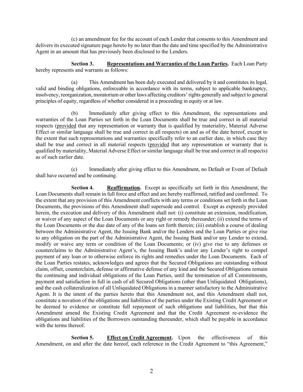 2 (c) an amendment fee for the account of each Lender that consents to this Amendment and delivers its executed signature page hereto by no later than the date and time specified by the Administrative Agent in an amount that has previously been disclosed to the Lenders. Section 3. Representations and Warranties of the Loan Parties. Each Loan Party hereby represents and warrants as follows: (a) This Amendment has been duly executed and delivered by it and constitutes its legal, valid and binding obligations, enforceable in accordance with its terms, subject to applicable bankruptcy, insolvency, reorganization, moratorium or other laws affecting creditors’ rights generally and subject to general principles of equity, regardless of whether considered in a proceeding in equity or at law. (b) Immediately after giving effect to this Amendment, the representations and warranties of the Loan Parties set forth in the Loan Documents shall be true and correct in all material respects (provided that any representation or warranty that is qualified by materiality, Material Adverse Effect or similar language shall be true and correct in all respects) on and as of the date hereof, except to the extent that such representations and warranties specifically refer to an earlier date, in which case they shall be true and correct in all material respects (provided that any representation or warranty that is qualified by materiality, Material Adverse Effect or similar language shall be true and correct in all respects) as of such earlier date. (c) Immediately after giving effect to this Amendment, no Default or Event of Default shall have occurred and be continuing. Section 4. Reaffirmation. Except as specifically set forth in this Amendment, the Loan Documents shall remain in full force and effect and are hereby reaffirmed, ratified and confirmed. To the extent that any provision of this Amendment conflicts with any terms or conditions set forth in the Loan Documents, the provisions of this Amendment shall supersede and control. Except as expressly provided herein, the execution and delivery of this Amendment shall not: (i) constitute an extension, modification, or waiver of any aspect of the Loan Documents or any right or remedy thereunder; (ii) extend the terms of the Loan Documents or the due date of any of the loans set forth therein; (iii) establish a course of dealing between the Administrative Agent, the Issuing Bank and/or the Lenders and the Loan Parties or give rise to any obligation on the part of the Administrative Agent, the Issuing Bank and/or any Lender to extend, modify or waive any term or condition of the Loan Documents; or (iv) give rise to any defenses or counterclaims to the Administrative Agent’s, the Issuing Bank’s and/or any Lender’s right to compel payment of any loan or to otherwise enforce its rights and remedies under the Loan Documents. Each of the Loan Parties restates, acknowledges and agrees that the Secured Obligations are outstanding without claim, offset, counterclaim, defense or affirmative defense of any kind and the Secured Obligations remain the continuing and individual obligations of the Loan Parties, until the termination of all Commitments, payment and satisfaction in full in cash of all Secured Obligations (other than Unliquidated Obligations), and the cash collateralization of all Unliquidated Obligations in a manner satisfactory to the Administrative Agent. It is the intent of the parties hereto that this Amendment not, and this Amendment shall not, constitute a novation of the obligations and liabilities of the parties under the Existing Credit Agreement or be deemed to evidence or constitute full repayment of such obligations and liabilities, but that this Amendment amend the Existing Credit Agreement and that the Credit Agreement re-evidence the obligations and liabilities of the Borrowers outstanding thereunder, which shall be payable in accordance with the terms thereof. Section 5. Effect on Credit Agreement. Upon the effectiveness of this Amendment, on and after the date hereof, each reference in the Credit Agreement to “this Agreement,”