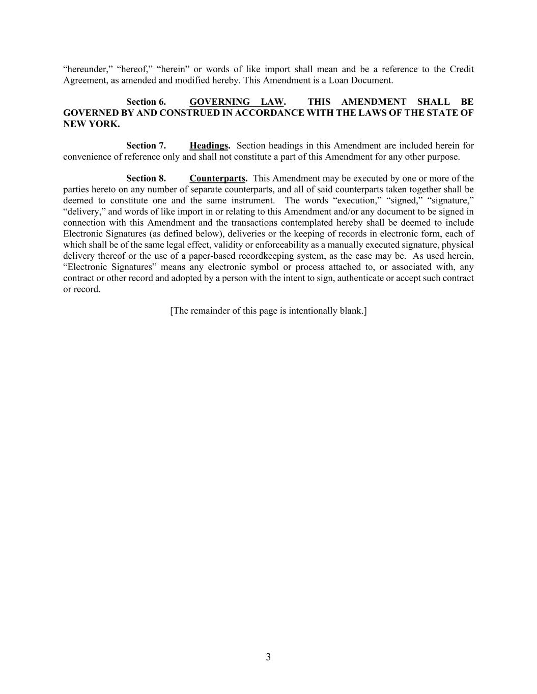 3 “hereunder,” “hereof,” “herein” or words of like import shall mean and be a reference to the Credit Agreement, as amended and modified hereby. This Amendment is a Loan Document. Section 6. GOVERNING LAW. THIS AMENDMENT SHALL BE GOVERNED BY AND CONSTRUED IN ACCORDANCE WITH THE LAWS OF THE STATE OF NEW YORK. Section 7. Headings. Section headings in this Amendment are included herein for convenience of reference only and shall not constitute a part of this Amendment for any other purpose. Section 8. Counterparts. This Amendment may be executed by one or more of the parties hereto on any number of separate counterparts, and all of said counterparts taken together shall be deemed to constitute one and the same instrument. The words “execution,” “signed,” “signature,” “delivery,” and words of like import in or relating to this Amendment and/or any document to be signed in connection with this Amendment and the transactions contemplated hereby shall be deemed to include Electronic Signatures (as defined below), deliveries or the keeping of records in electronic form, each of which shall be of the same legal effect, validity or enforceability as a manually executed signature, physical delivery thereof or the use of a paper-based recordkeeping system, as the case may be. As used herein, “Electronic Signatures” means any electronic symbol or process attached to, or associated with, any contract or other record and adopted by a person with the intent to sign, authenticate or accept such contract or record. [The remainder of this page is intentionally blank.]
