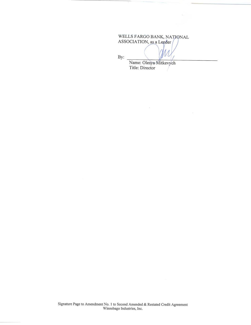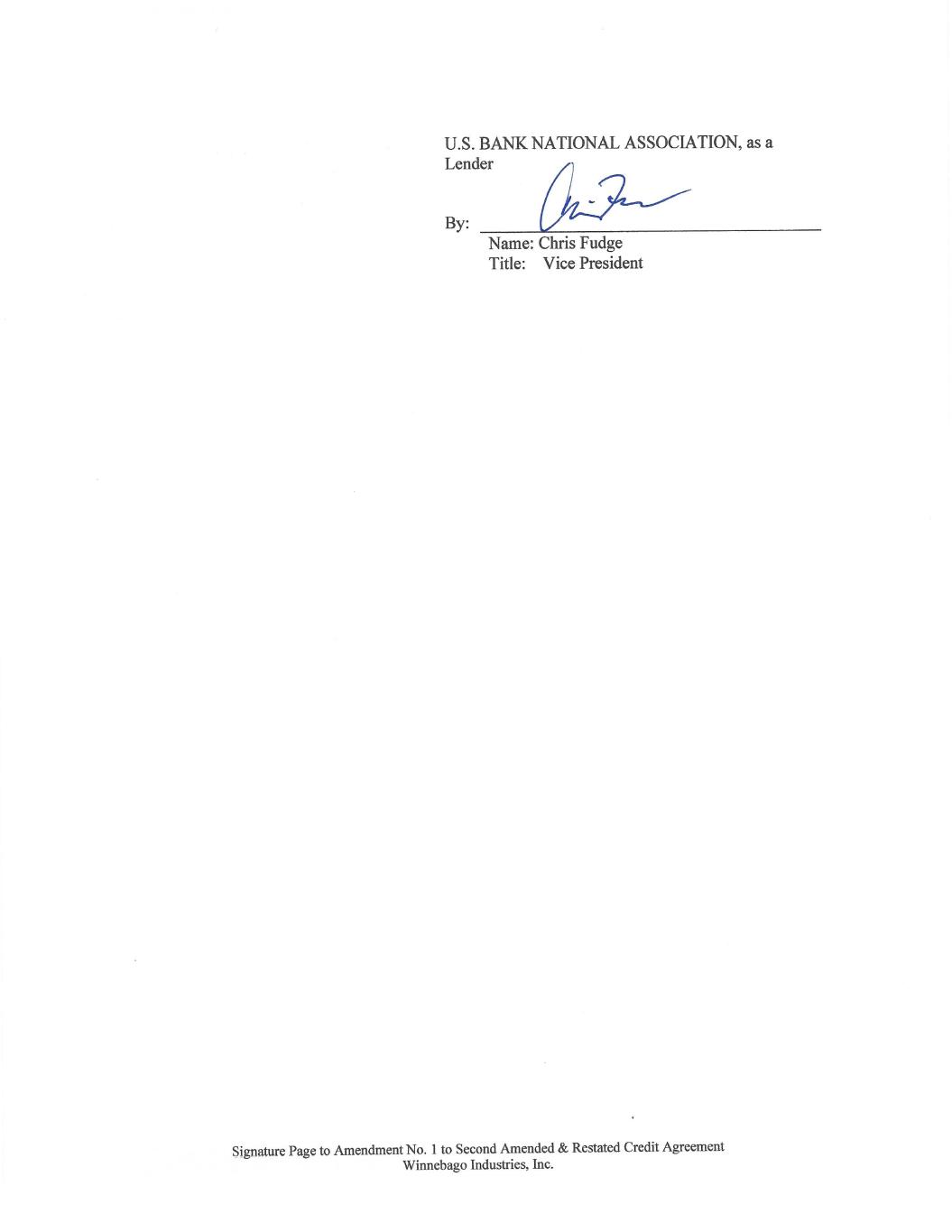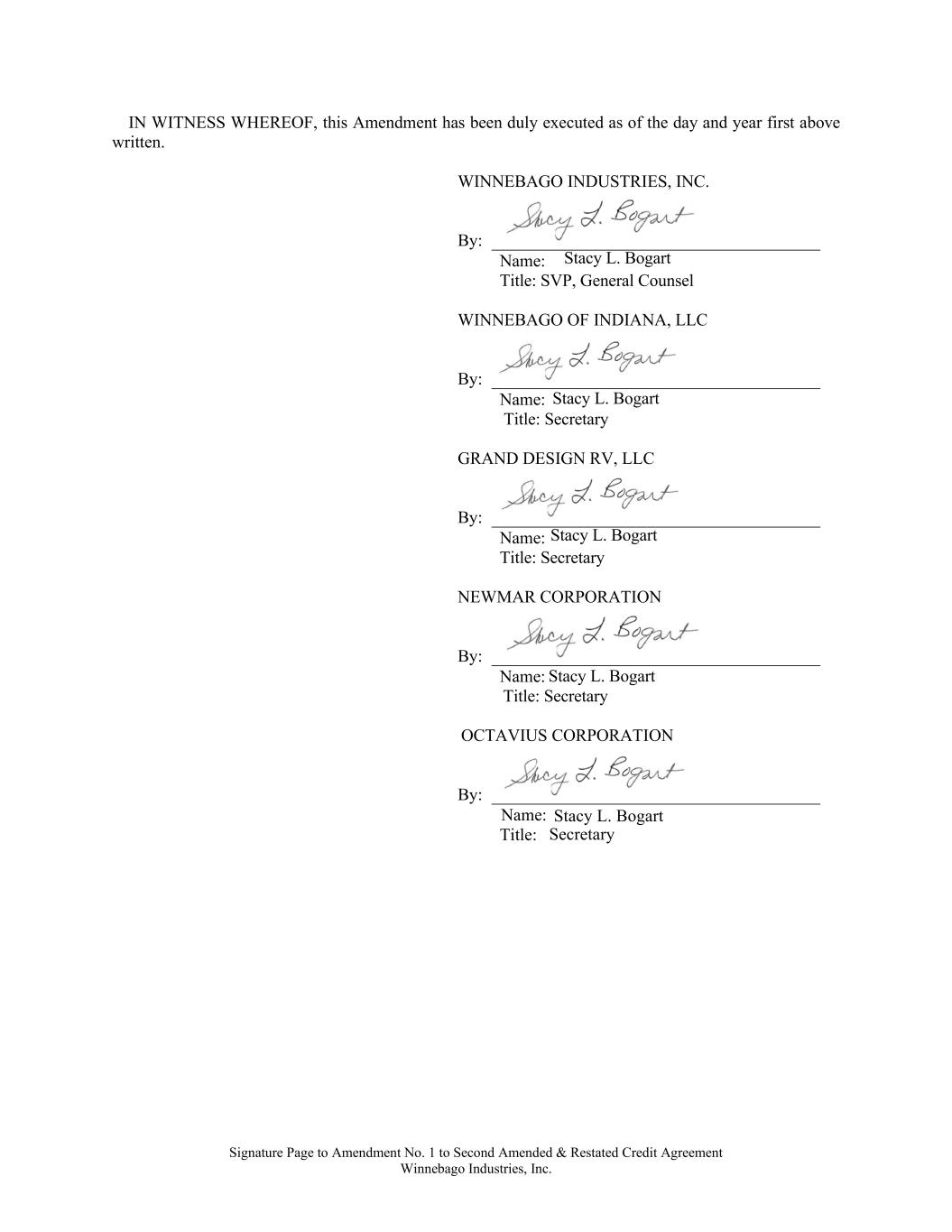 Signature Page to Amendment No. 1 to Second Amended & Restated Credit Agreement Winnebago Industries, Inc. IN WITNESS WHEREOF, this Amendment has been duly executed as of the day and year first above written. WINNEBAGO INDUSTRIES, INC. By: Name: Title: SVP, General Counsel WINNEBAGO OF INDIANA, LLC By: Name: Title: Secretary GRAND DESIGN RV, LLC By: Name: Title: Secretary NEWMAR CORPORATION By: Name: Title: Secretary OCTAVIUS CORPORATION By: Name: Title: Stacy L. Bogart Stacy L. Bogart Stacy L. Bogart Stacy L. Bogart Stacy L. Bogart Secretary