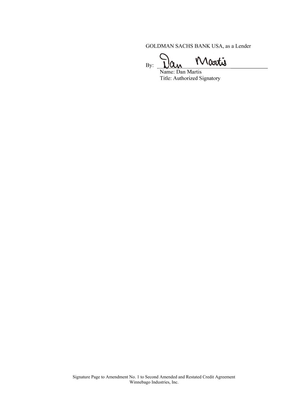 Signature Page to Amendment No. 1 to Second Amended and Restated Credit Agreement Winnebago Industries, Inc. GOLDMAN SACHS BANK USA, as a Lender By: Name: Title: