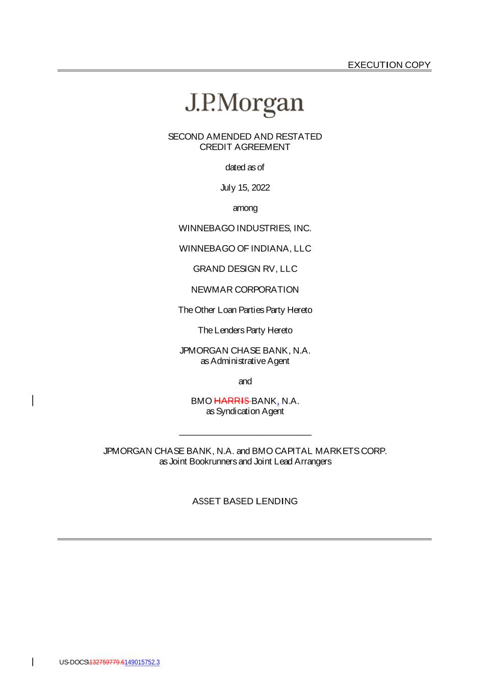 US-DOCS\132759779.6149015752.3 EXECUTION COPY SECOND AMENDED AND RESTATED CREDIT AGREEMENT dated as of July 15, 2022 among WINNEBAGO INDUSTRIES, INC. WINNEBAGO OF INDIANA, LLC GRAND DESIGN RV, LLC NEWMAR CORPORATION The Other Loan Parties Party Hereto The Lenders Party Hereto JPMORGAN CHASE BANK, N.A. as Administrative Agent and BMO HARRIS BANK, N.A. as Syndication Agent _____________________________ JPMORGAN CHASE BANK, N.A. and BMO CAPITAL MARKETS CORP. as Joint Bookrunners and Joint Lead Arrangers ASSET BASED LENDING