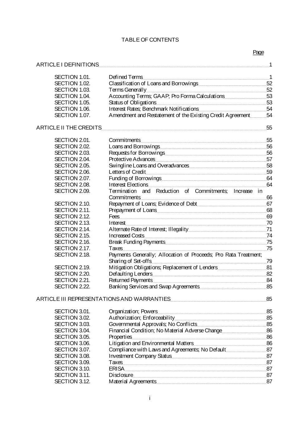 TABLE OF CONTENTS Page ARTICLE I DEFINITIONS 1 SECTION 1.01. Defined Terms 1 SECTION 1.02. Classification of Loans and Borrowings 52 SECTION 1.03. Terms Generally 52 SECTION 1.04. Accounting Terms; GAAP; Pro Forma Calculations 53 SECTION 1.05. Status of Obligations 53 SECTION 1.06. Interest Rates; Benchmark Notifications 54 SECTION 1.07. Amendment and Restatement of the Existing Credit Agreement 54 ARTICLE II THE CREDITS 55 SECTION 2.01. Commitments 55 SECTION 2.02. Loans and Borrowings 56 SECTION 2.03. Requests for Borrowings 56 SECTION 2.04. Protective Advances 57 SECTION 2.05. Swingline Loans and Overadvances 58 SECTION 2.06. Letters of Credit 59 SECTION 2.07. Funding of Borrowings 64 SECTION 2.08. Interest Elections 64 SECTION 2.09. Termination and Reduction of Commitments; Increase in Commitments 66 SECTION 2.10. Repayment of Loans; Evidence of Debt 67 SECTION 2.11. Prepayment of Loans 68 SECTION 2.12. Fees 69 SECTION 2.13. Interest 70 SECTION 2.14. Alternate Rate of Interest; Illegality 71 SECTION 2.15. Increased Costs 74 SECTION 2.16. Break Funding Payments 75 SECTION 2.17. Taxes 75 SECTION 2.18. Payments Generally; Allocation of Proceeds; Pro Rata Treatment; Sharing of Set-offs 79 SECTION 2.19. Mitigation Obligations; Replacement of Lenders 81 SECTION 2.20. Defaulting Lenders 82 SECTION 2.21. Returned Payments 84 SECTION 2.22. Banking Services and Swap Agreements 85 ARTICLE III REPRESENTATIONS AND WARRANTIES 85 SECTION 3.01. Organization; Powers 85 SECTION 3.02. Authorization; Enforceability 85 SECTION 3.03. Governmental Approvals; No Conflicts 85 SECTION 3.04. Financial Condition; No Material Adverse Change 86 SECTION 3.05. Properties 86 SECTION 3.06. Litigation and Environmental Matters 86 SECTION 3.07. Compliance with Laws and Agreements; No Default 87 SECTION 3.08. Investment Company Status 87 SECTION 3.09. Taxes 87 SECTION 3.10. ERISA 87 SECTION 3.11. Disclosure 87 SECTION 3.12. Material Agreements 87 i