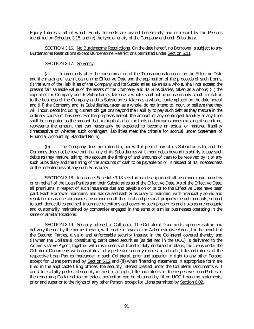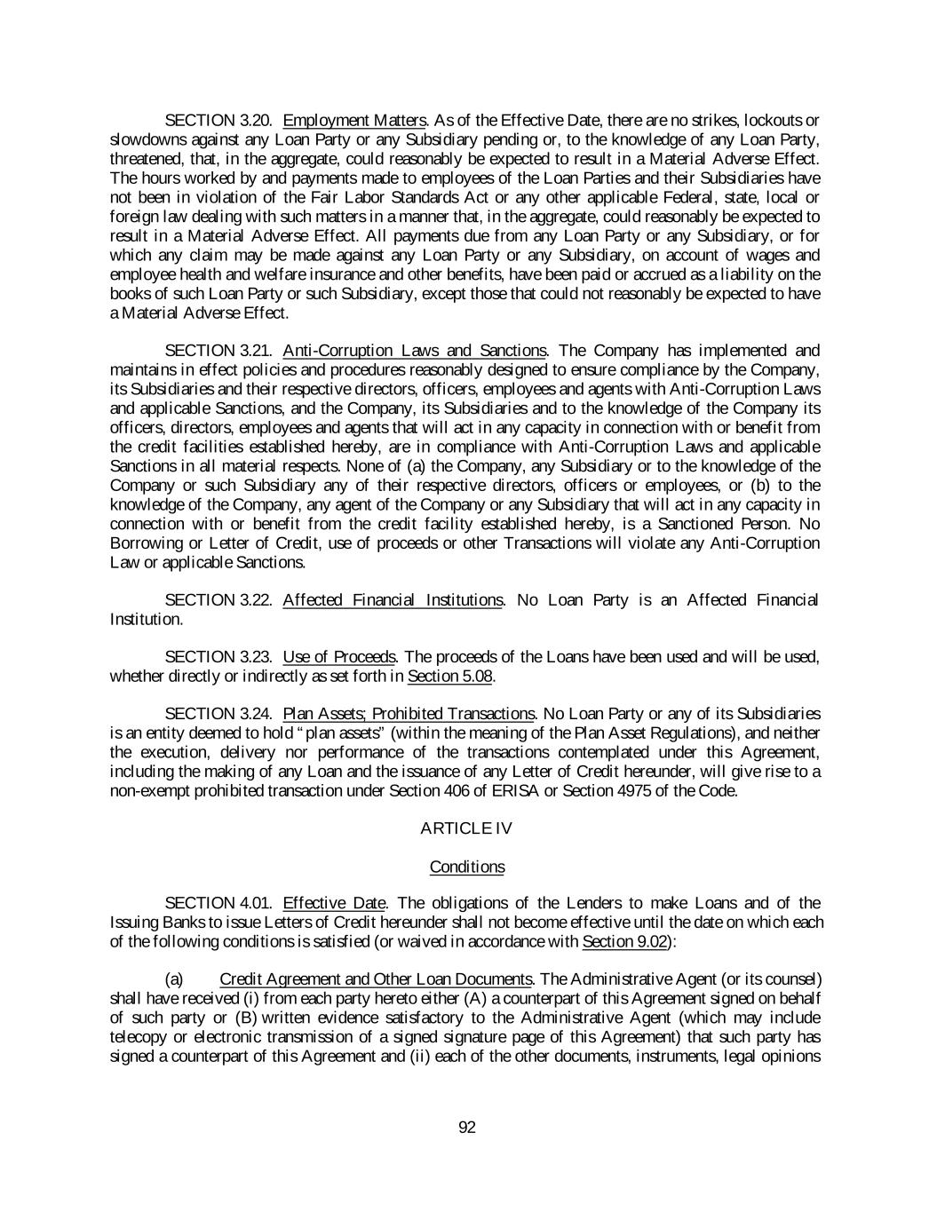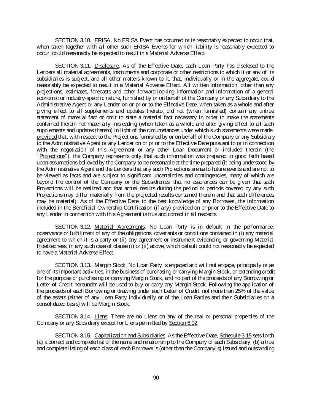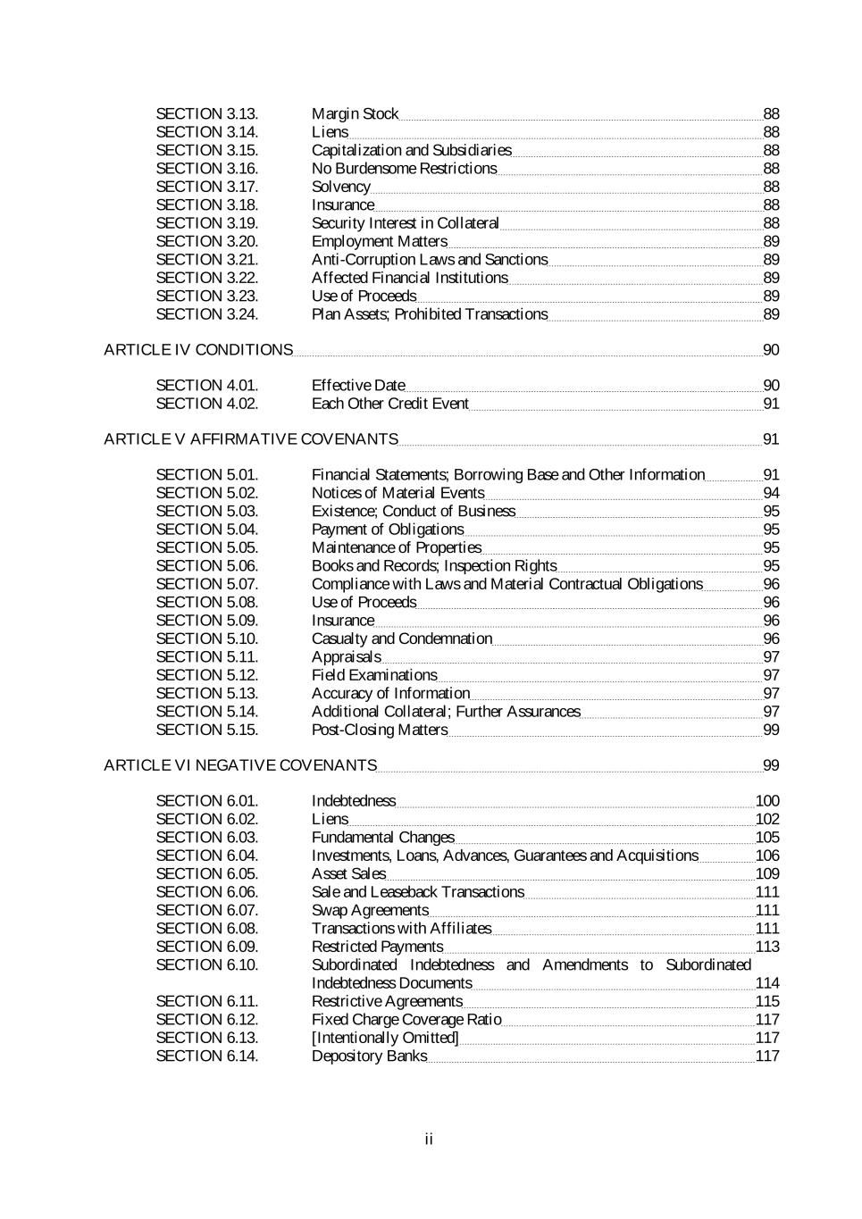 SECTION 3.13. Margin Stock 88 SECTION 3.14. Liens 88 SECTION 3.15. Capitalization and Subsidiaries 88 SECTION 3.16. No Burdensome Restrictions 88 SECTION 3.17. Solvency 88 SECTION 3.18. Insurance 88 SECTION 3.19. Security Interest in Collateral 88 SECTION 3.20. Employment Matters 89 SECTION 3.21. Anti-Corruption Laws and Sanctions 89 SECTION 3.22. Affected Financial Institutions 89 SECTION 3.23. Use of Proceeds 89 SECTION 3.24. Plan Assets; Prohibited Transactions 89 ARTICLE IV CONDITIONS 90 SECTION 4.01. Effective Date 90 SECTION 4.02. Each Other Credit Event 91 ARTICLE V AFFIRMATIVE COVENANTS 91 SECTION 5.01. Financial Statements; Borrowing Base and Other Information 91 SECTION 5.02. Notices of Material Events 94 SECTION 5.03. Existence; Conduct of Business 95 SECTION 5.04. Payment of Obligations 95 SECTION 5.05. Maintenance of Properties 95 SECTION 5.06. Books and Records; Inspection Rights 95 SECTION 5.07. Compliance with Laws and Material Contractual Obligations 96 SECTION 5.08. Use of Proceeds 96 SECTION 5.09. Insurance 96 SECTION 5.10. Casualty and Condemnation 96 SECTION 5.11. Appraisals 97 SECTION 5.12. Field Examinations 97 SECTION 5.13. Accuracy of Information 97 SECTION 5.14. Additional Collateral; Further Assurances 97 SECTION 5.15. Post-Closing Matters 99 ARTICLE VI NEGATIVE COVENANTS 99 SECTION 6.01. Indebtedness 100 SECTION 6.02. Liens 102 SECTION 6.03. Fundamental Changes 105 SECTION 6.04. Investments, Loans, Advances, Guarantees and Acquisitions 106 SECTION 6.05. Asset Sales 109 SECTION 6.06. Sale and Leaseback Transactions 111 SECTION 6.07. Swap Agreements 111 SECTION 6.08. Transactions with Affiliates 111 SECTION 6.09. Restricted Payments 113 SECTION 6.10. Subordinated Indebtedness and Amendments to Subordinated Indebtedness Documents 114 SECTION 6.11. Restrictive Agreements 115 SECTION 6.12. Fixed Charge Coverage Ratio 117 SECTION 6.13. [Intentionally Omitted] 117 SECTION 6.14. Depository Banks 117 ii