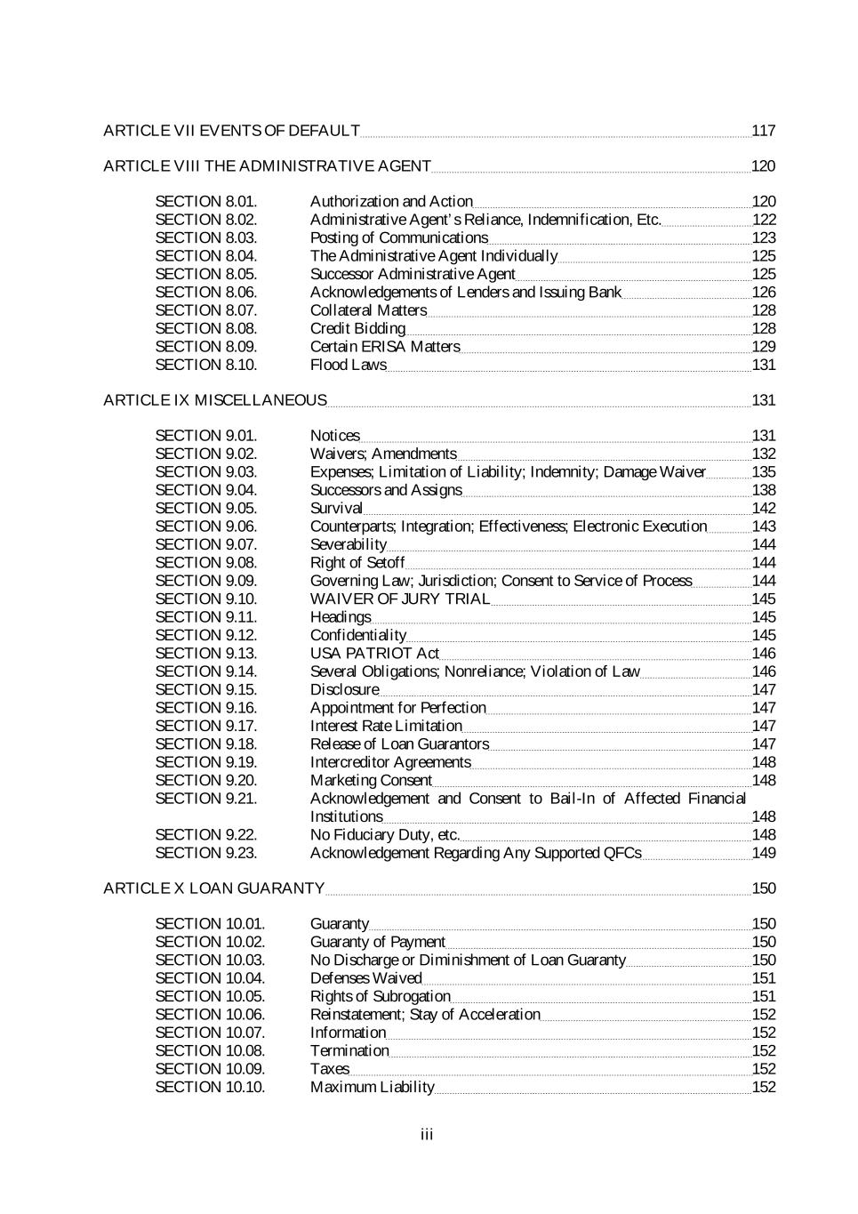 ARTICLE VII EVENTS OF DEFAULT 117 ARTICLE VIII THE ADMINISTRATIVE AGENT 120 SECTION 8.01. Authorization and Action 120 SECTION 8.02. Administrative Agent’s Reliance, Indemnification, Etc. 122 SECTION 8.03. Posting of Communications 123 SECTION 8.04. The Administrative Agent Individually 125 SECTION 8.05. Successor Administrative Agent 125 SECTION 8.06. Acknowledgements of Lenders and Issuing Bank 126 SECTION 8.07. Collateral Matters 128 SECTION 8.08. Credit Bidding 128 SECTION 8.09. Certain ERISA Matters 129 SECTION 8.10. Flood Laws 131 ARTICLE IX MISCELLANEOUS 131 SECTION 9.01. Notices 131 SECTION 9.02. Waivers; Amendments 132 SECTION 9.03. Expenses; Limitation of Liability; Indemnity; Damage Waiver 135 SECTION 9.04. Successors and Assigns 138 SECTION 9.05. Survival 142 SECTION 9.06. Counterparts; Integration; Effectiveness; Electronic Execution 143 SECTION 9.07. Severability 144 SECTION 9.08. Right of Setoff 144 SECTION 9.09. Governing Law; Jurisdiction; Consent to Service of Process 144 SECTION 9.10. WAIVER OF JURY TRIAL 145 SECTION 9.11. Headings 145 SECTION 9.12. Confidentiality 145 SECTION 9.13. USA PATRIOT Act 146 SECTION 9.14. Several Obligations; Nonreliance; Violation of Law 146 SECTION 9.15. Disclosure 147 SECTION 9.16. Appointment for Perfection 147 SECTION 9.17. Interest Rate Limitation 147 SECTION 9.18. Release of Loan Guarantors 147 SECTION 9.19. Intercreditor Agreements 148 SECTION 9.20. Marketing Consent 148 SECTION 9.21. Acknowledgement and Consent to Bail-In of Affected Financial Institutions 148 SECTION 9.22. No Fiduciary Duty, etc. 148 SECTION 9.23. Acknowledgement Regarding Any Supported QFCs 149 ARTICLE X LOAN GUARANTY 150 SECTION 10.01. Guaranty 150 SECTION 10.02. Guaranty of Payment 150 SECTION 10.03. No Discharge or Diminishment of Loan Guaranty 150 SECTION 10.04. Defenses Waived 151 SECTION 10.05. Rights of Subrogation 151 SECTION 10.06. Reinstatement; Stay of Acceleration 152 SECTION 10.07. Information 152 SECTION 10.08. Termination 152 SECTION 10.09. Taxes 152 SECTION 10.10. Maximum Liability 152 iii