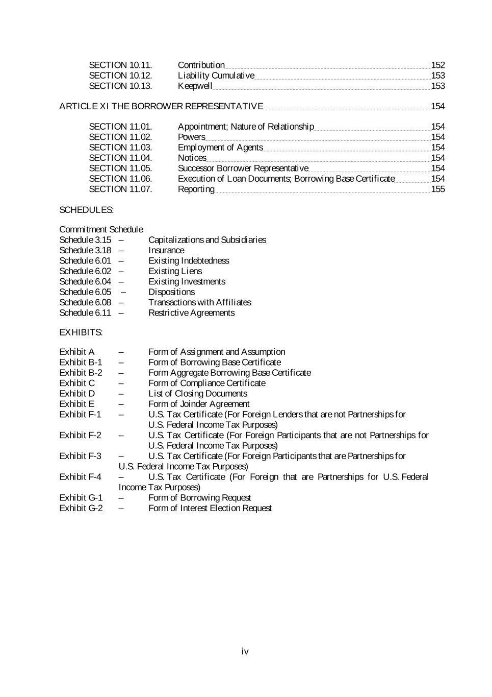 SECTION 10.11. Contribution 152 SECTION 10.12. Liability Cumulative 153 SECTION 10.13. Keepwell 153 ARTICLE XI THE BORROWER REPRESENTATIVE 154 SECTION 11.01. Appointment; Nature of Relationship 154 SECTION 11.02. Powers 154 SECTION 11.03. Employment of Agents 154 SECTION 11.04. Notices 154 SECTION 11.05. Successor Borrower Representative 154 SECTION 11.06. Execution of Loan Documents; Borrowing Base Certificate 154 SECTION 11.07. Reporting 155 SCHEDULES: Commitment Schedule Schedule 3.15 – Capitalizations and Subsidiaries Schedule 3.18 – Insurance Schedule 6.01 – Existing Indebtedness Schedule 6.02 – Existing Liens Schedule 6.04 – Existing Investments Schedule 6.05 – Dispositions Schedule 6.08 – Transactions with Affiliates Schedule 6.11 – Restrictive Agreements EXHIBITS: Exhibit A – Form of Assignment and Assumption Exhibit B-1 – Form of Borrowing Base Certificate Exhibit B-2 – Form Aggregate Borrowing Base Certificate Exhibit C – Form of Compliance Certificate Exhibit D – List of Closing Documents Exhibit E – Form of Joinder Agreement Exhibit F-1 – U.S. Tax Certificate (For Foreign Lenders that are not Partnerships for U.S. Federal Income Tax Purposes) Exhibit F-2 – U.S. Tax Certificate (For Foreign Participants that are not Partnerships for U.S. Federal Income Tax Purposes) Exhibit F-3 – U.S. Tax Certificate (For Foreign Participants that are Partnerships for U.S. Federal Income Tax Purposes) Exhibit F-4 – U.S. Tax Certificate (For Foreign that are Partnerships for U.S. Federal Income Tax Purposes) Exhibit G-1 – Form of Borrowing Request Exhibit G-2 – Form of Interest Election Request iv